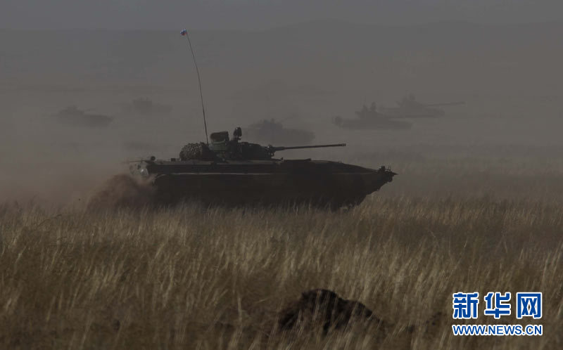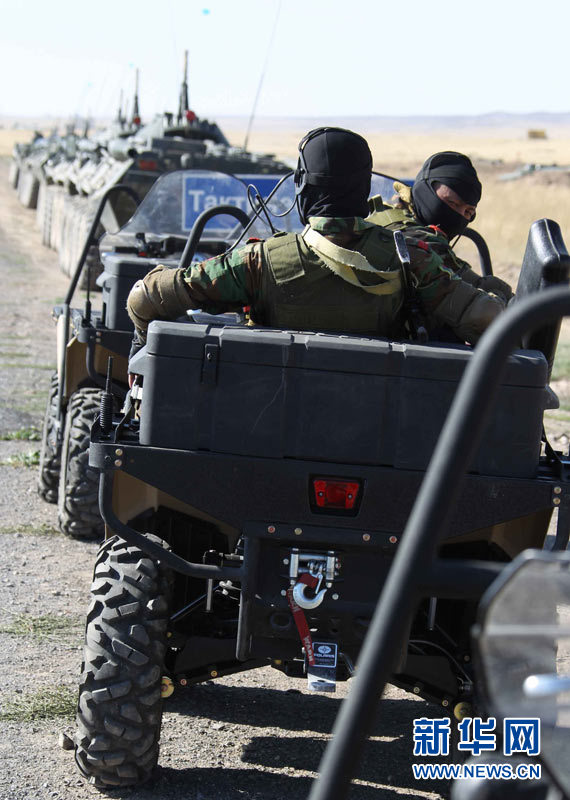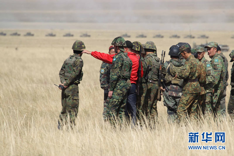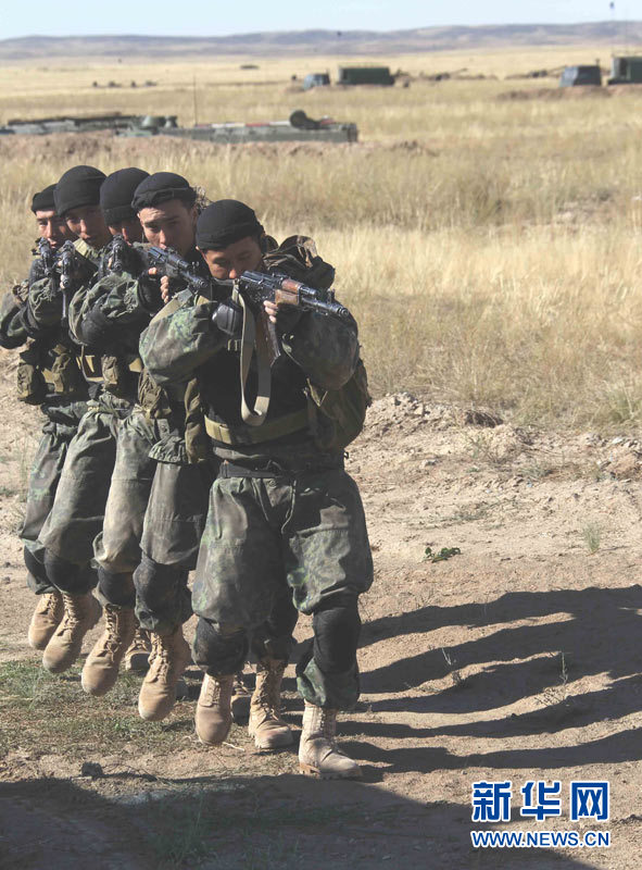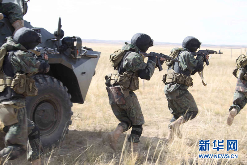 9月15日,参加上海合作组织成员国武装力量联合反恐军事演习的哈萨克斯坦、中国、吉尔吉斯斯坦、俄罗斯、塔吉克斯坦五国参演部队成功举行第二次实兵合练。王建民 摄 图片来源:新华网