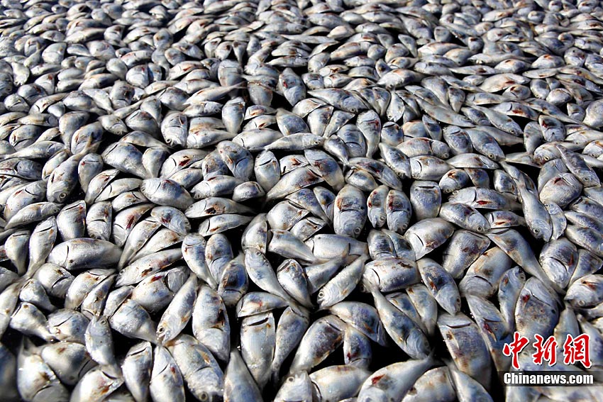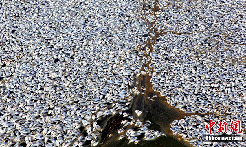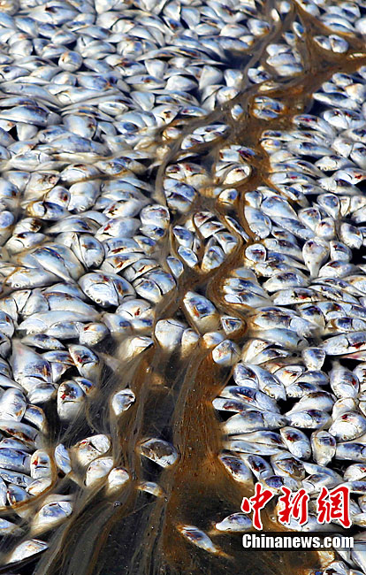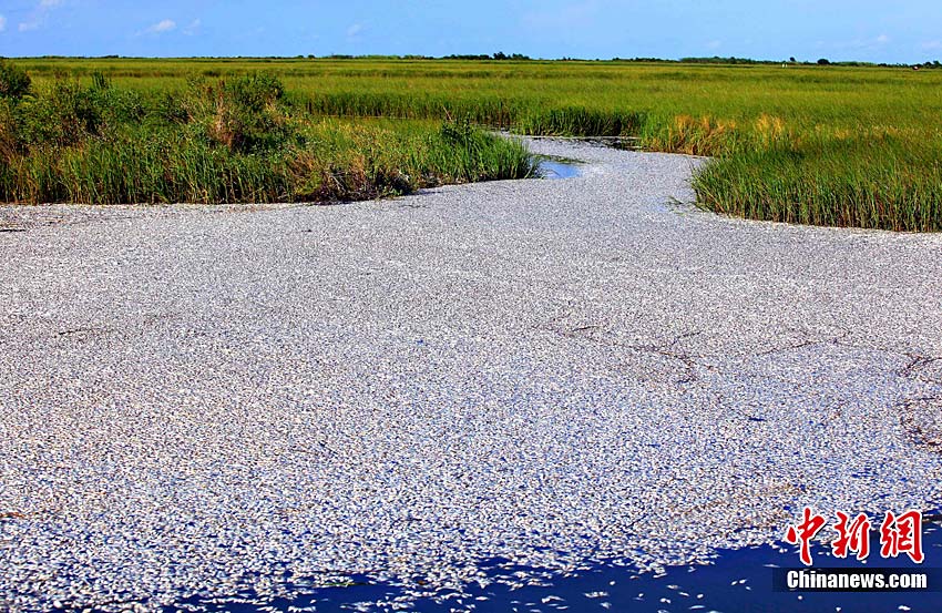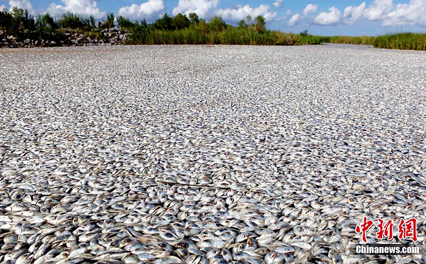 近日,人们在美国路易斯安那州普拉克明县发现大批漂浮在缓流溪上的死亡鱼群。目前,这批鱼的死亡原因不明,但怀疑与墨西哥湾漏油事件有关。图为9月10日在美国路易斯安那州普拉克明县拍摄的大批死鱼。