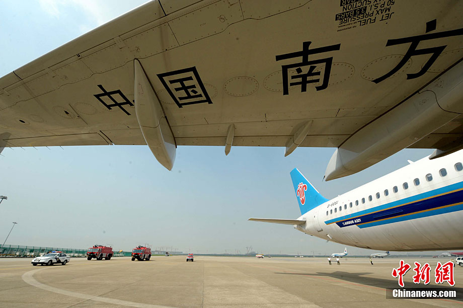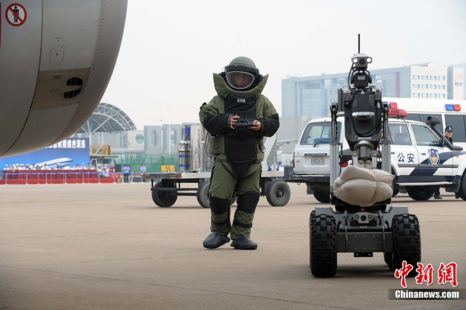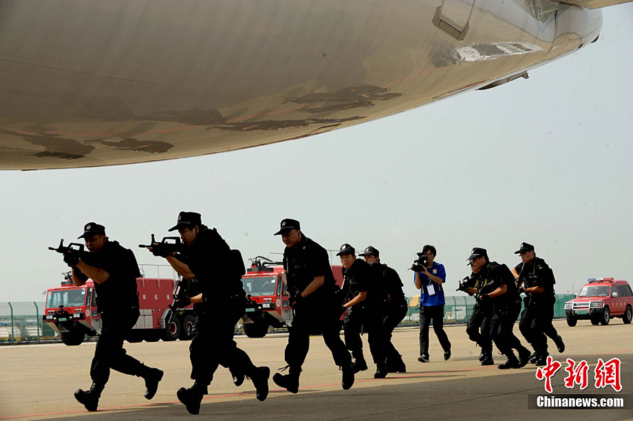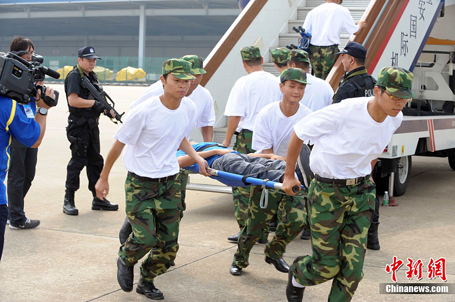 9月16日,深圳宝安国际机场举行反恐应急演习,模拟一架客机被歹徒劫持后,特警、防爆、消防、医疗救护等各方面展开营救,在短时间内解救人质处理事故。中新社记者 陈文 摄
