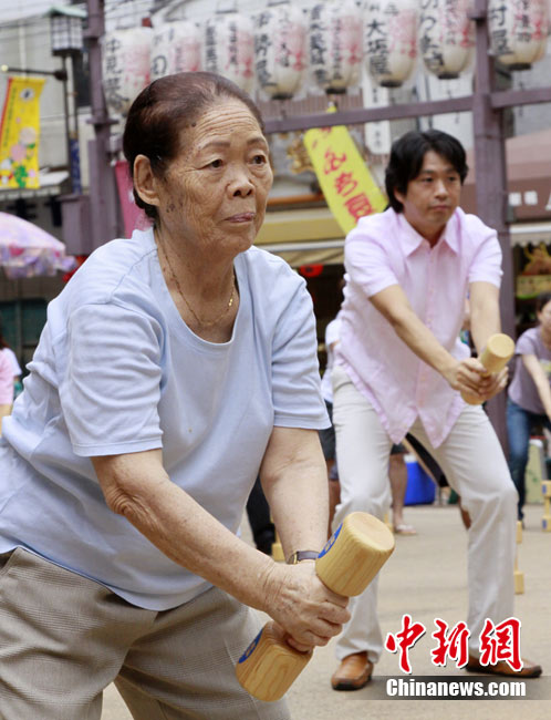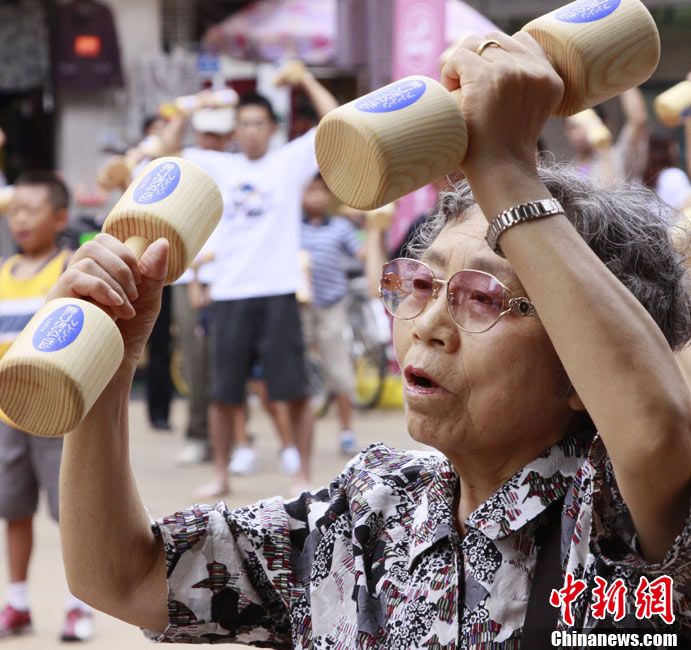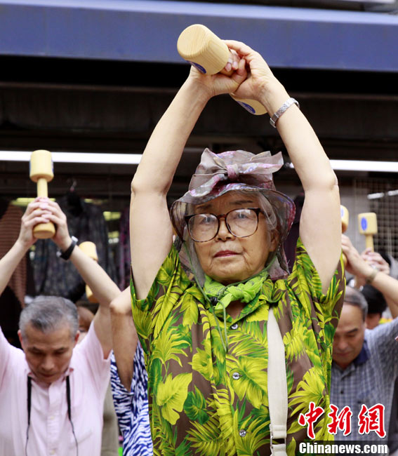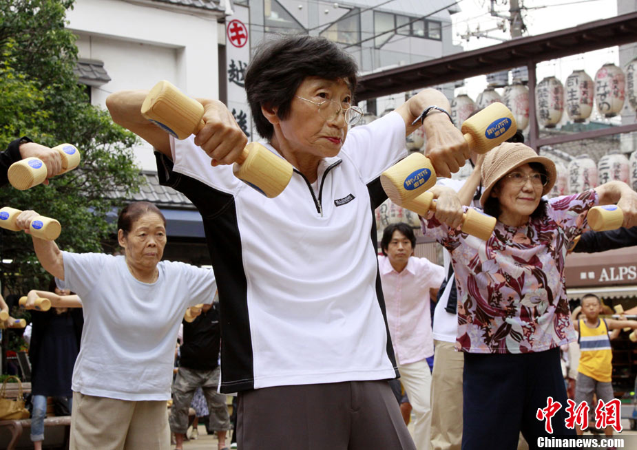 9月20日是日本的“敬老日”,众多民众在这一天来到东京的一家寺院,集体做哑铃操迎接“敬老日”。