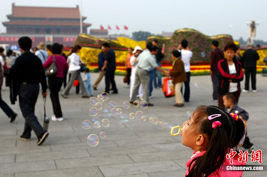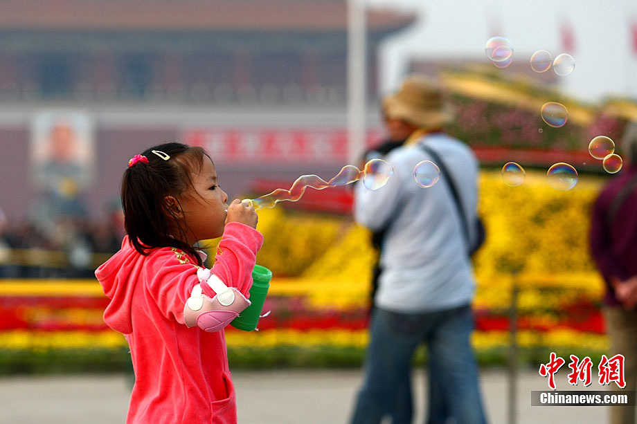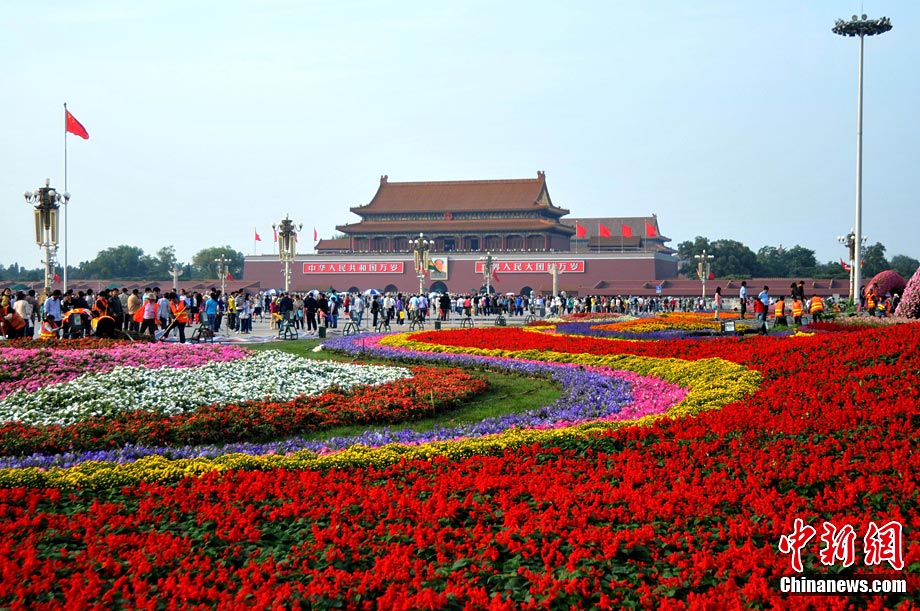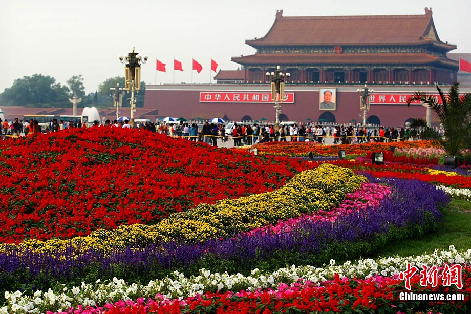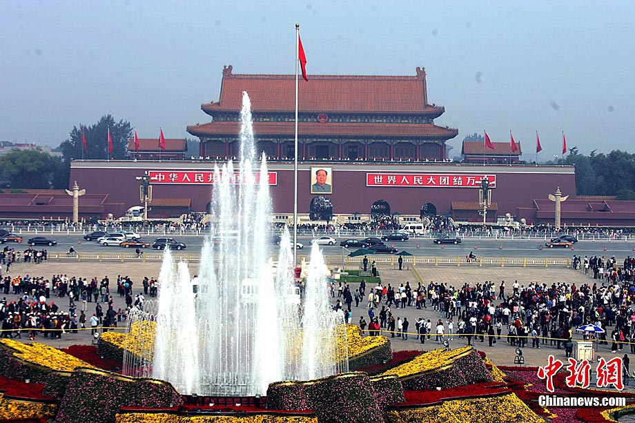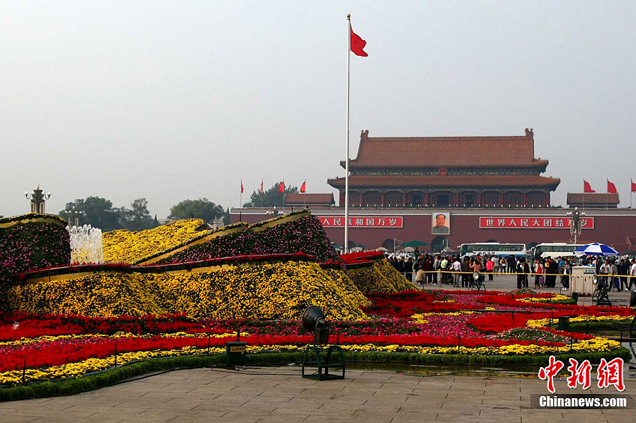 9月25日上午,北京市园林绿化局宣传中心对外宣布,为了迎接建国61周年,天安门广场主题为“花开盛世”的中心水法花坛已经安装完毕并正式亮相。吴间道 摄 图片来源:cnsphoto
