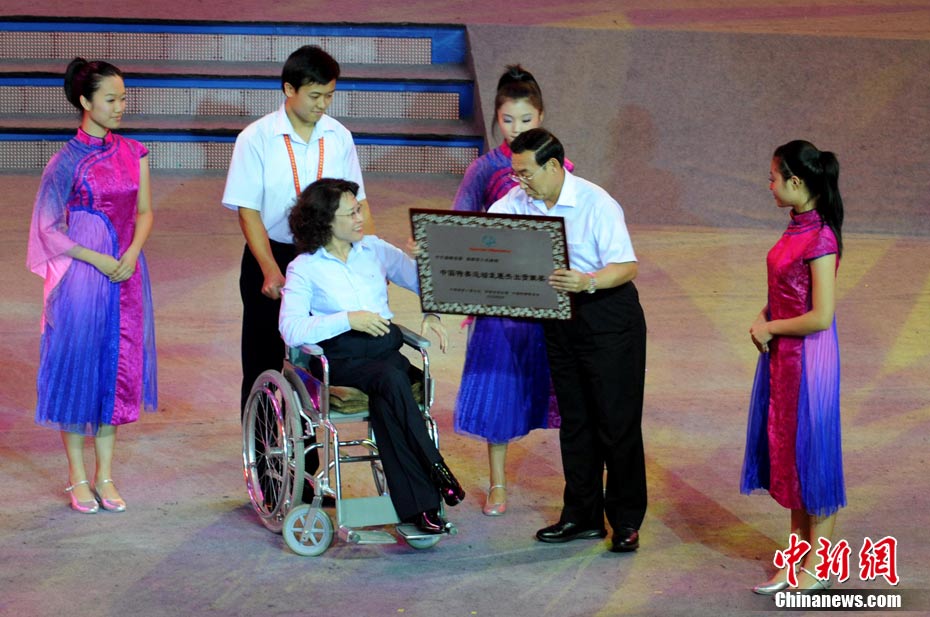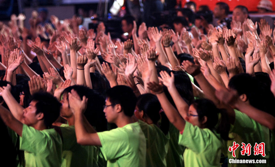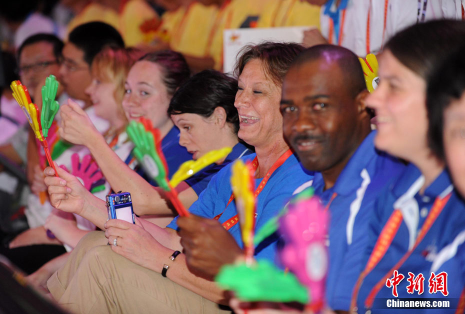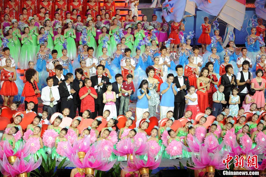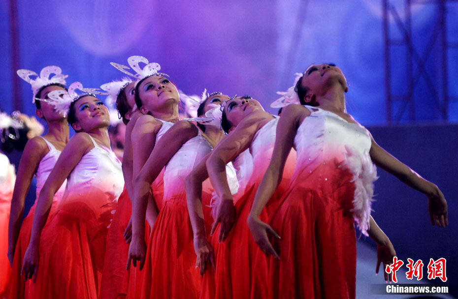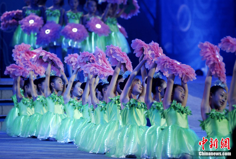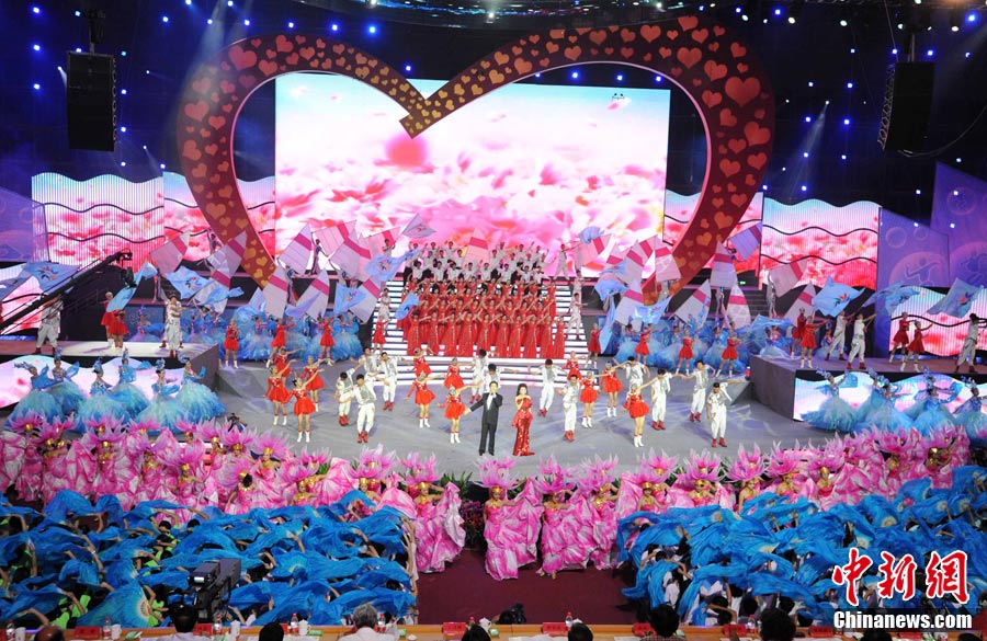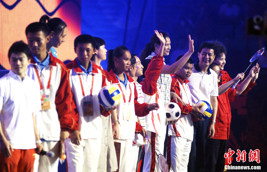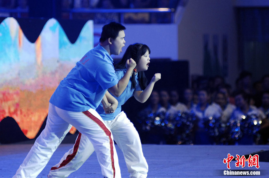 9月25日晚,第五届全国特奥会闭幕式在福建省体育馆举行。闭幕式文艺晚会主题为“大爱无言”,分《感恩大地》《超越梦想》《激情永恒》3个篇章,共10个节目,包括歌舞、朗诵、真情倾诉、独唱等,演出时间约60分钟。 图为闭幕式文艺演出。 中新社记者 刘可耕 摄