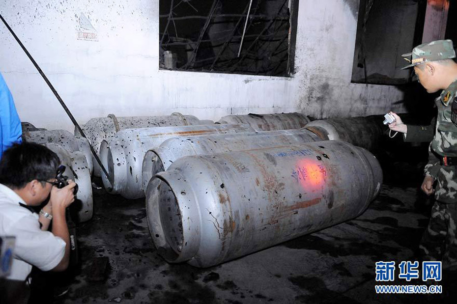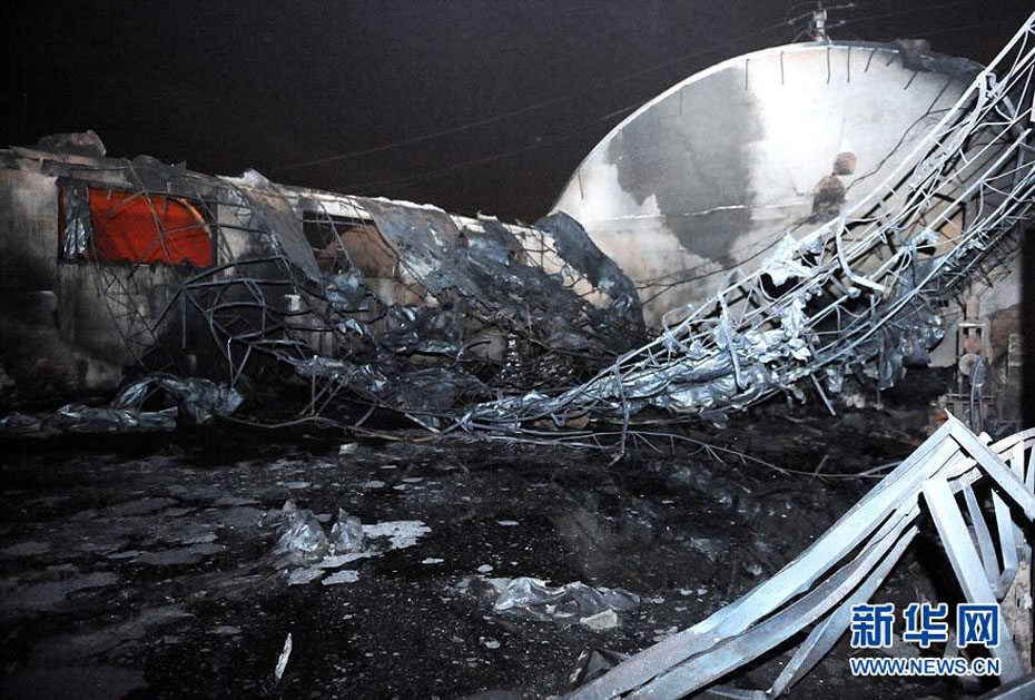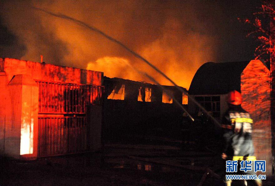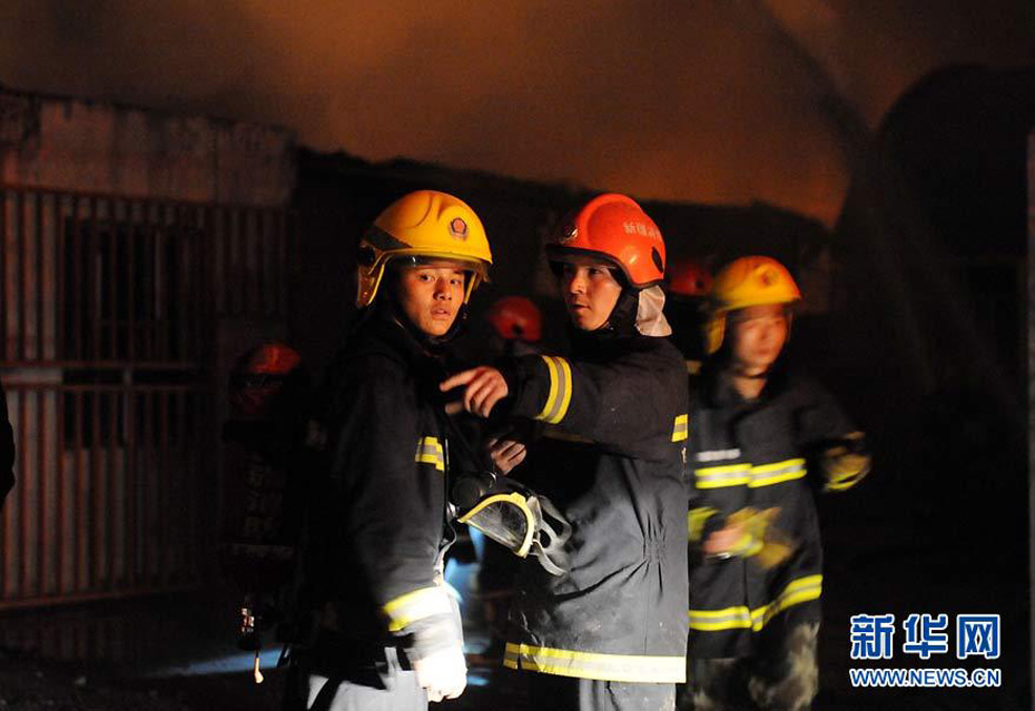 9月25日,消防官兵在火灾现场进行扑救。当日晚间,乌鲁木齐国际机场跑道东侧围墙外一家“恒利挤塑板厂”发生火灾并有爆炸,由于有爆炸物散落到机场跑道,乌鲁木齐国际机场关闭了一个小时,清理跑道。图片来源:新华网 王菲 摄