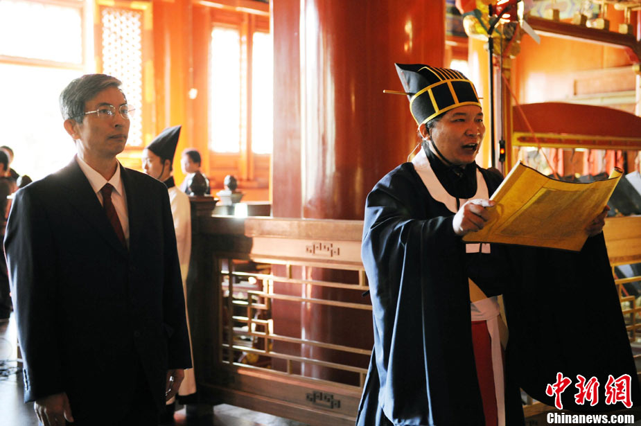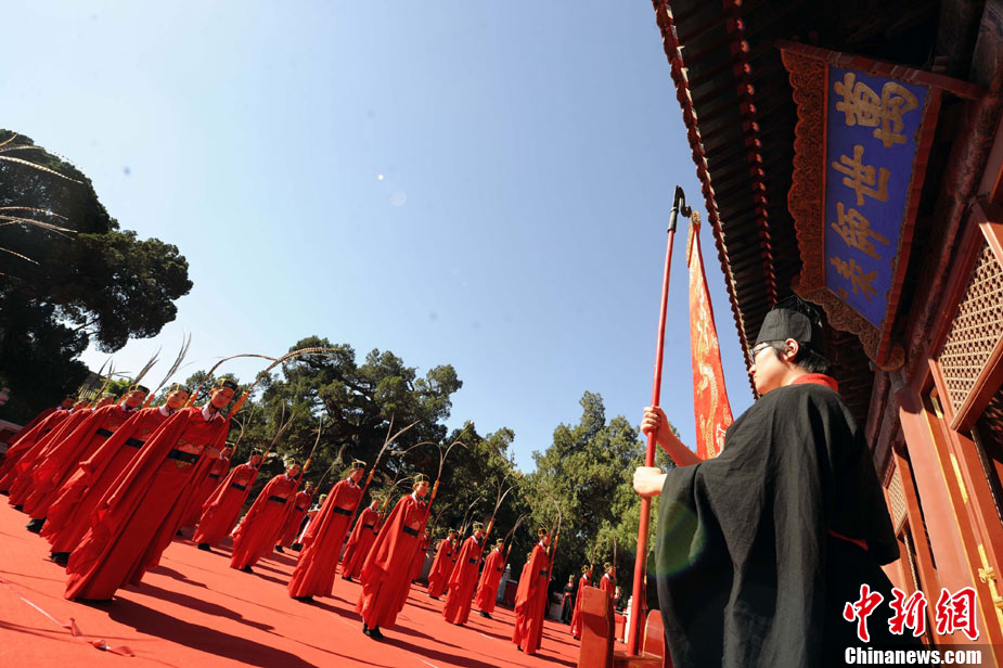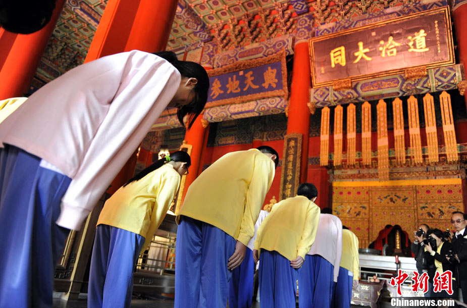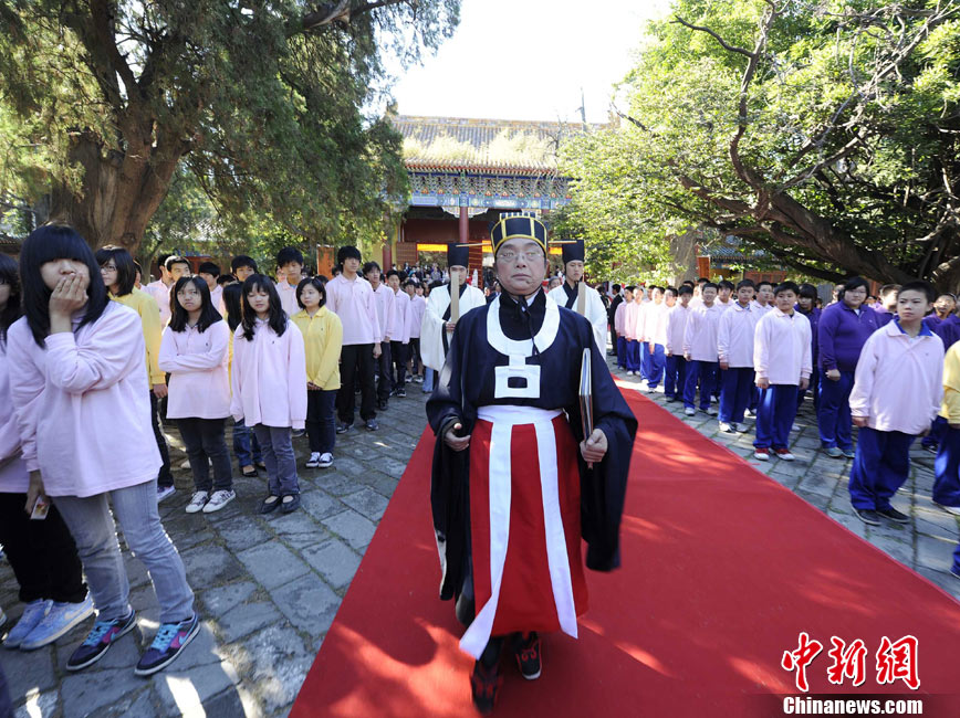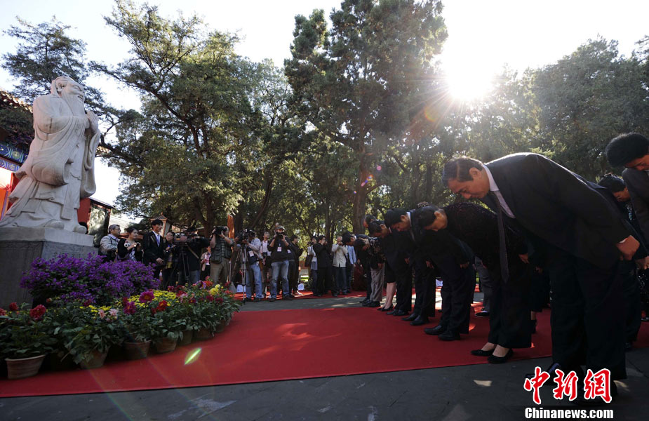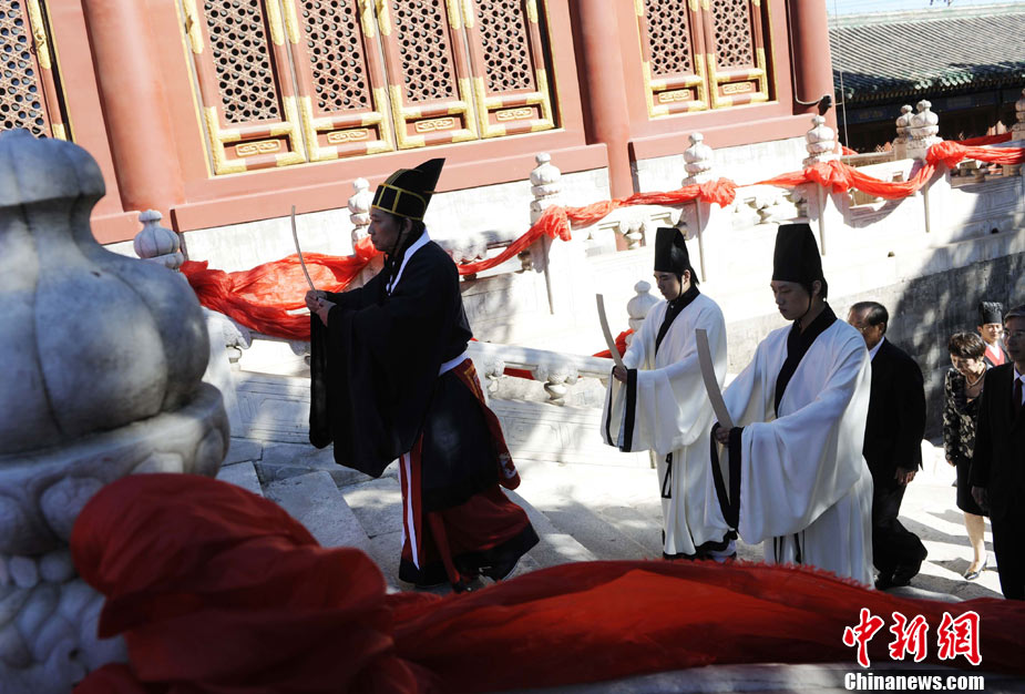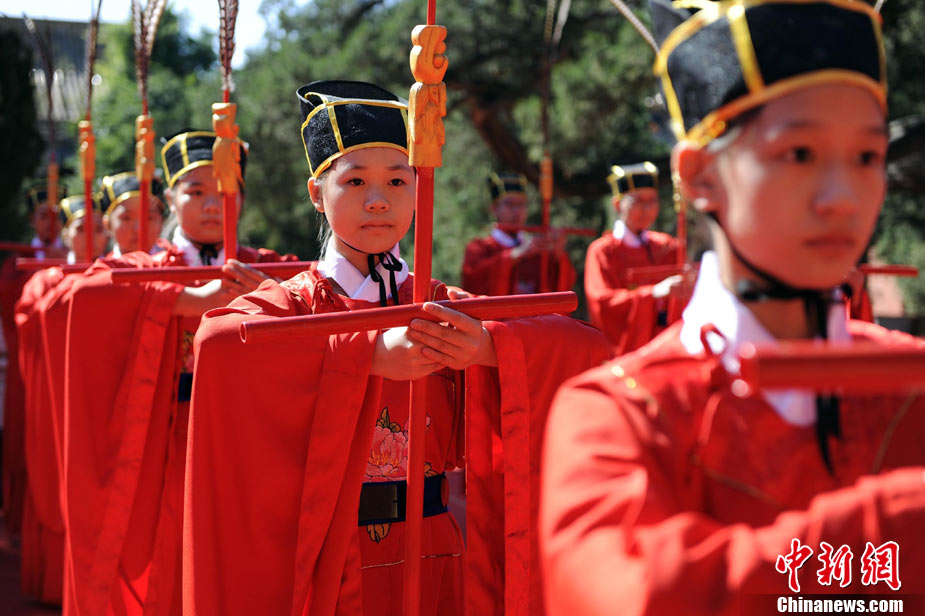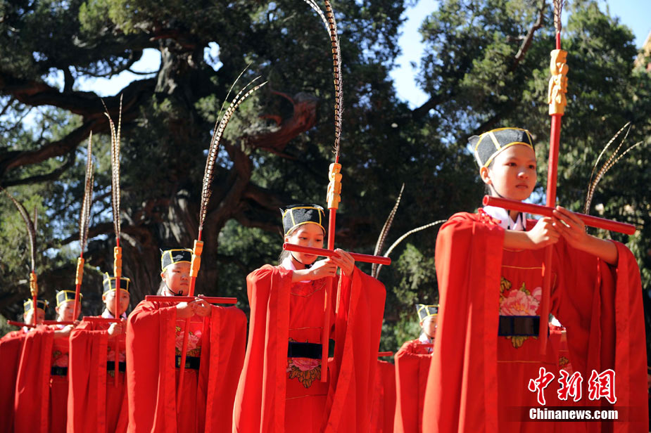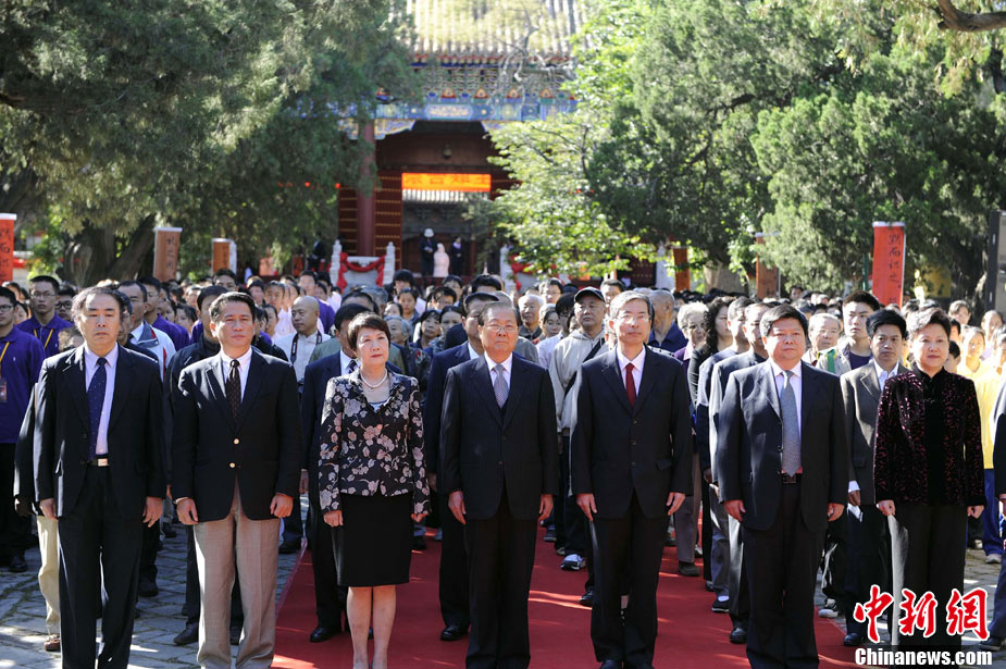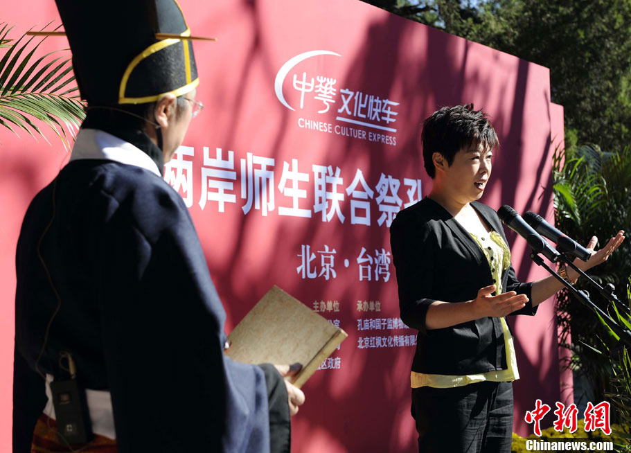 9月28日上午,两岸师生联合祭孔大典仪式在北京孔庙举行。来自台湾和北京的两岸师生共计500人,共同祭奠孔子,弘扬中华传统文化。中新社记者 刘震 摄