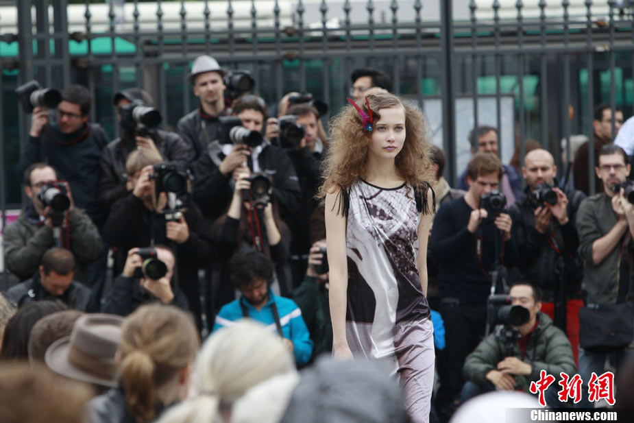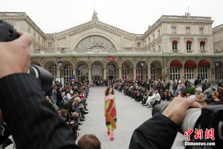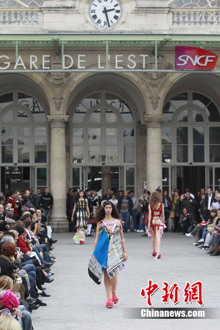 9月28日,法国巴黎,众靓模在巴黎火车站(Gare de L’est )上演了一场另类走秀。