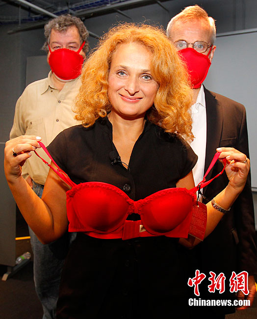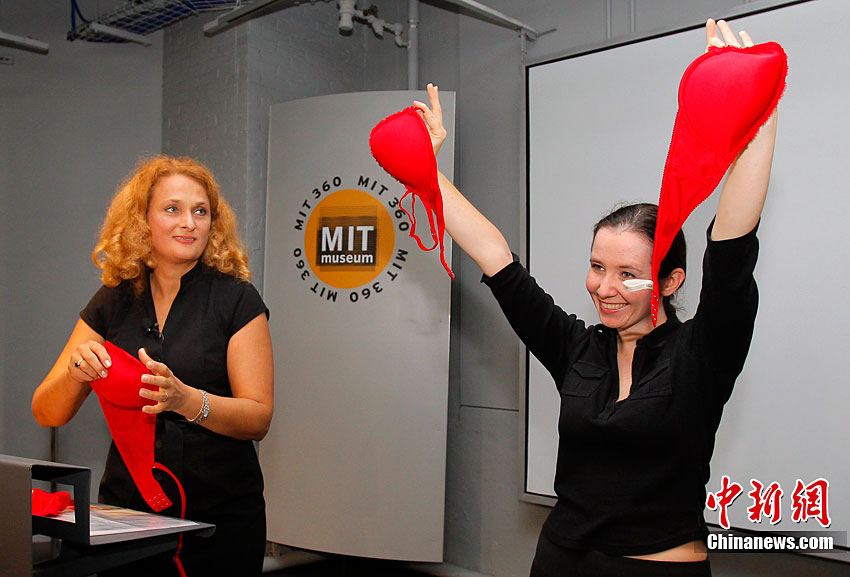 当地时间9月28日,科学家博德纳在美国麻省理工学院博物馆公开展演了她的发明——“应急胸罩”。该款胸罩可以在瞬间变成防毒面具,保护使用者免遭致命生化制剂的攻击。凭借这款“防毒胸罩”,博德纳曾获得2009年“搞笑诺贝尔奖”的公共健康奖。