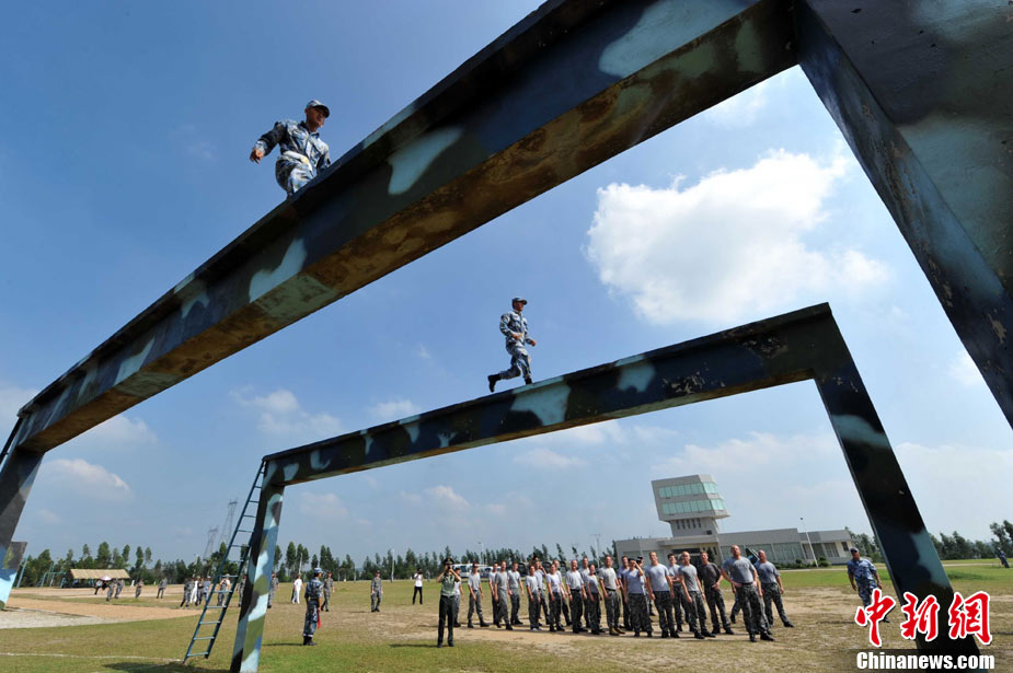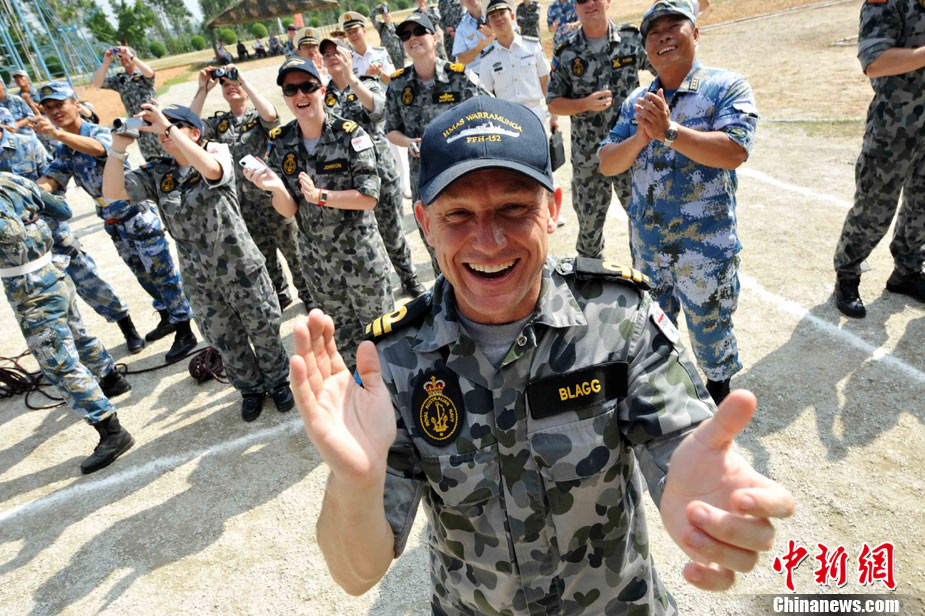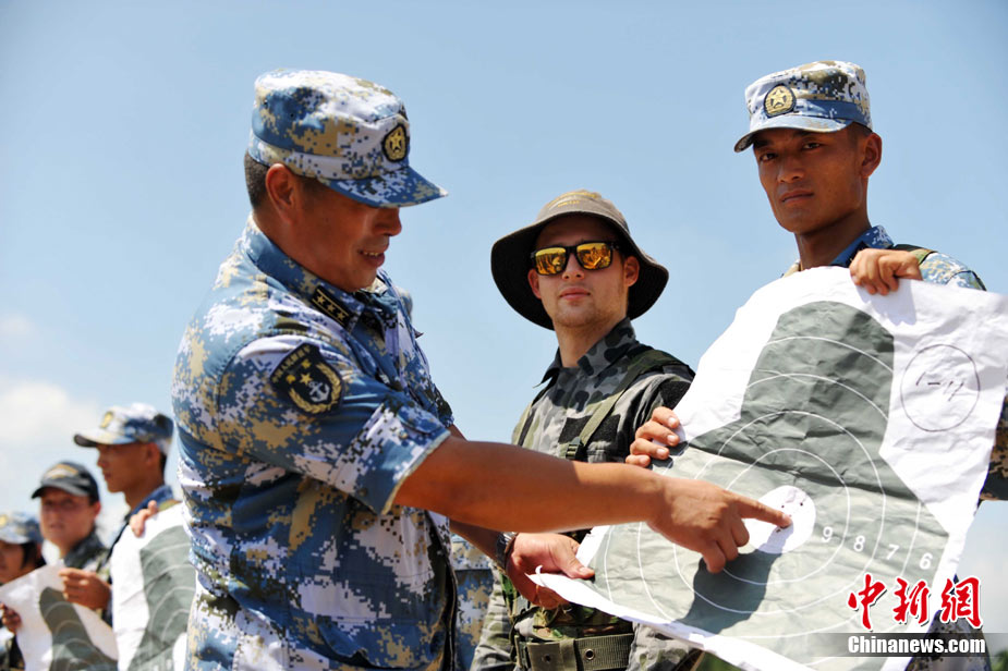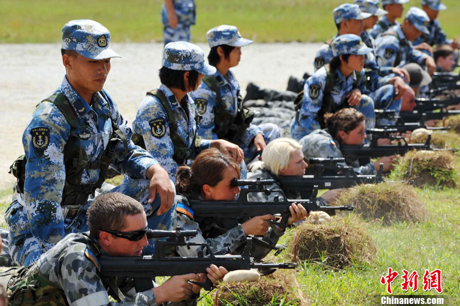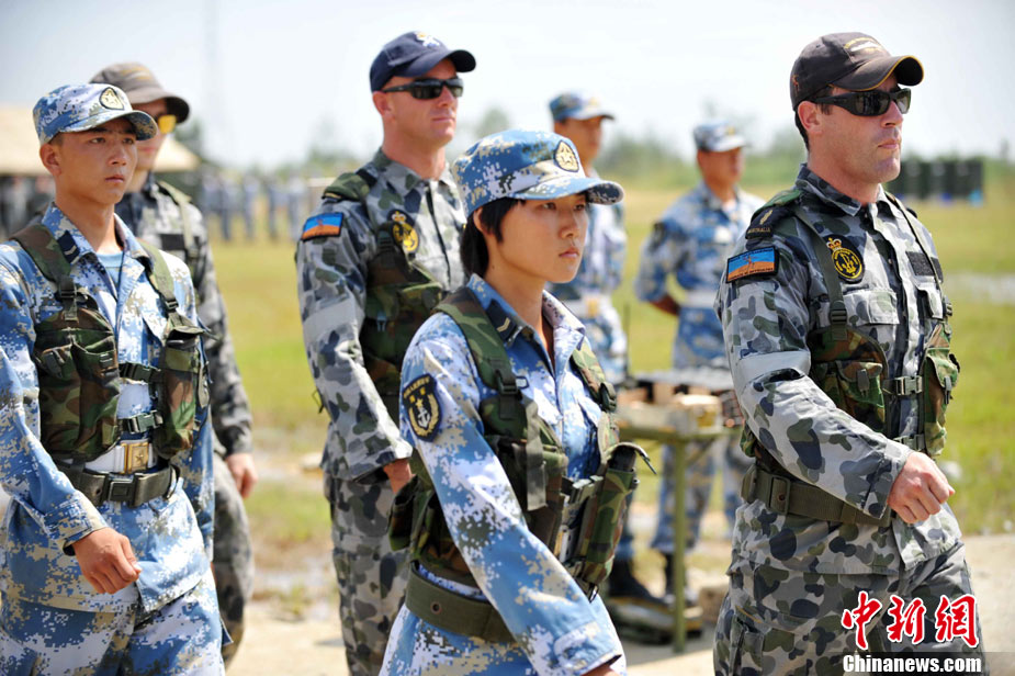 9月29日,中国南海舰队某陆战队与应邀来华访问的澳大利亚海军陆战队在湛江某部训练场举行联合训练,包括攀登、两栖障碍、射击等。中新社记者 陈文 摄