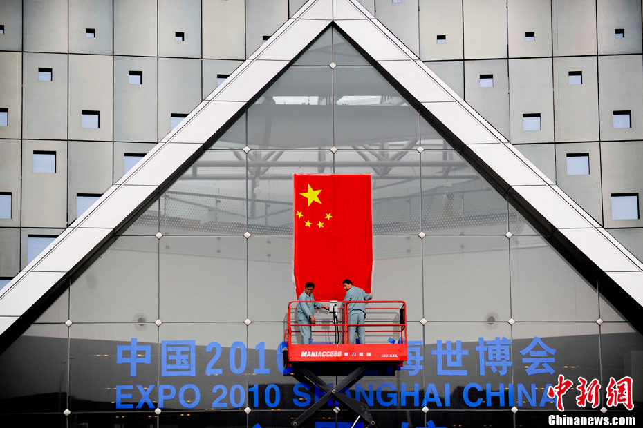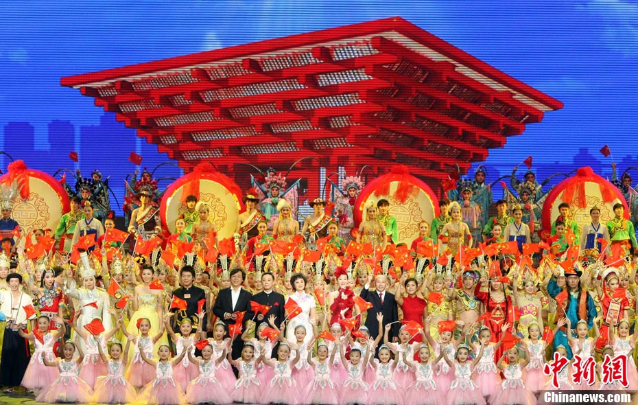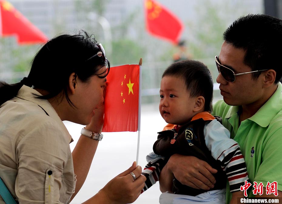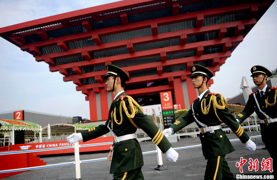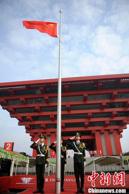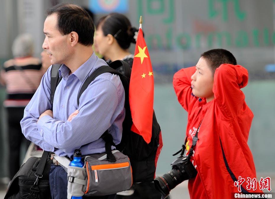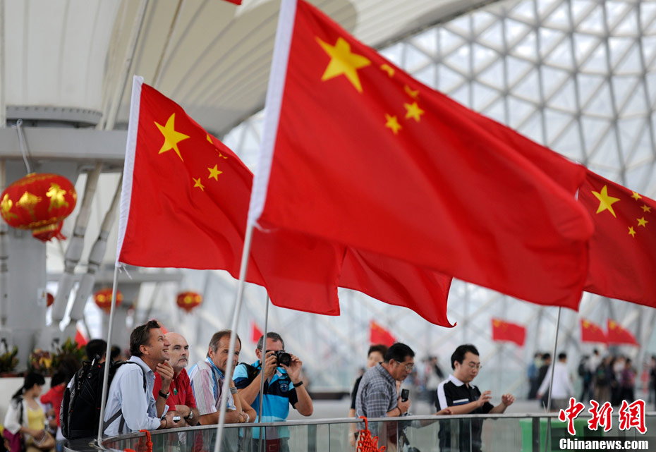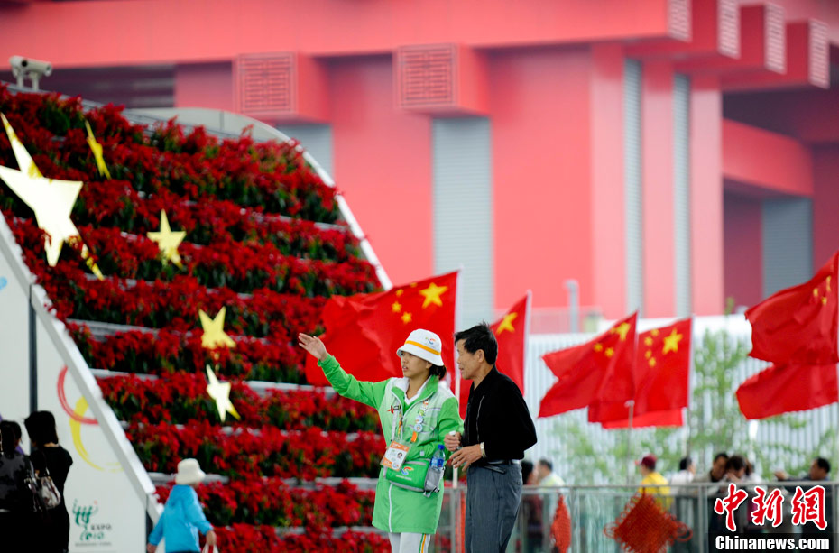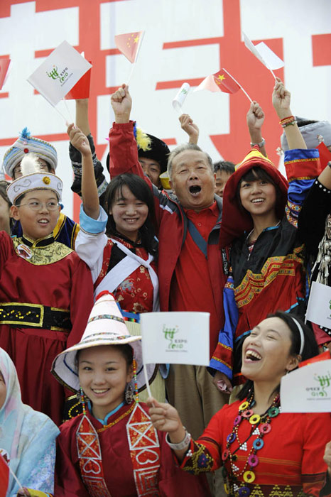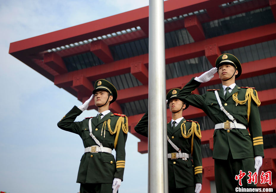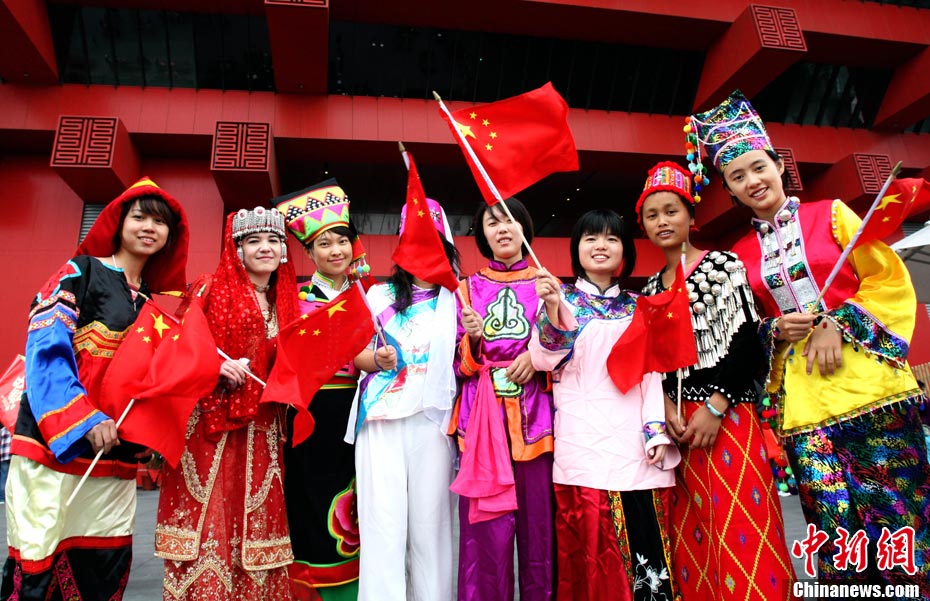 10月1日,在世博园浦西船坞广场,56个民族代表准备参加升国旗仪式。新华社记者 郭磊 摄