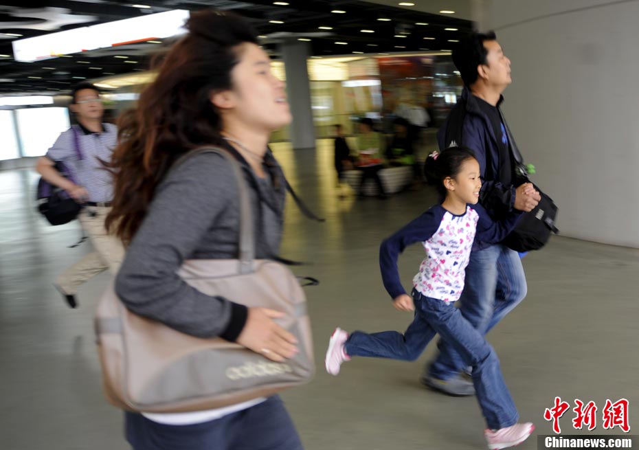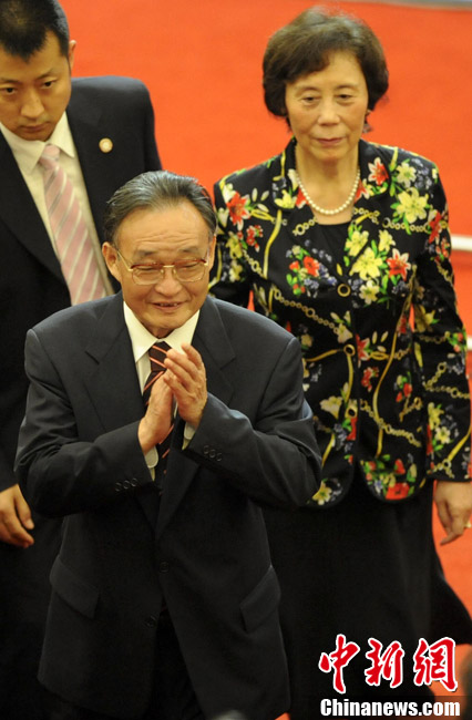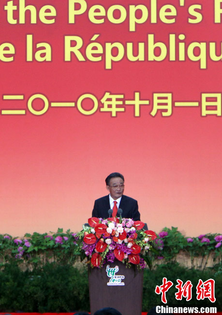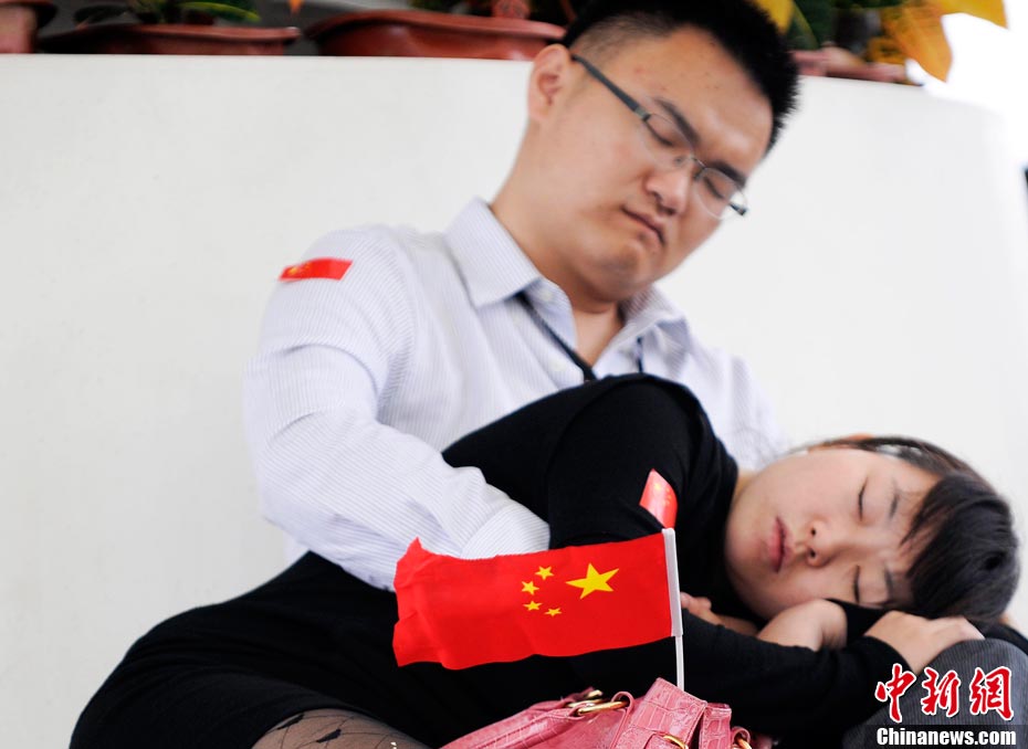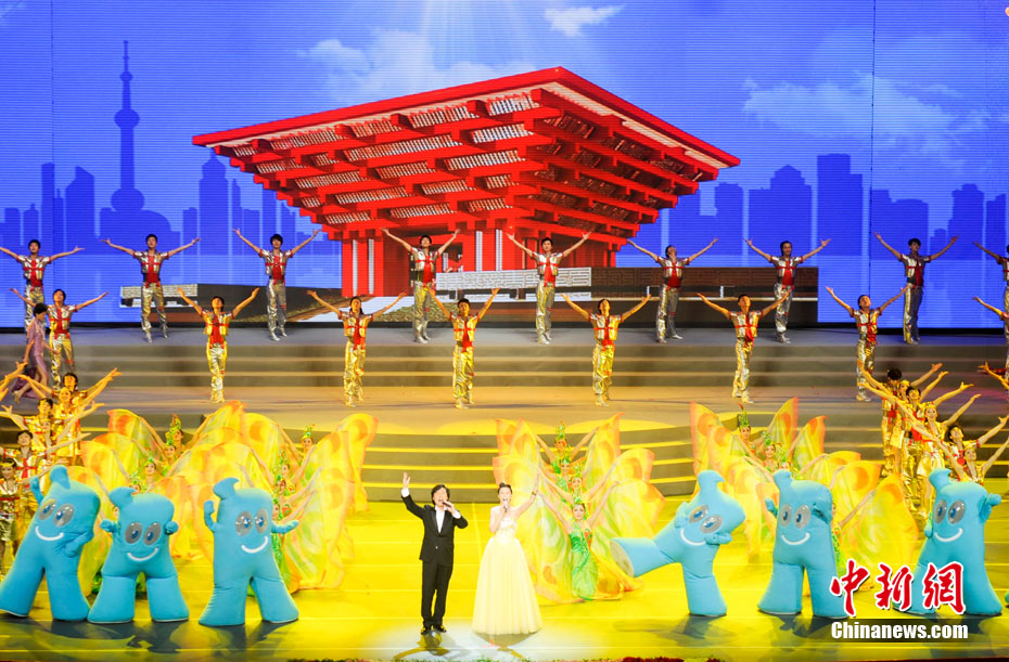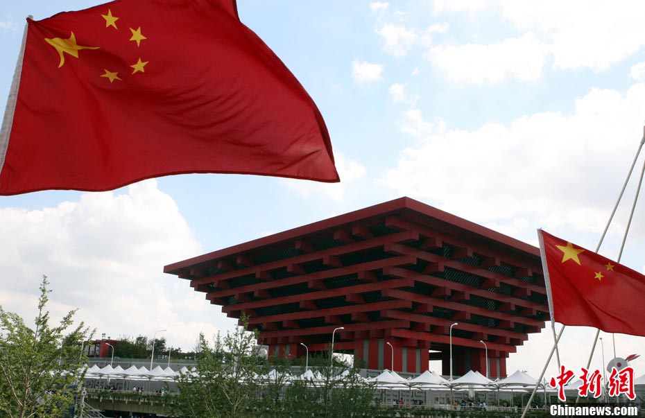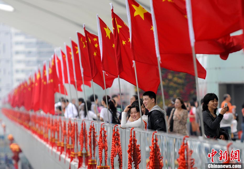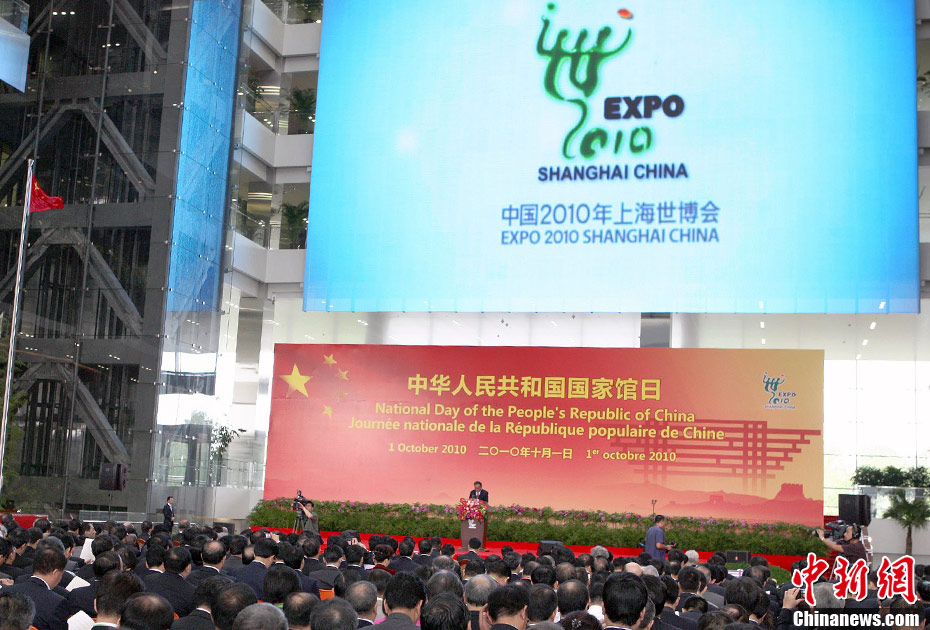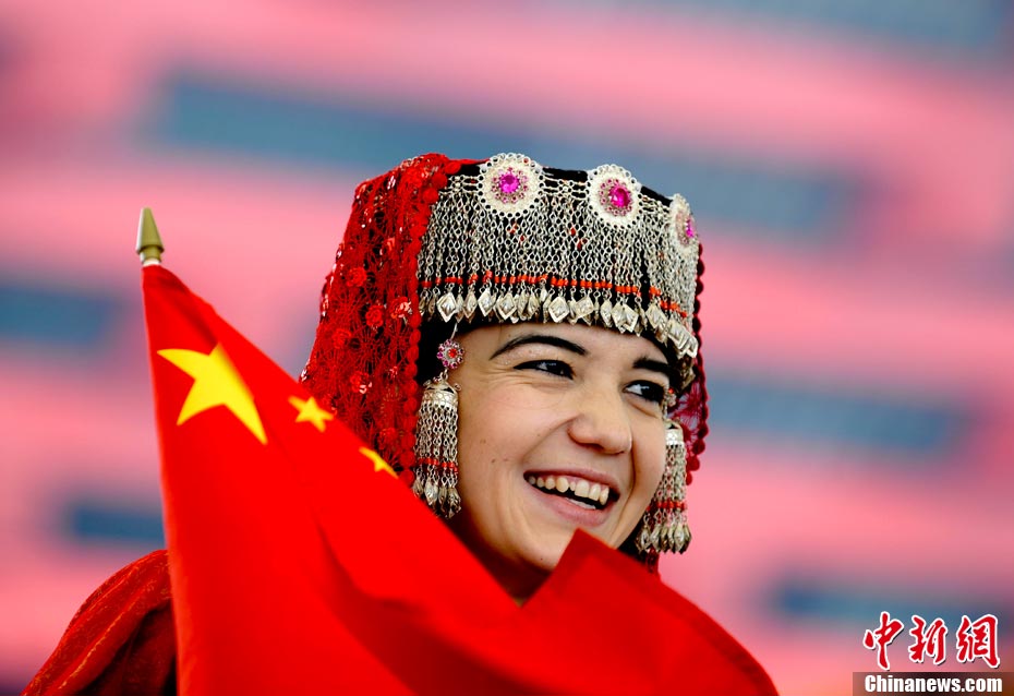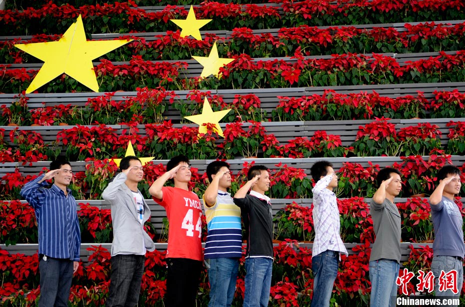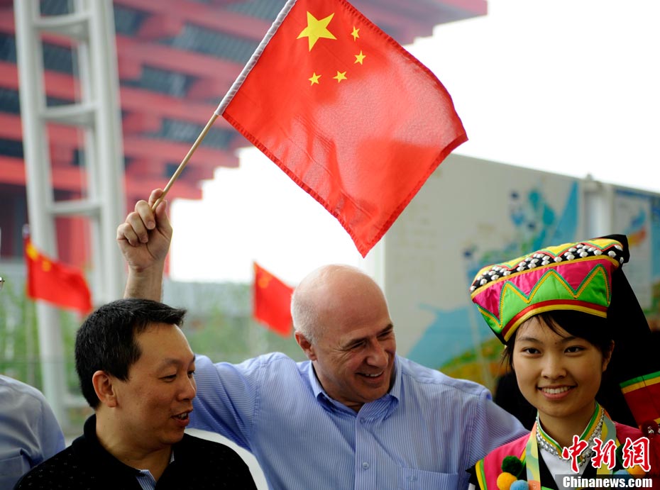 10月1日,在世博园浦西船坞广场,56个民族代表准备参加升国旗仪式。新华社记者 郭磊 摄