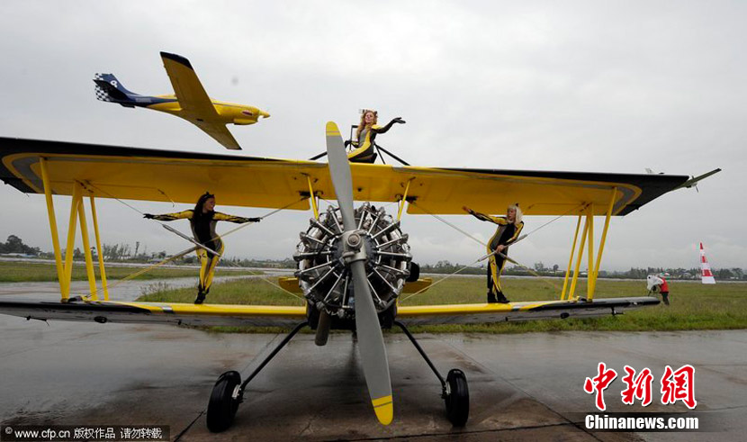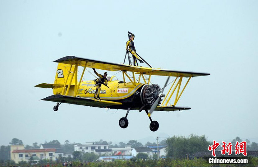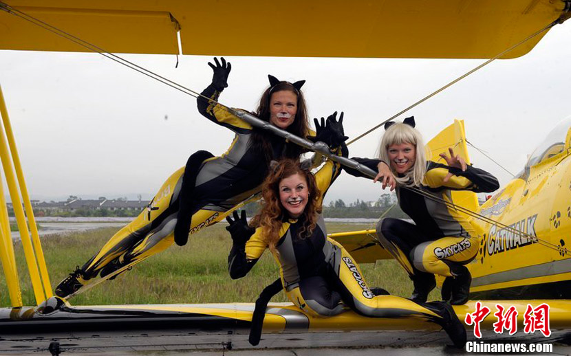 2010年9月30日,2010年首届中国(重庆)国际飞行爱好者年会暨国际通用航空器展示交易会在重庆梁平县开幕。虽本场航空表演仅对专业人士开放,仍然吸引了3万人涌进梁平机场。图为瑞典猫女郎准备进行“机翼行走”特技表演。图片来源:CFP视觉中国
