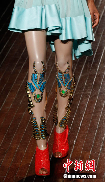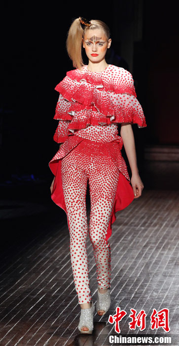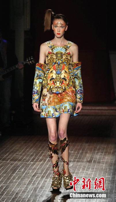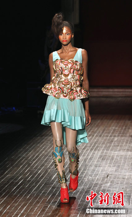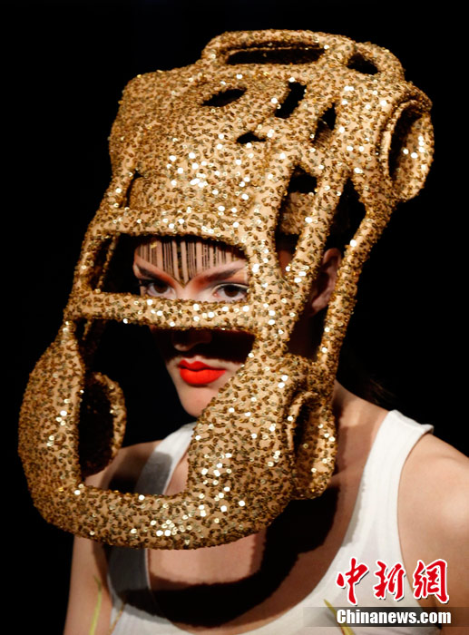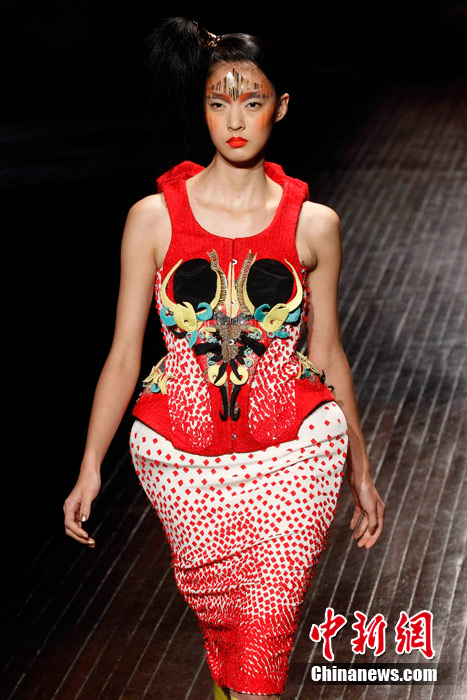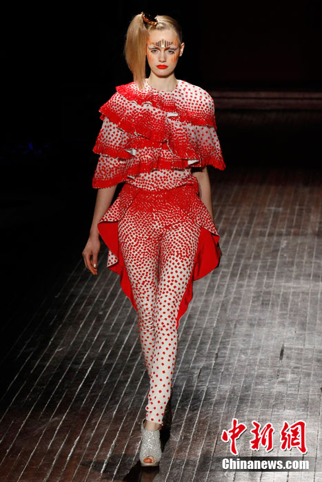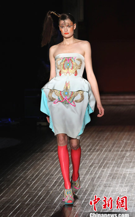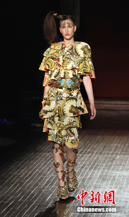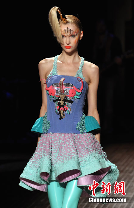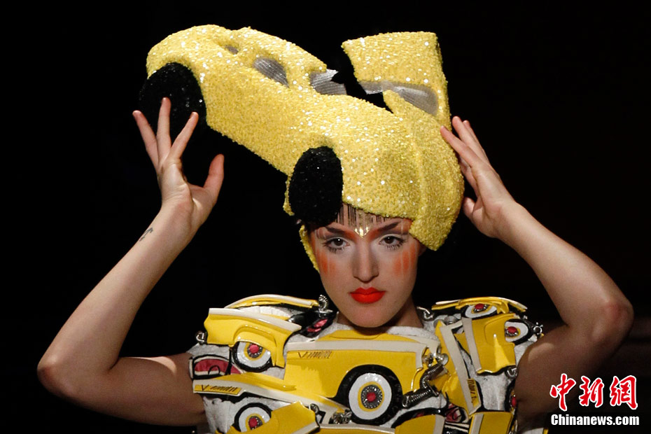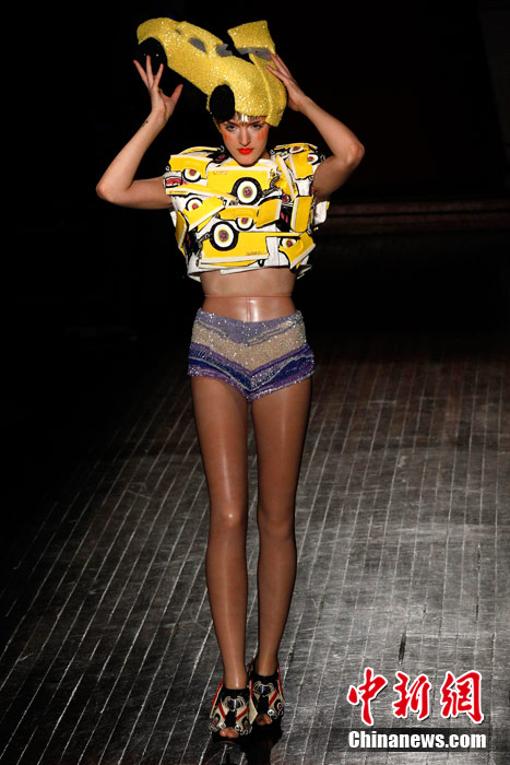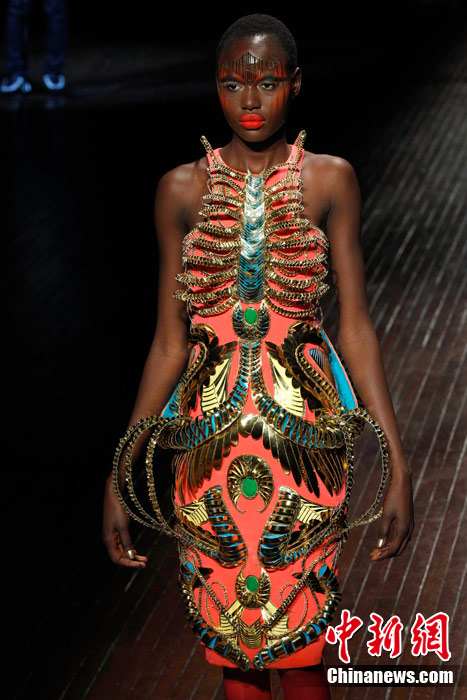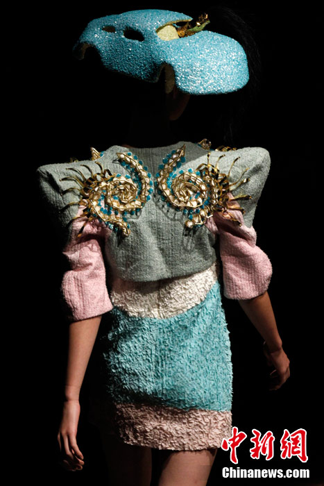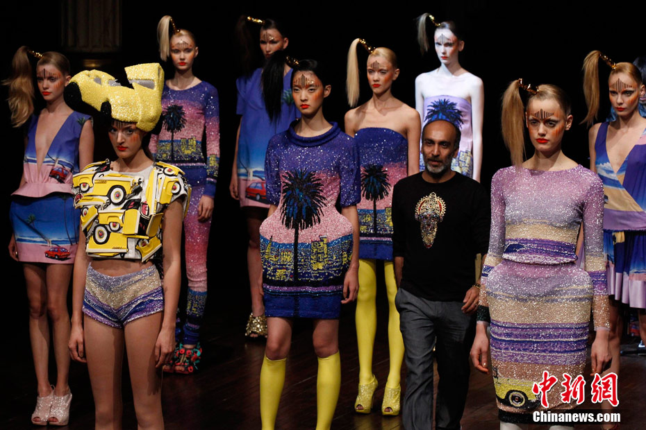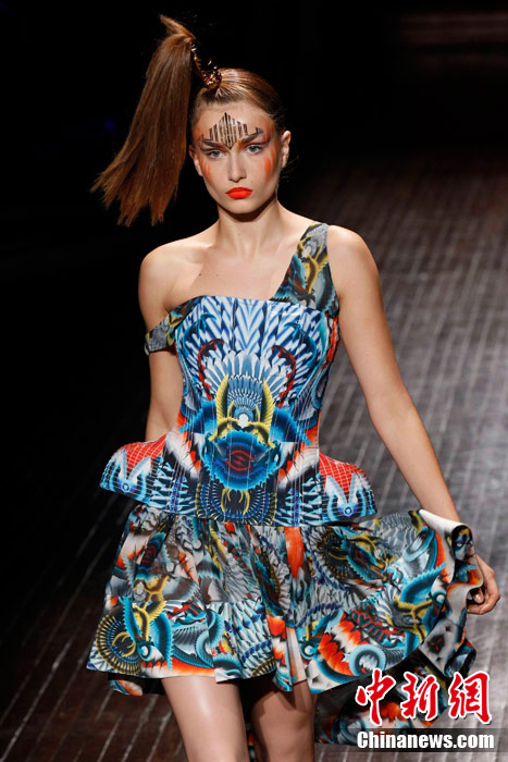 9月30日,巴黎时装周上,模特在展示印度设计师曼尼诗·阿罗拉(Manish Arora)的作品。大胆鲜艳的另类风格,让人耳目一新。