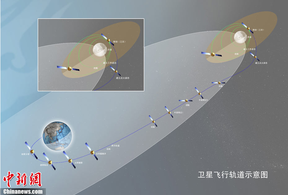 继嫦娥一号卫星圆满完成我国首次绕月探测工程之后,嫦娥二号绕月探测卫星作为我国探月工程二期的先行者,又踏上了奔月的征程。嫦娥二号轨道图。图片来源:中国航天科技集团公司