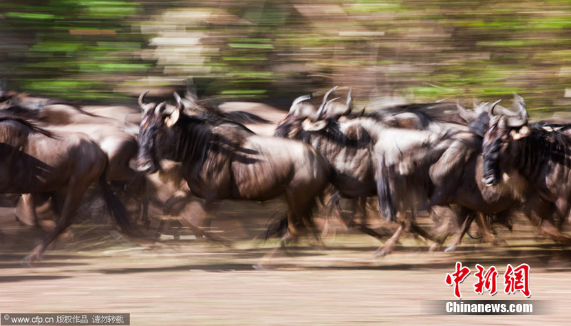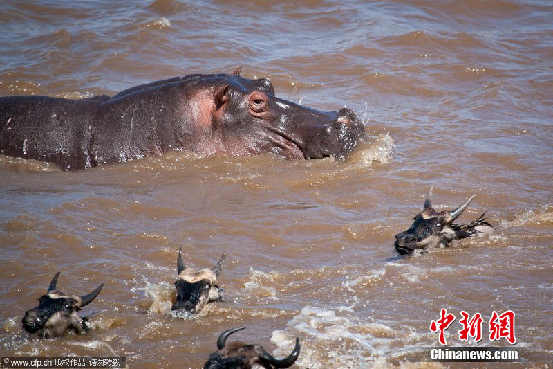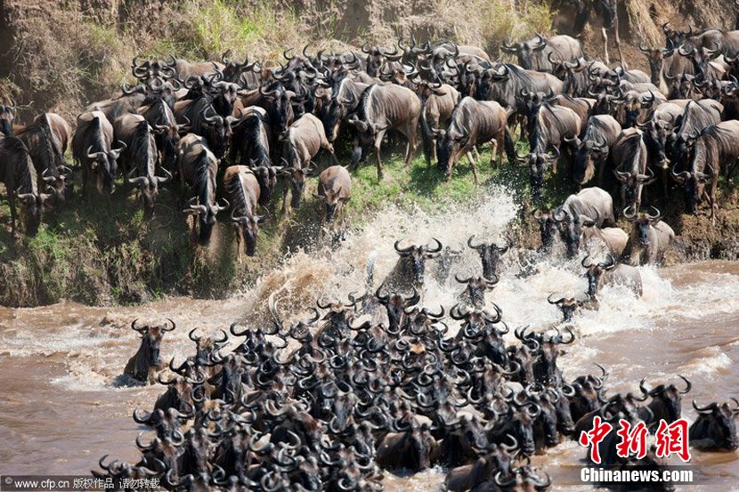 英国兄弟威廉和马修·伯拉德-卢卡斯日前从伦敦前往非洲进行了为期12天的探险之旅,他们在塞伦盖蒂国家公园和马赛马拉国家保护区之间的马拉河畔拍到了230万只牛羚大迁徙的壮观景象。马拉河是长途迁徙的牛羚要渡过的最后一条河,在这里,牛羚的两大天敌都在等待着它们,一种是世上最大、最为凶残的尼罗鳄,另一种则是被称为“非洲河王”的河马。它们潜伏在水中,等待着牛羚渡河时饱餐一顿。而且在这种时候,就连周围草原里的猎豹等猛兽也会来分一杯羹。但每年春秋两季,牛羚都会从这里涉水而过,迁徙到远方寻找水草丰美的“伊甸园”。 图片来源:CFP视觉中国
