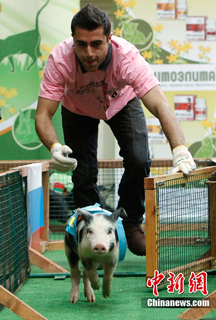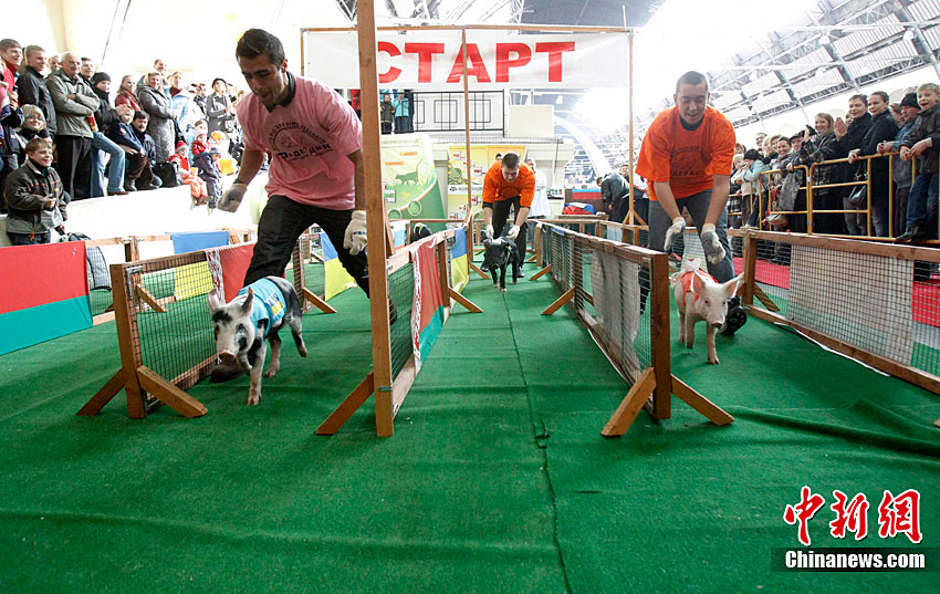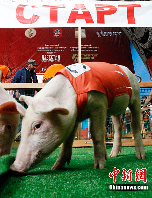 当地时间10月2日,俄罗斯莫斯科举行了一场别开声面的猪仔赛跑比赛,这是俄罗斯“金秋-2010”农业成就展上的一部分。