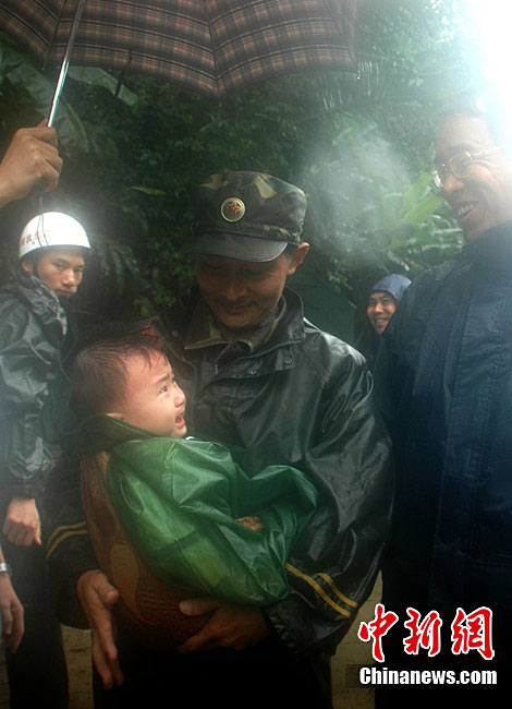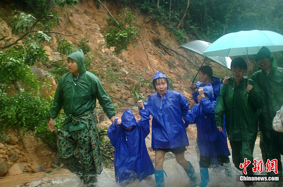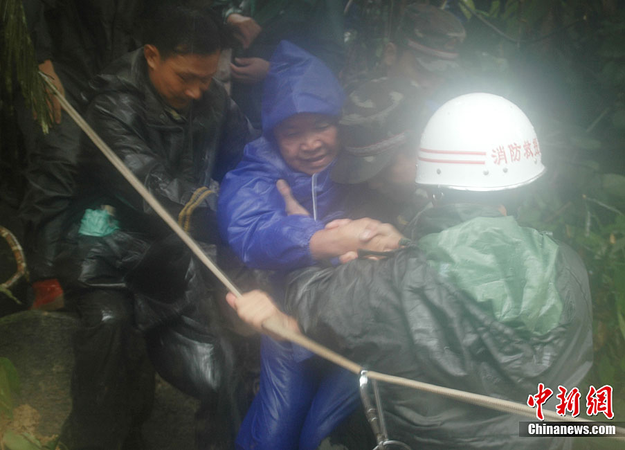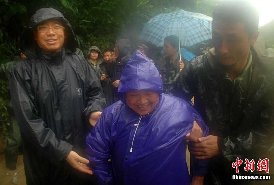 10月4日15时许,经过救援人员近48个小时的紧张救援,因山体滑坡被滞留在吊罗山中的125名游客已经全部安全转移下山。10月2日下午3时,在海南陵水吊罗山林业局上山道路约3.5公里处,突发山体滑坡,海南省政府相关部门和陵水县委县政府全力组织人员实施救援。图为今年已经88岁的老人许环渠(音)在救援人员的陪护下转移。中新社记者 尹海明 摄
