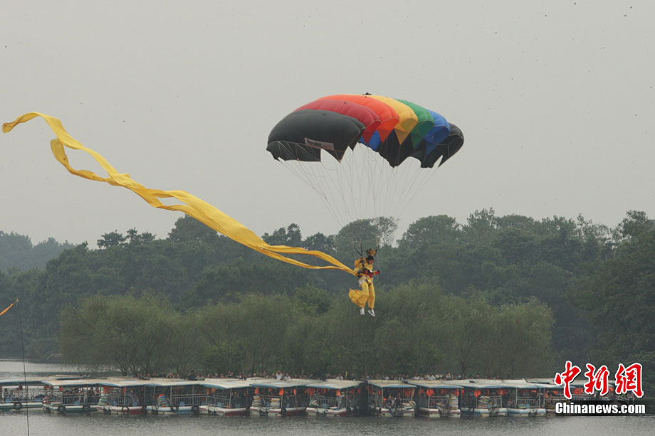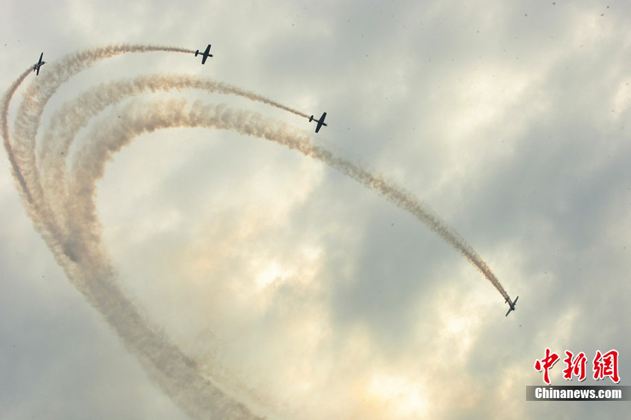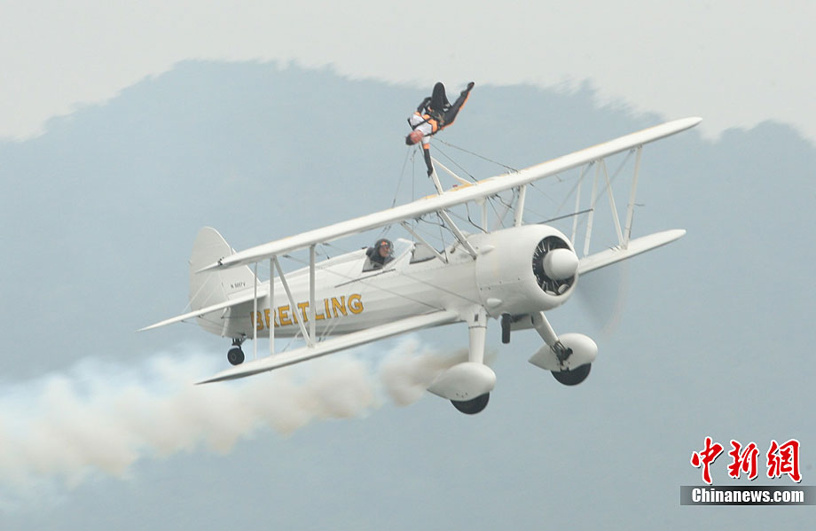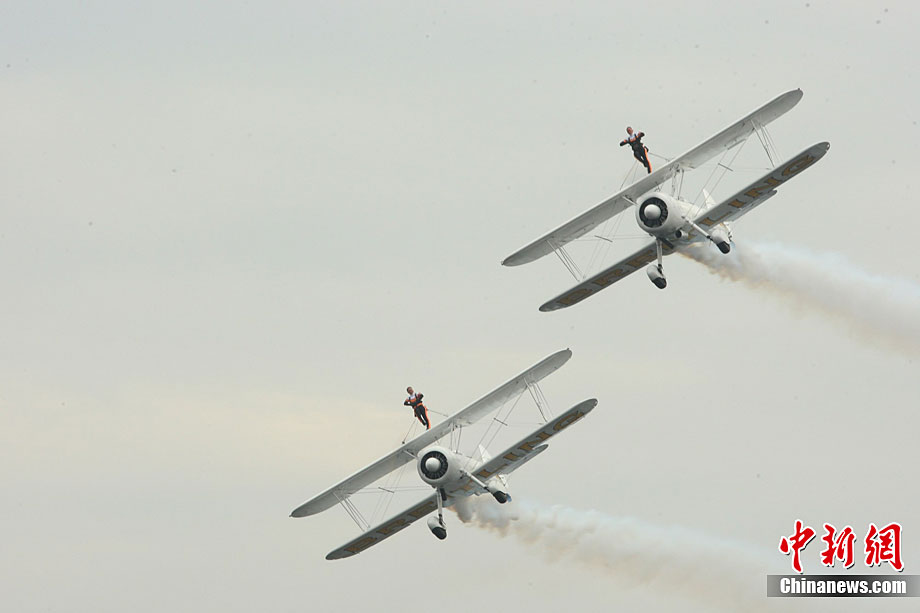 中新网大足10月4日电 (连肖 杜远)4日下午,重庆大足首届国际航空体育旅游节开幕,空军“八一”跳伞队和英国两支特技飞行队在大足龙水湖上空上演了多项空中特技。其中,两名英国女郎站在时速高达240公里的飞机机翼上表演各种芭蕾动作,引得观众大呼惊险。连肖 摄