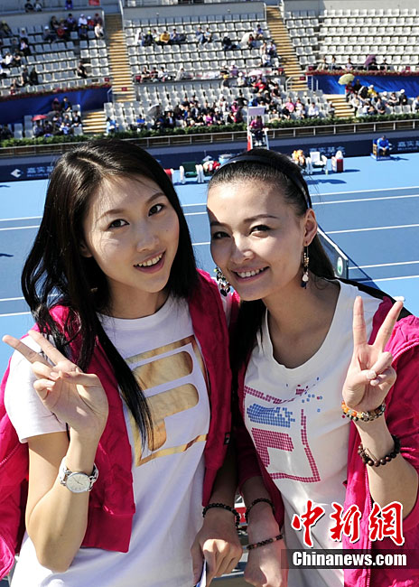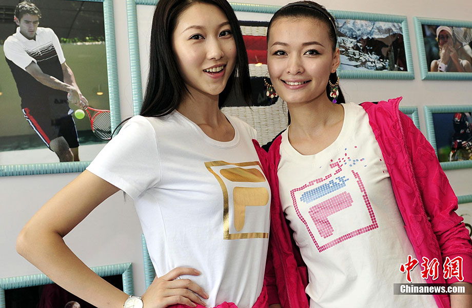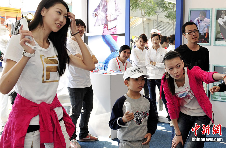 10月4日,时尚中网代言人、第五届中国职业模特大赛冠军赵晨池,首届亚洲超级模特大赛冠军王慧在北京亮相时尚运动品牌FILA展台,与现场的球迷朋友们开展了一场别开生面的网球游戏体验活动,助阵FILA及参与本届中网的FILA四位代言人。中新社记者 钱兴强 摄