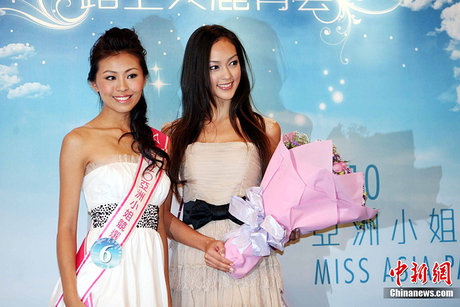 10月5日,参加《2010亚洲小姐竞选--港澳赛区》的佳丽在香港一家酒店登台亮相,与大会形象顾问团成员会面。图为6号佳丽李瑩瑩向形态顾问Jessica C献花。中新社发 洪少葵 摄