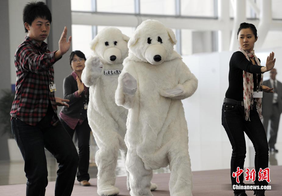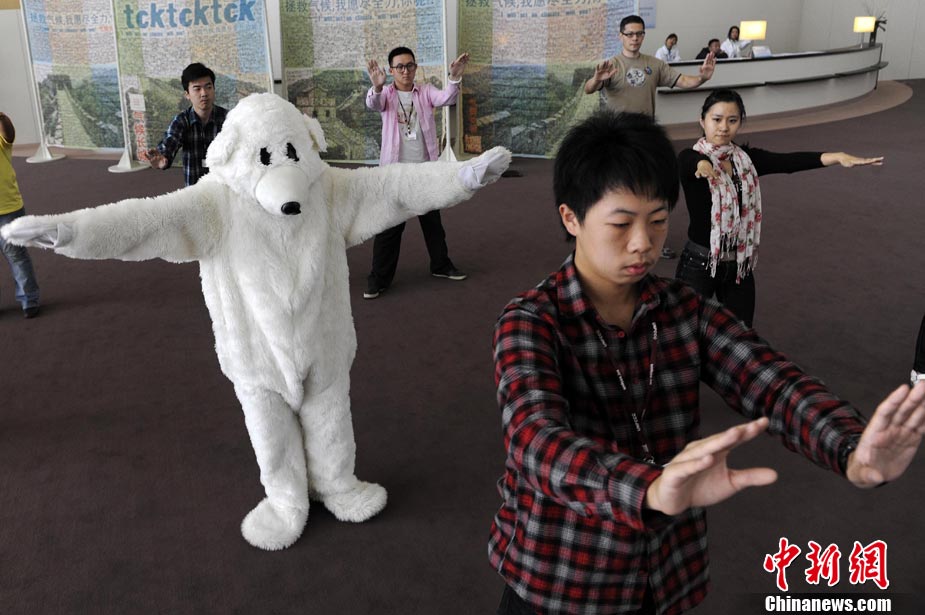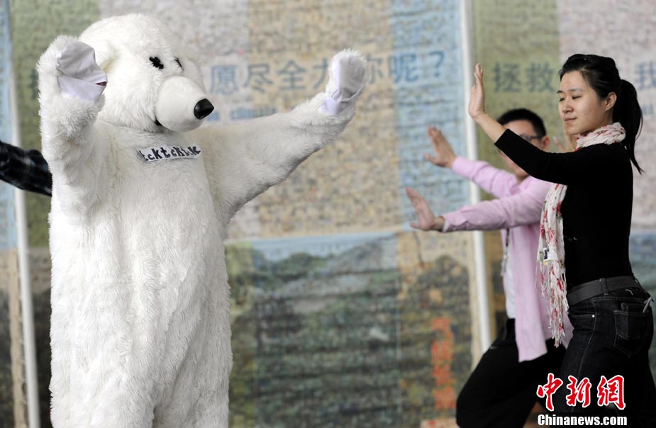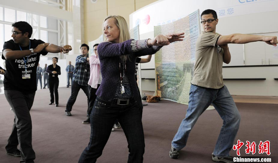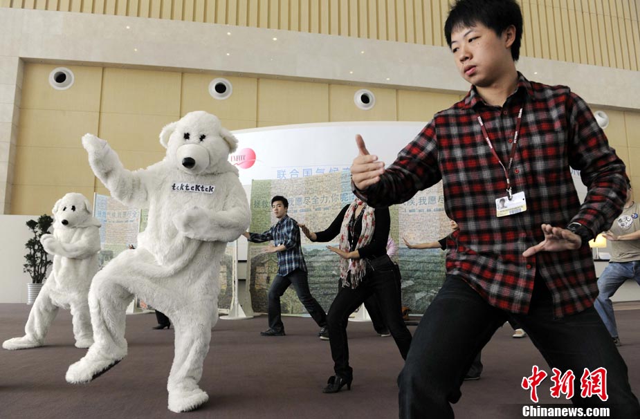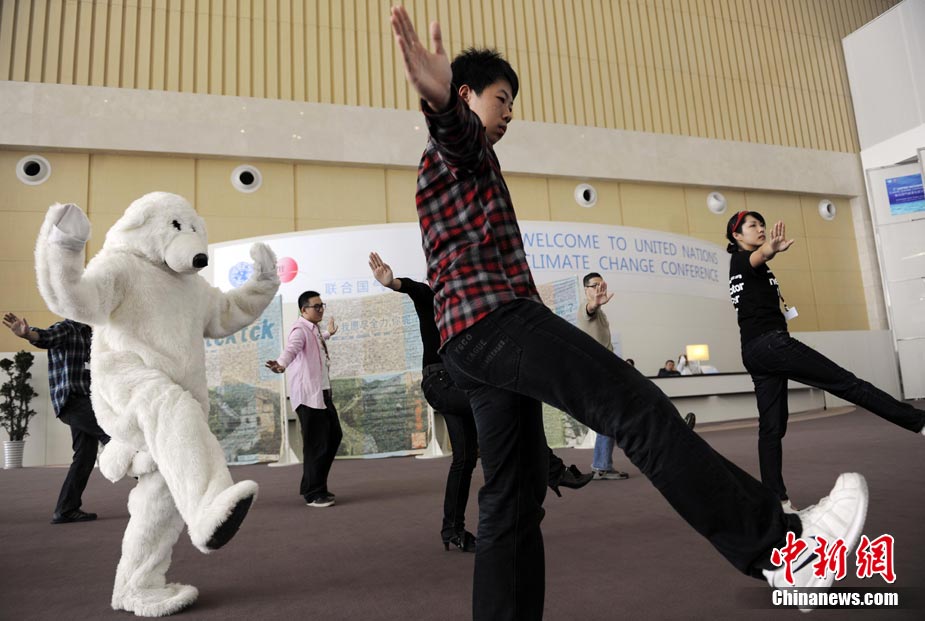 10月6日,联合国气候变化国际谈判天津会议继续举行。全球气候行动联盟(TckTckTck 运动)特意安排了一个“北极熊”打太极的活动,邀请各国代表进入会场之前加入打太极拳。希望这两天谈判各方达成一个 “balanced package"(顾及各方利益的均衡协议),并以此警示人们爱护环境,拯救地球气候。该组织由200个来自中国以及世界其他国家民间组织组成。 中新社记者 刘震 摄