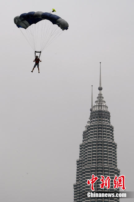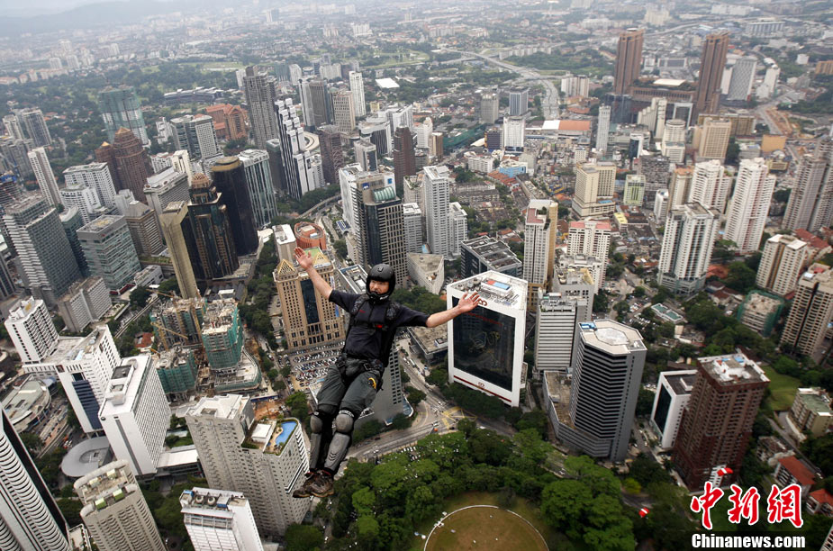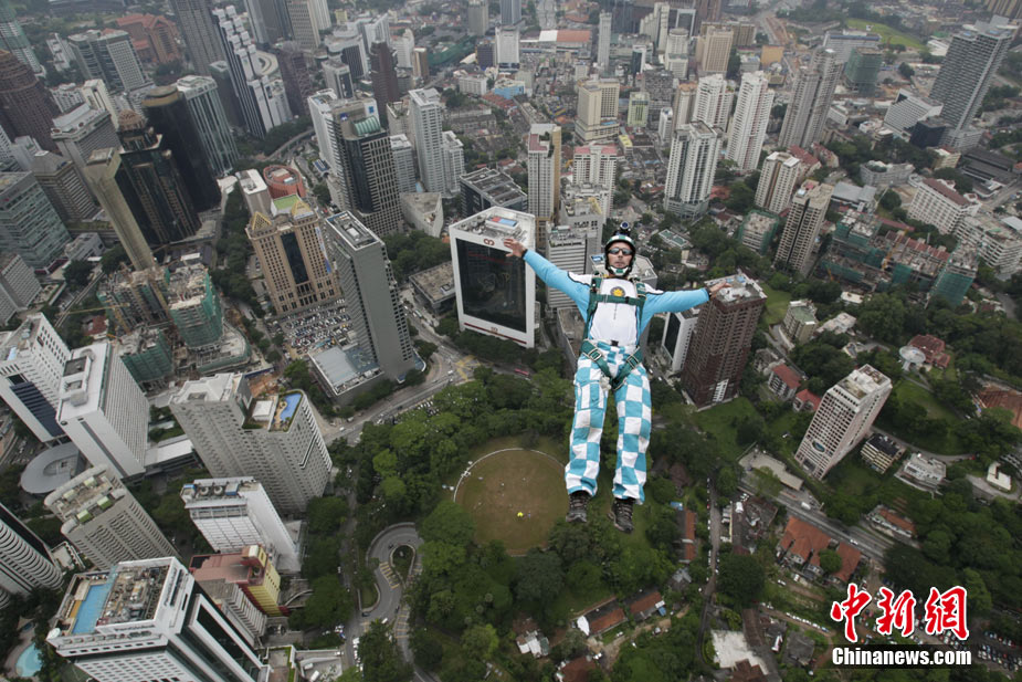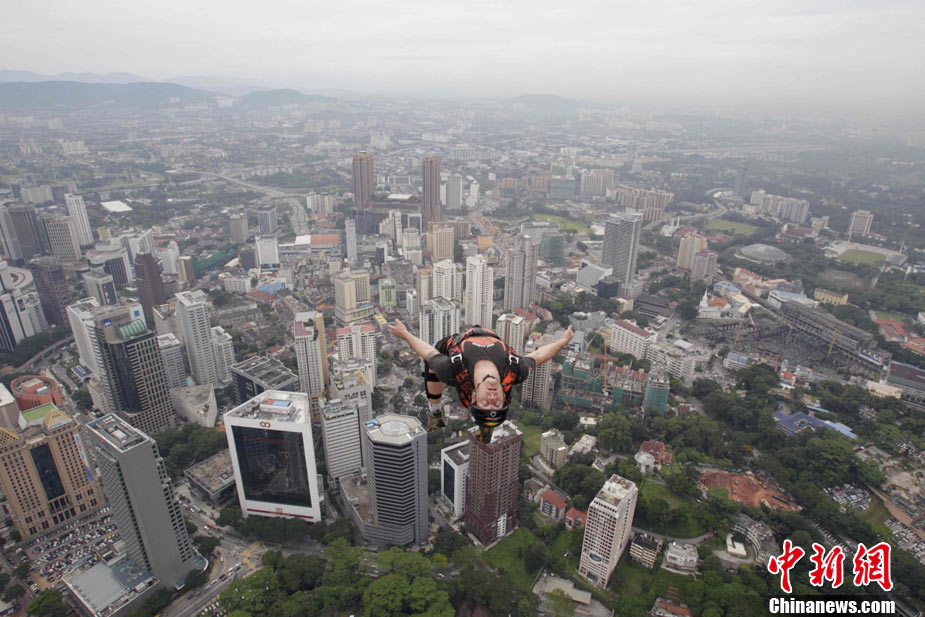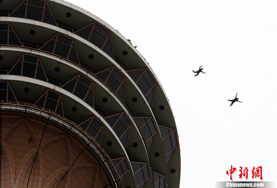 10月7日,几位极限高手在马来西亚吉隆坡的双子高塔上大玩跳跃,体验超乎寻常的刺激感受。