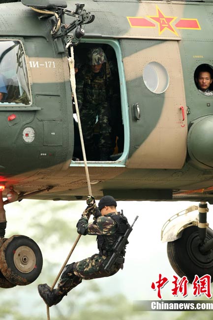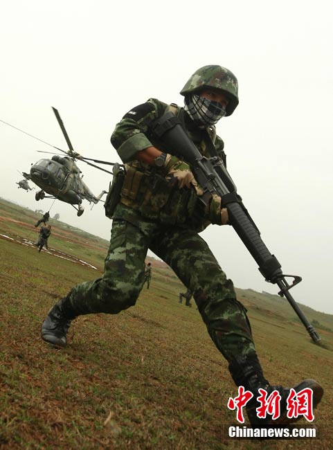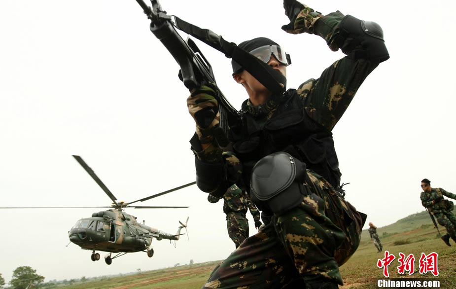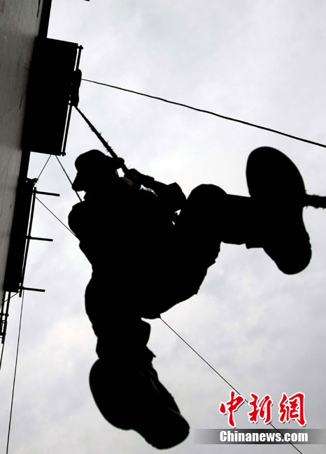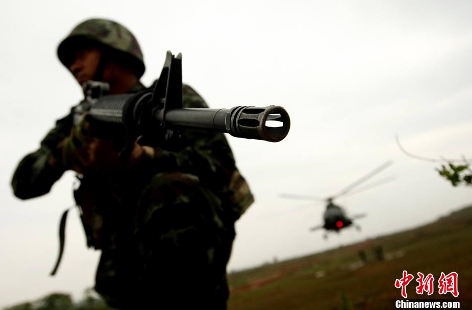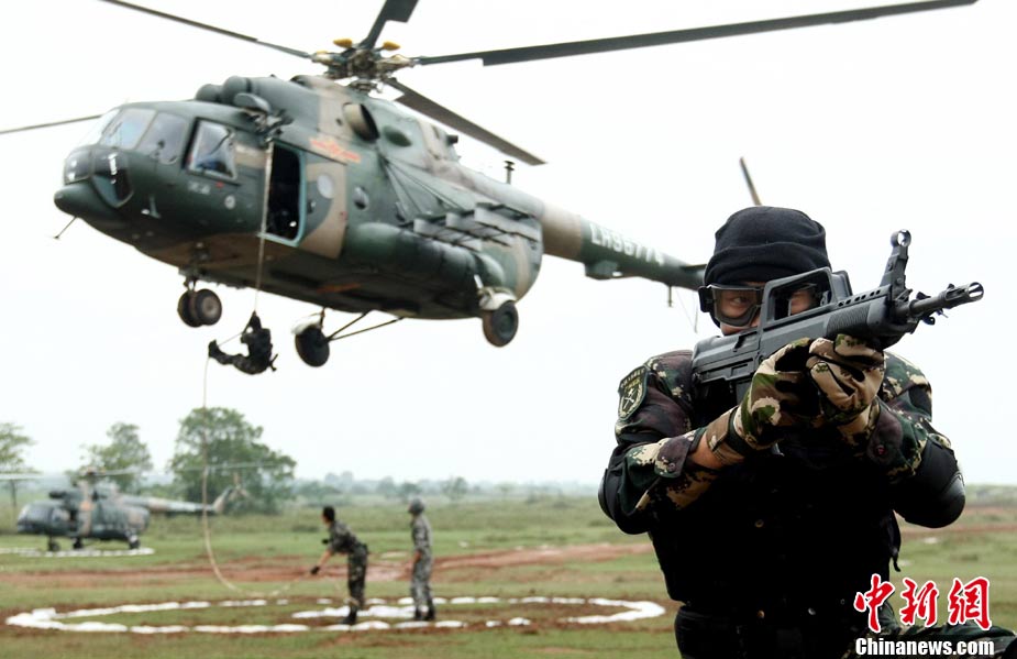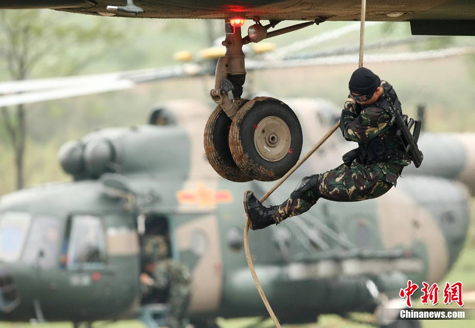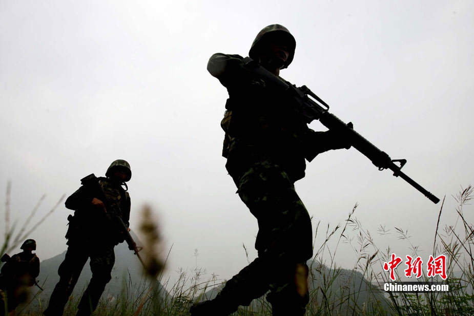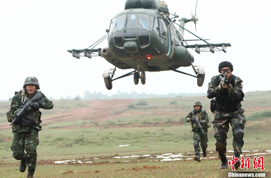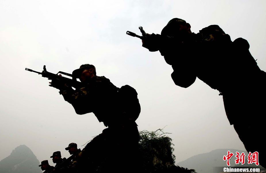 10月8日,中国、泰国两军特种部队“突击—2010”反恐联合训练在广西桂林拉开帷幕,这是两国之间举行的第三次陆军联合训练。分析人士指出,这次联训将进一步巩固两军关系,提高联合反恐作战能力,利于维护地区和平稳定。此次联训为期15天,这是中泰两国陆军首次就城市反恐课题开展联训。图为中国参训部队在开幕式上表演房屋突击。中新社记者 杜洋 摄