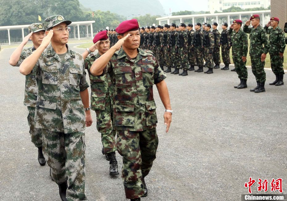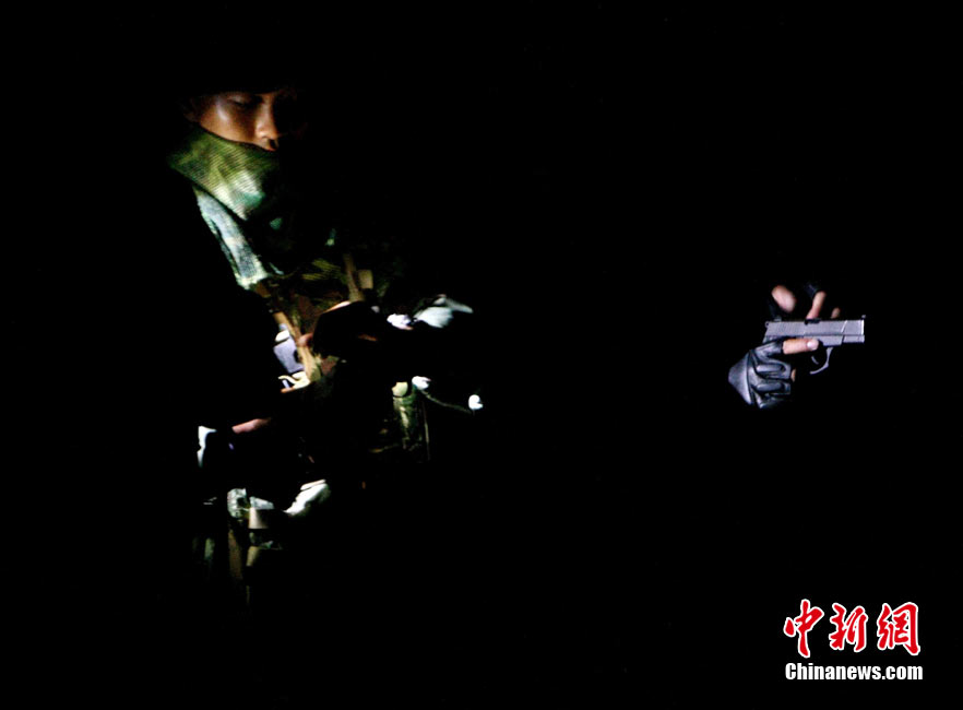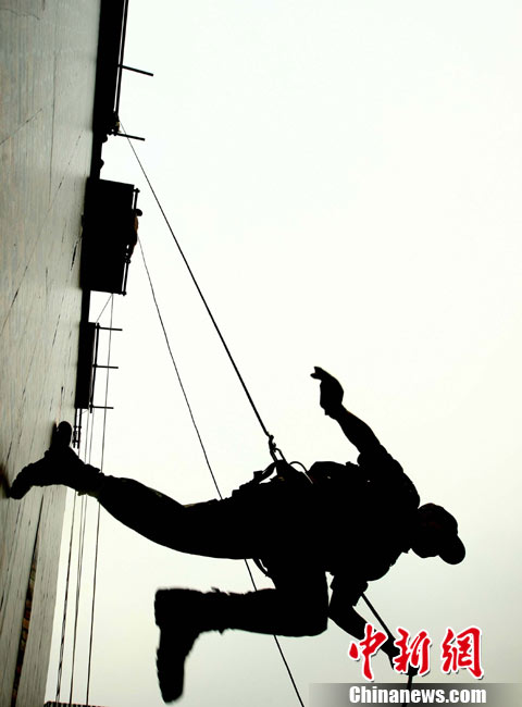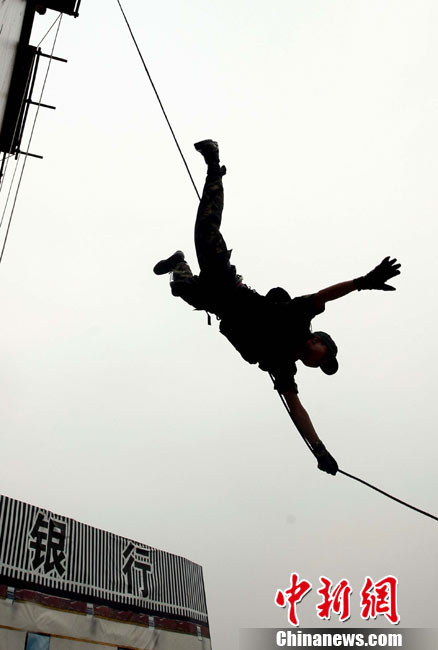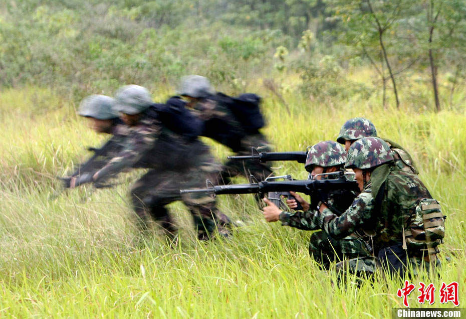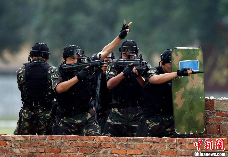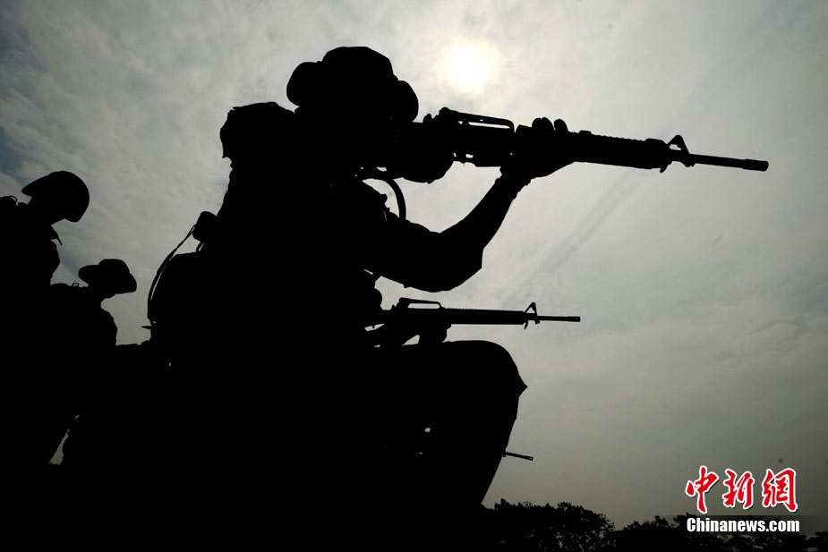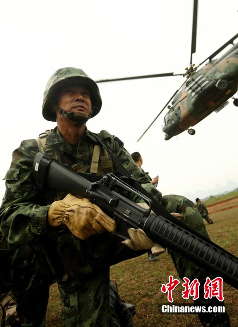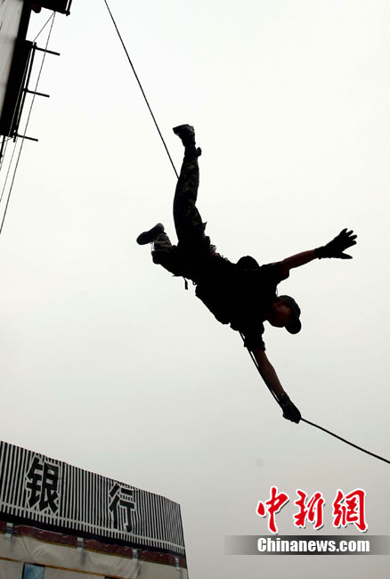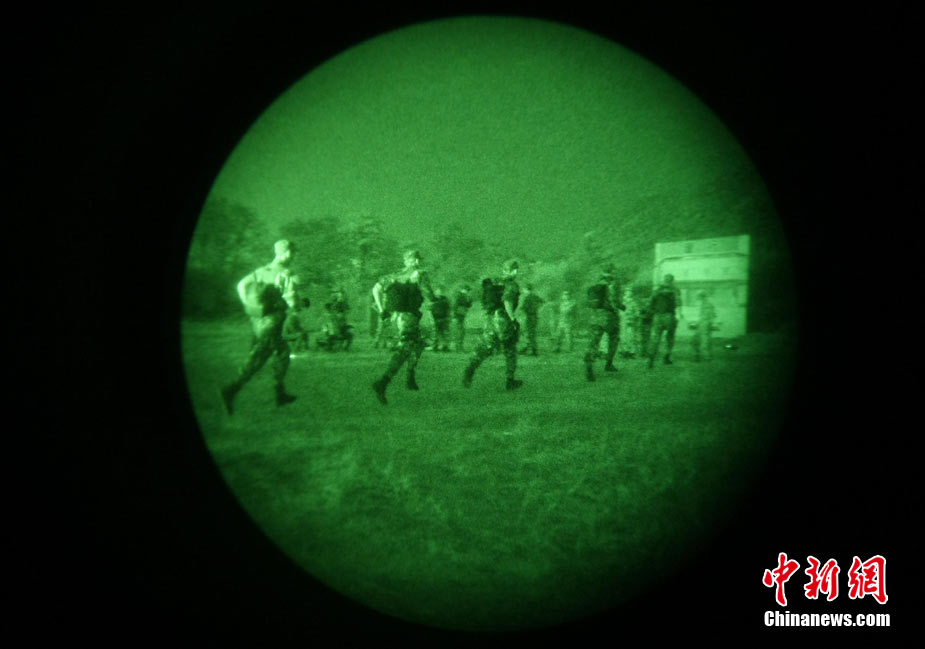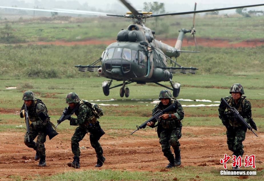 10月8日,中国、泰国两军特种部队“突击—2010”反恐联合训练在广西桂林拉开帷幕,这是两国之间举行的第三次陆军联合训练。分析人士指出,这次联训将进一步巩固两军关系,提高联合反恐作战能力,利于维护地区和平稳定。此次联训为期15天,这是中泰两国陆军首次就城市反恐课题开展联训。图为中国参训部队在开幕式上表演房屋突击。中新社记者 杜洋 摄