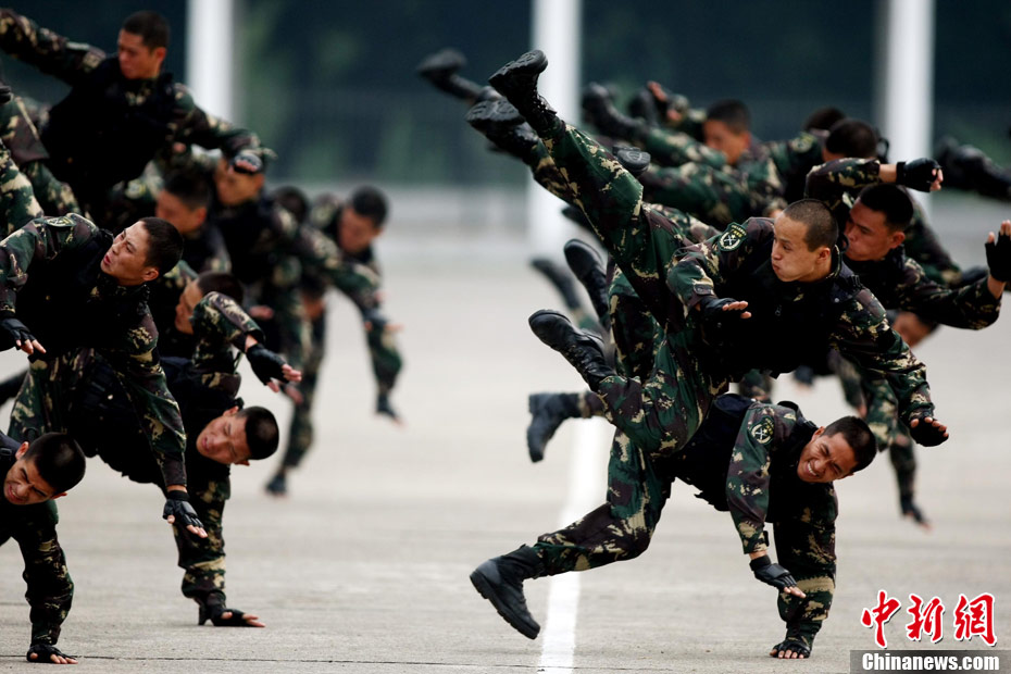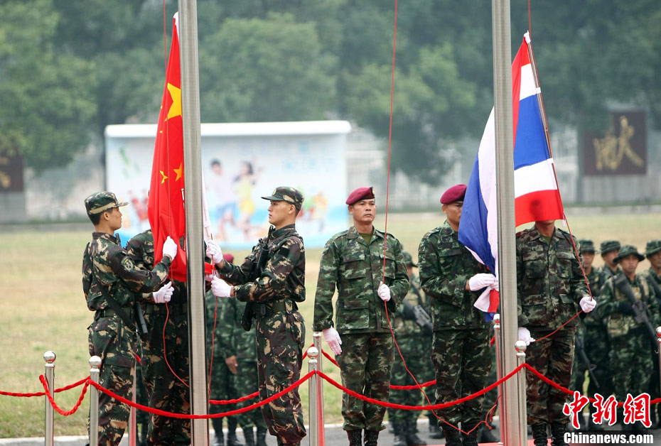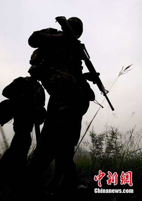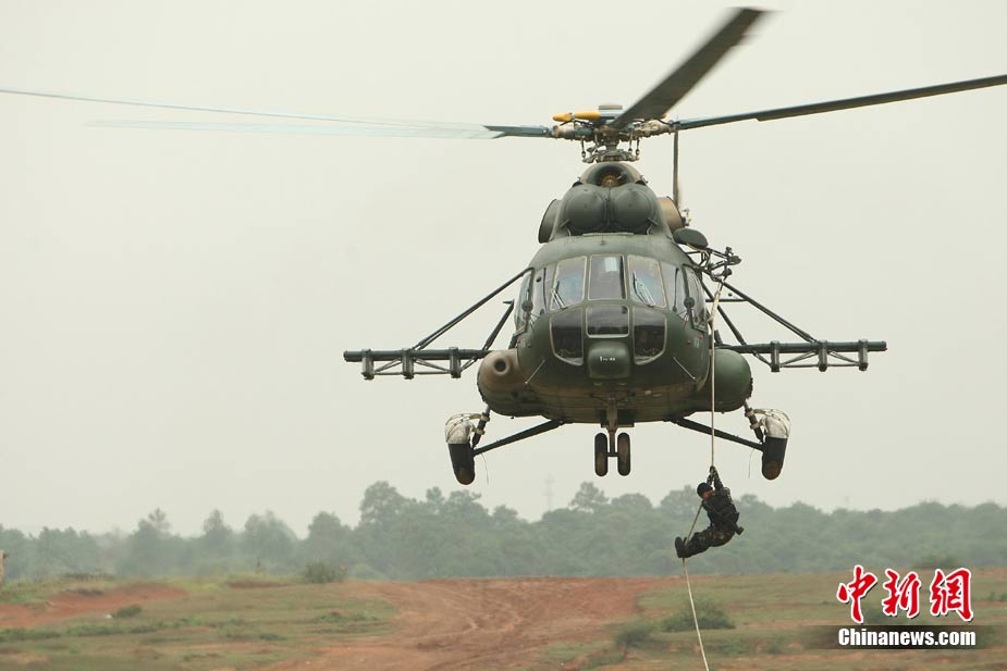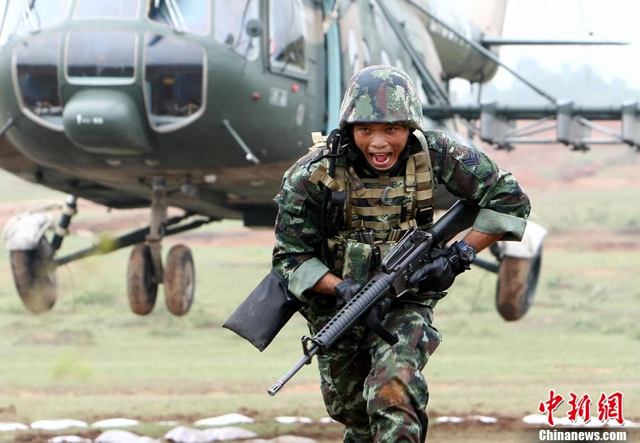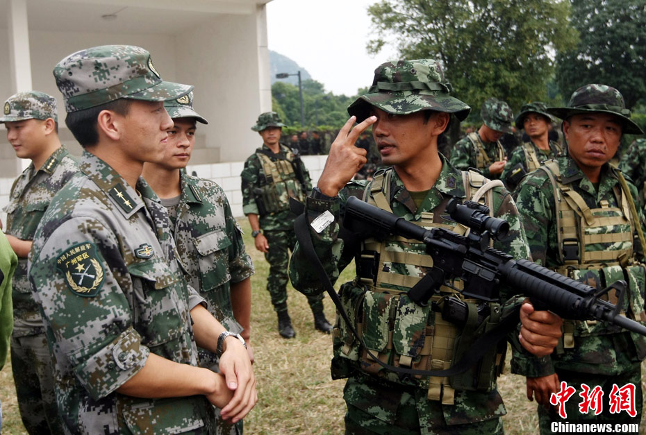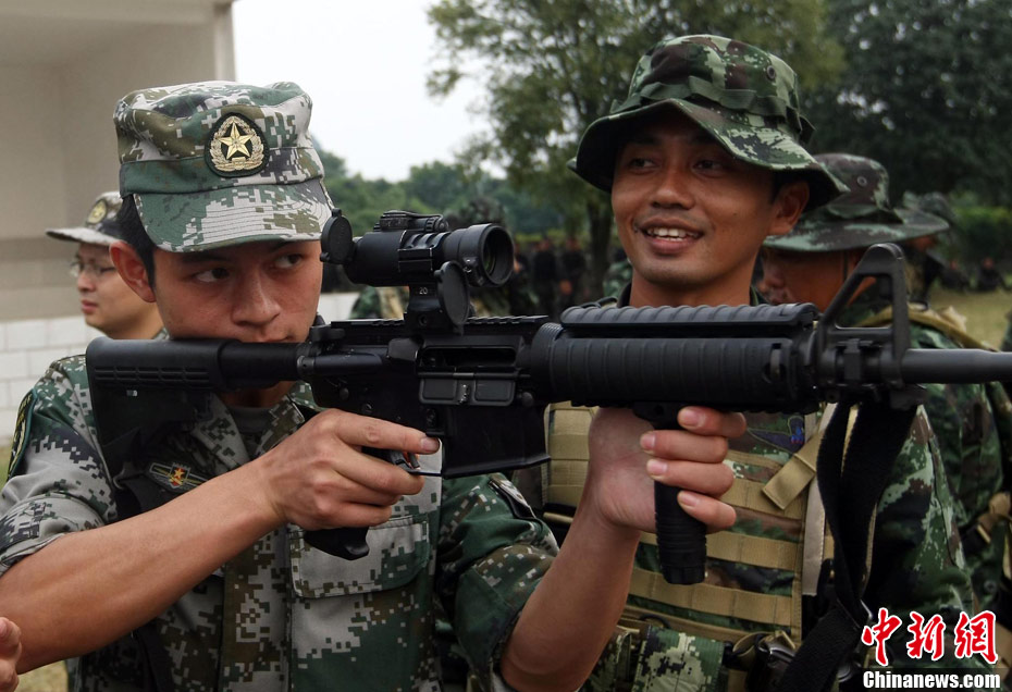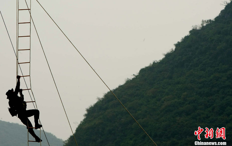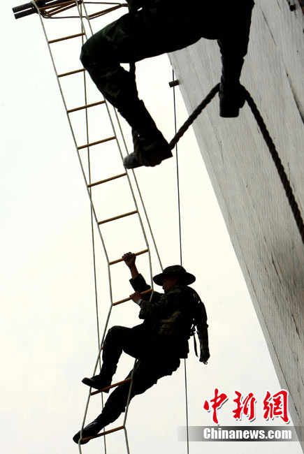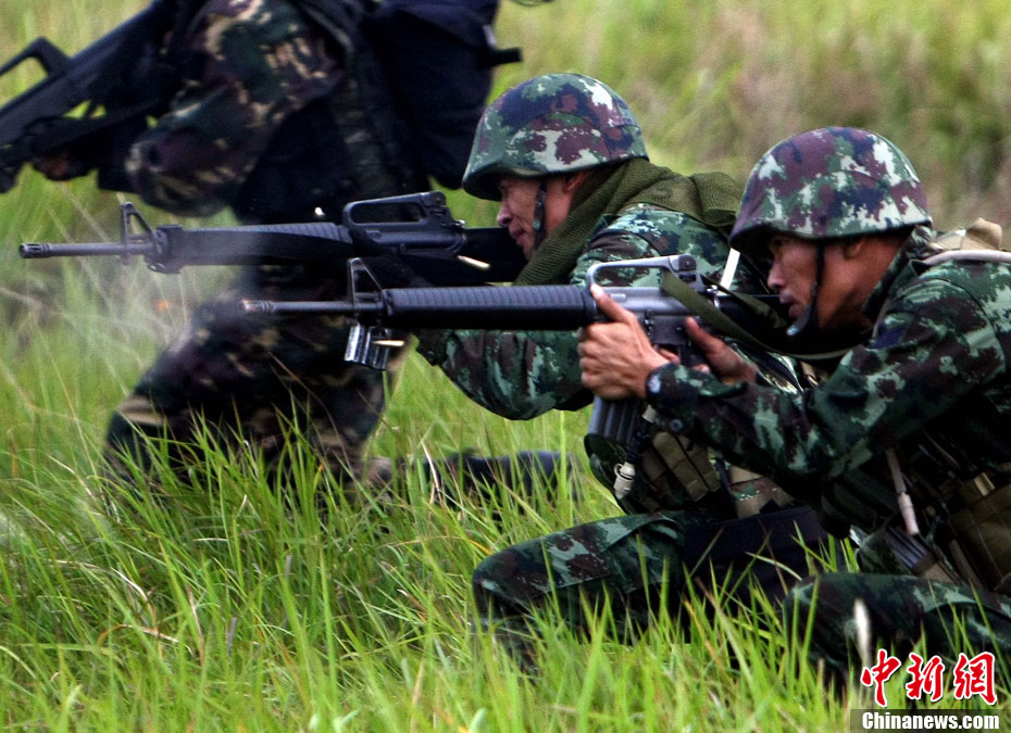10月8日,中国、泰国两军特种部队“突击—2010”反恐联合训练在广西桂林拉开帷幕,这是两国之间举行的第三次陆军联合训练。分析人士指出,这次联训将进一步巩固两军关系,提高联合反恐作战能力,利于维护地区和平稳定。此次联训为期15天,这是中泰两国陆军首次就城市反恐课题开展联训。图为中国参训部队在开幕式上表演房屋突击。中新社记者 杜洋 摄