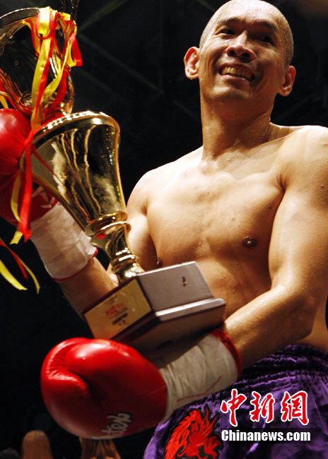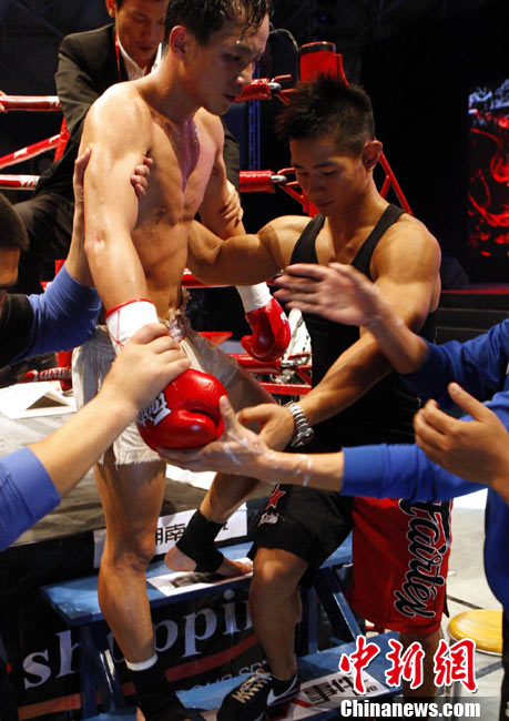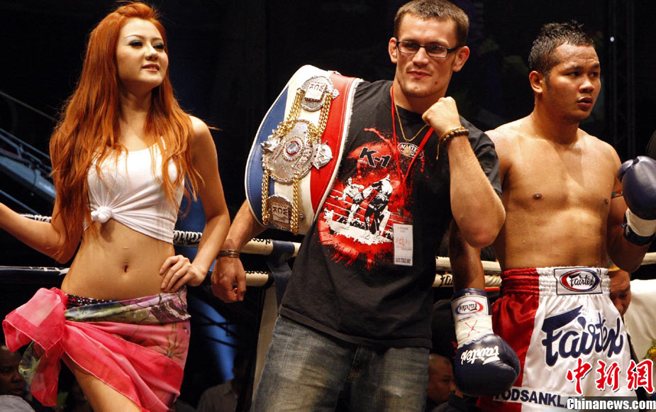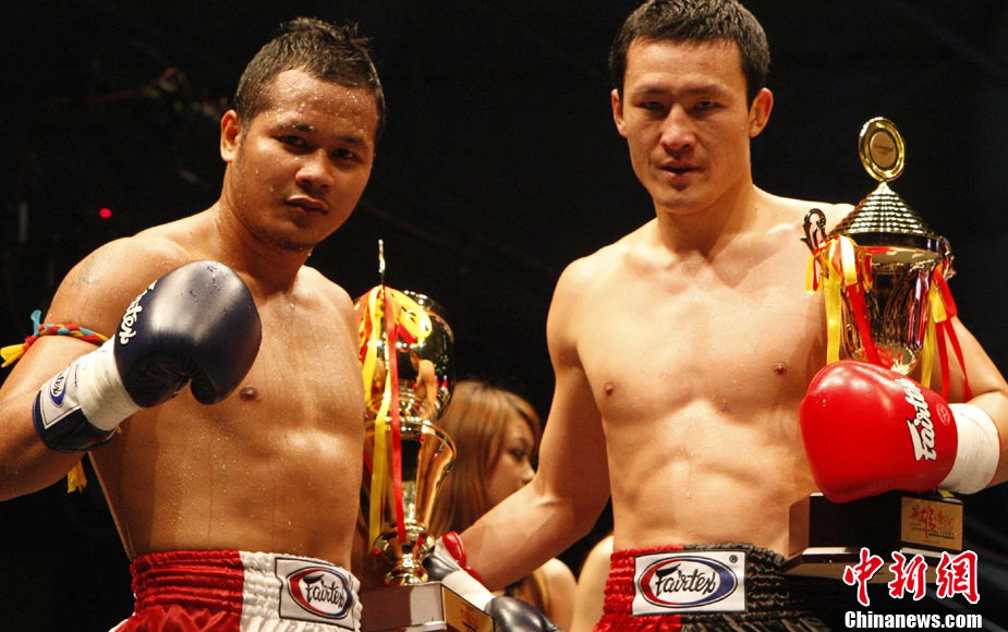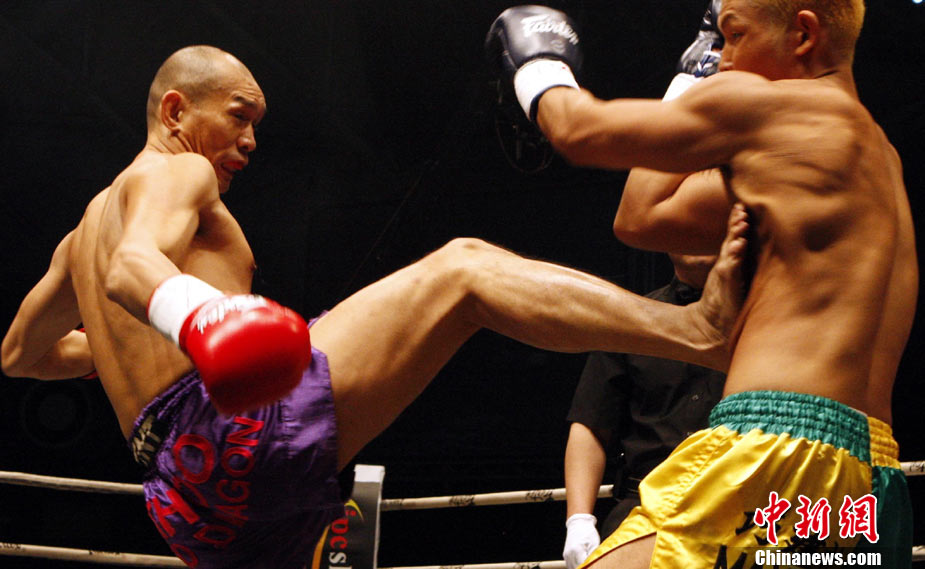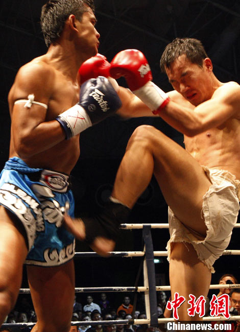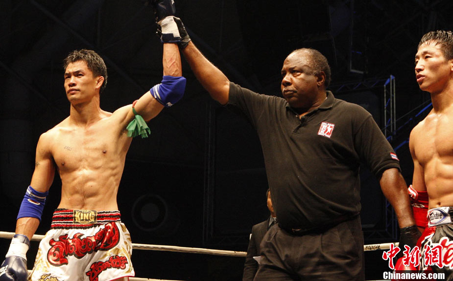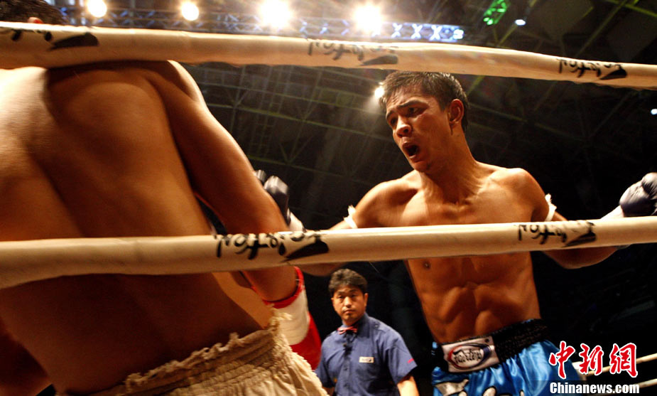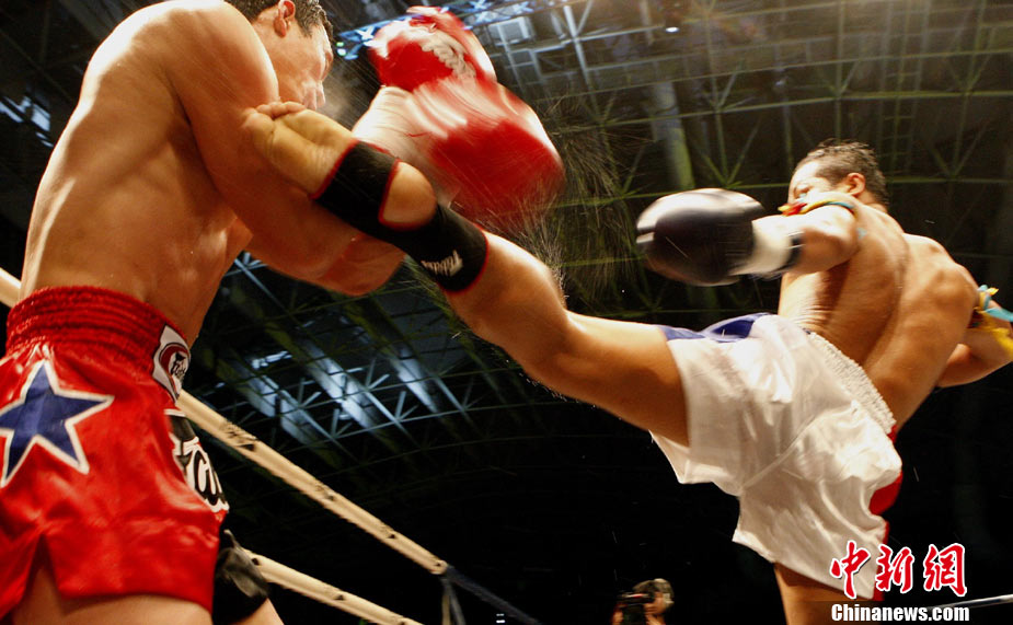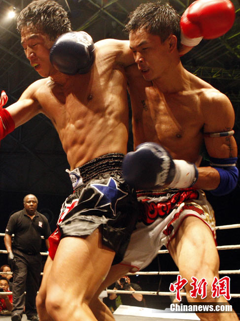 10月9日晚,由马来西亚IPC国际集团和中国国际文化传播中心以及英雄传说赛事机构联手主办的“英雄传说-决战云顶”世界搏击王者争霸赛暨中泰拳王争霸战在马来西亚吉隆坡云顶举行。图为泰国拳王雅桑克莱与中国王冠对决。 中新社记者 钱兴强 摄