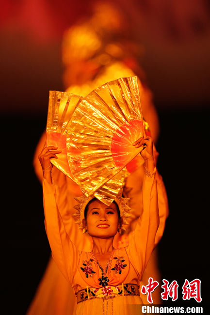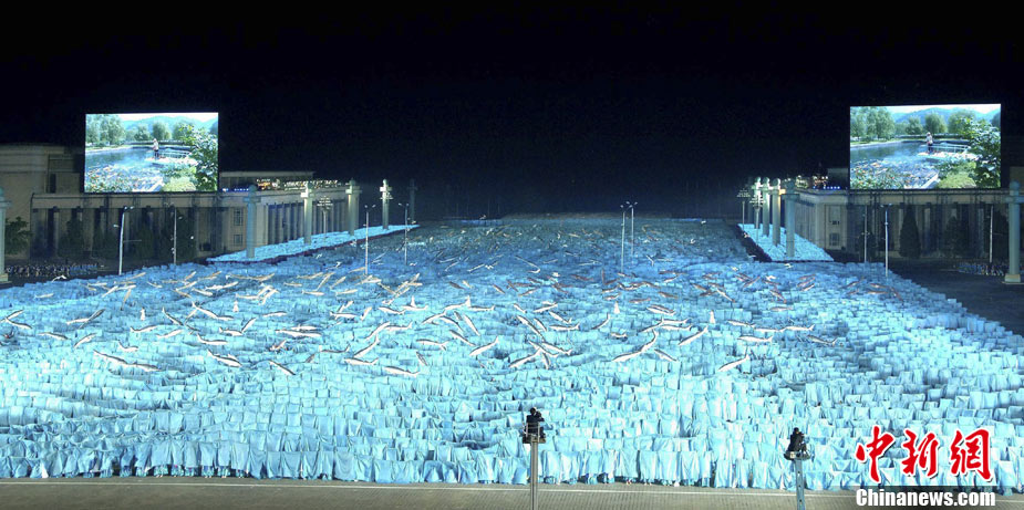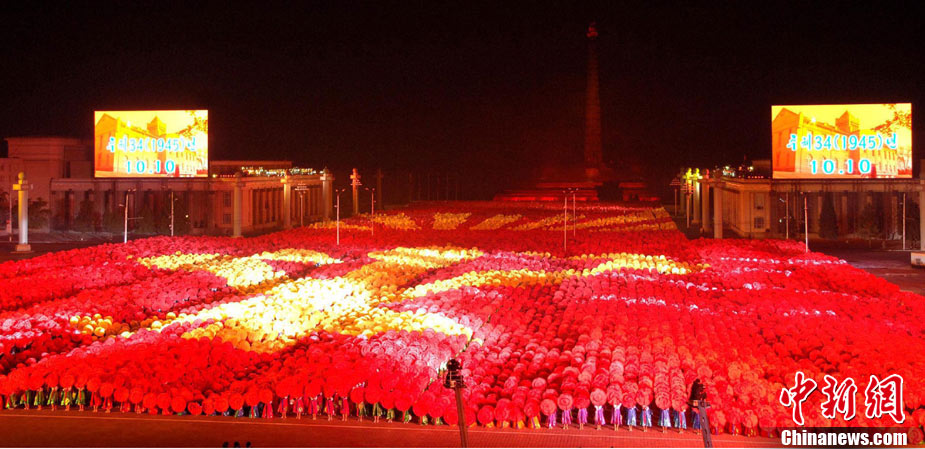 10月10日晚,朝鲜首都平壤举行庆祝劳动党建党65周年盛大联欢晚会。图为晚会现场。