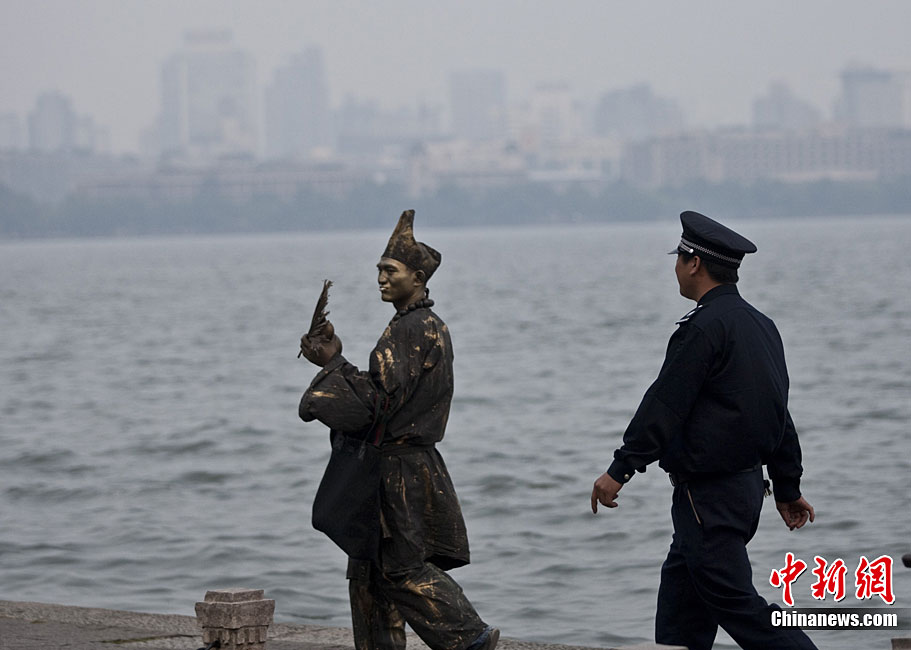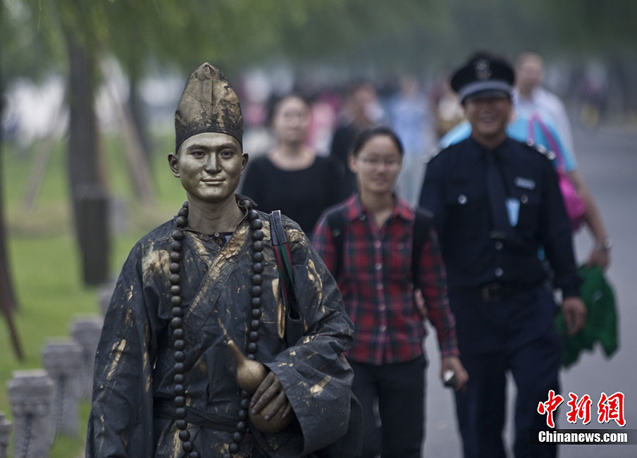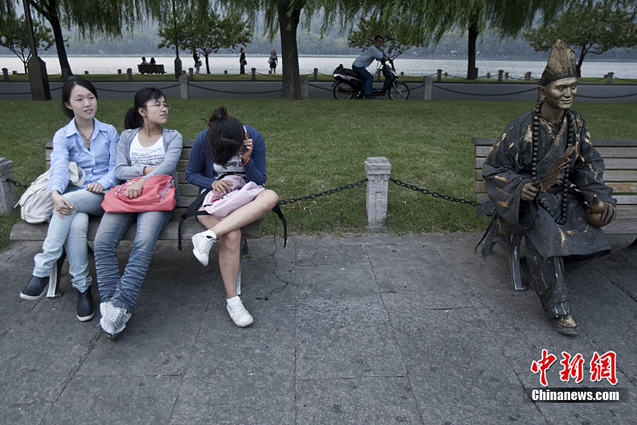 2010年10月上旬,一名打扮成济公模样的人在浙江省杭州市西湖白堤和游客合影,“济公”身上涂满了铜颜色的彩绘,看上去像雕塑一样。据悉,这位20多岁“济公”来自江苏,从今年春天开始扮成“济公”,在全国游走。和他合影需要交5元钱。许康平 摄 图片来源:cnsphoto