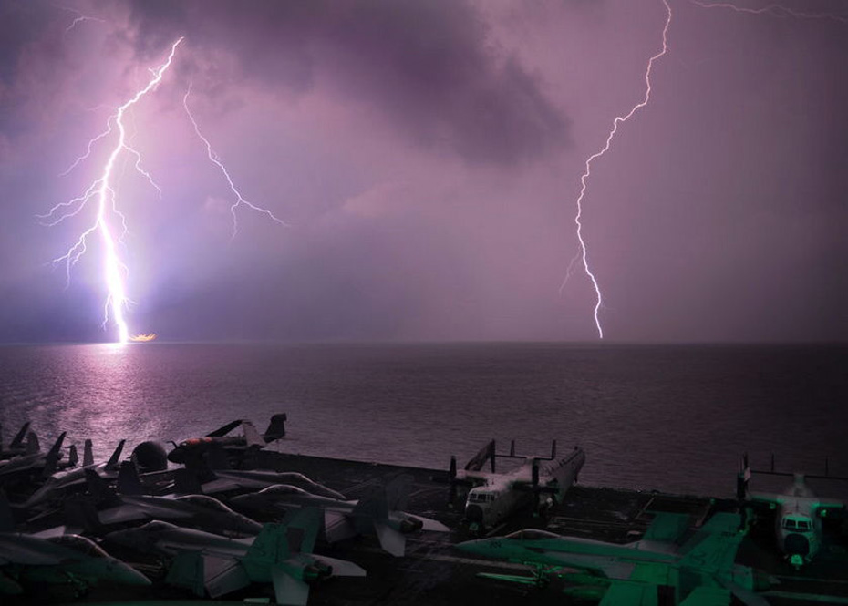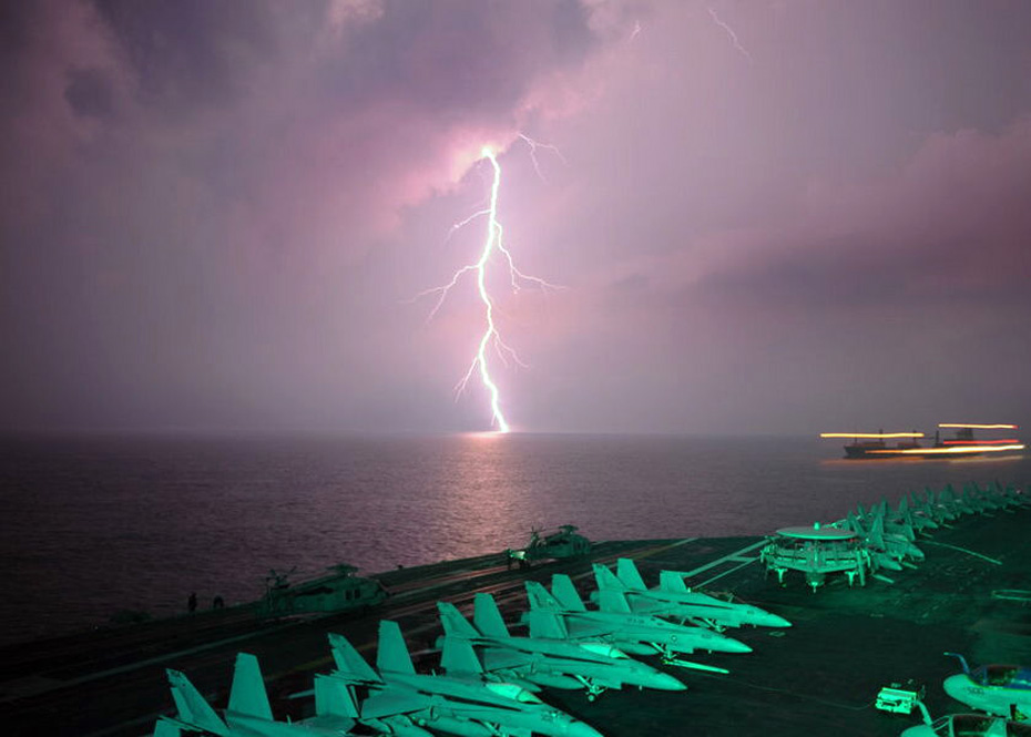 2010年10月8日,美国海军林肯号航母途径马六甲海峡,不远处电闪雷鸣。图片来源:环球网