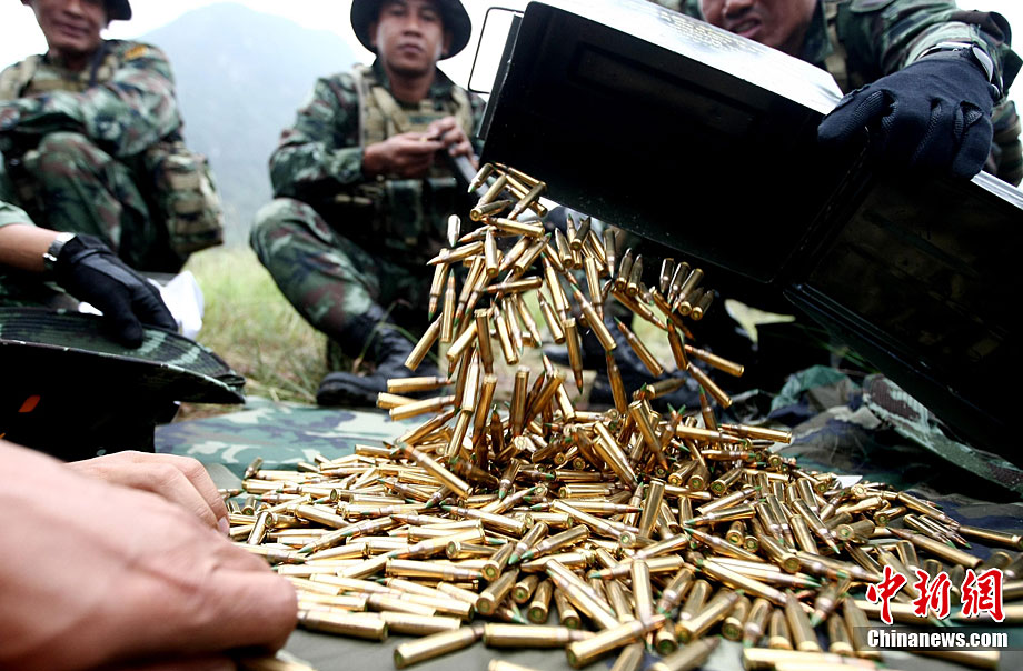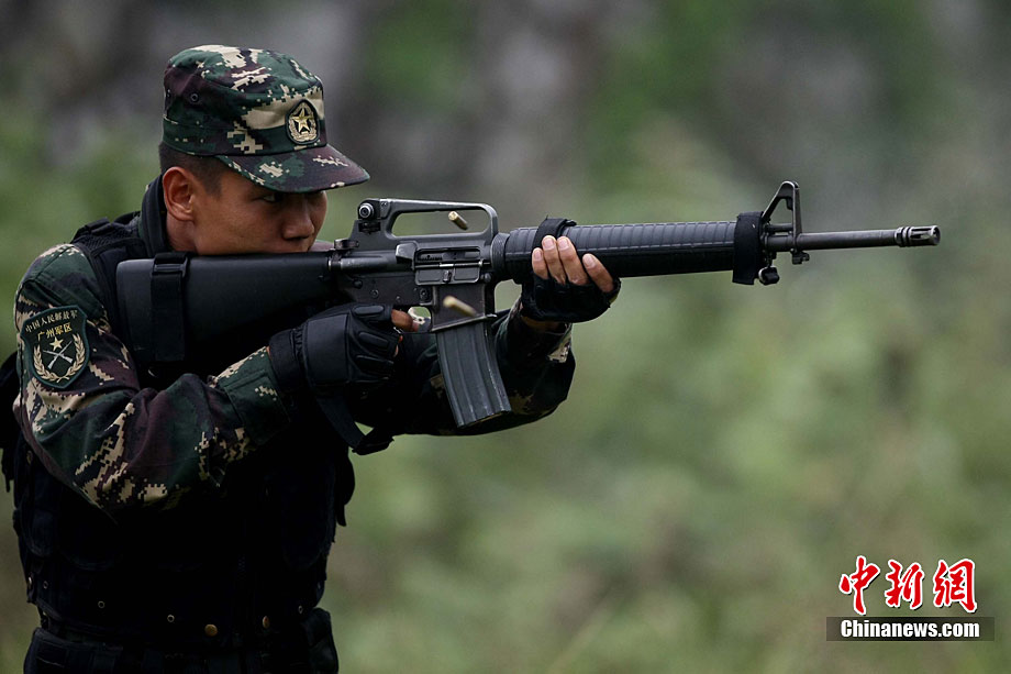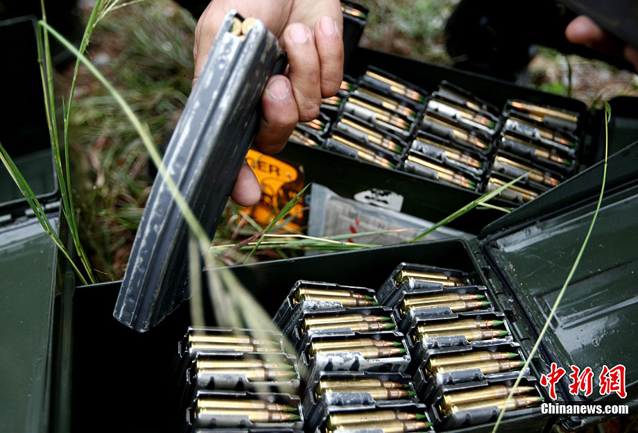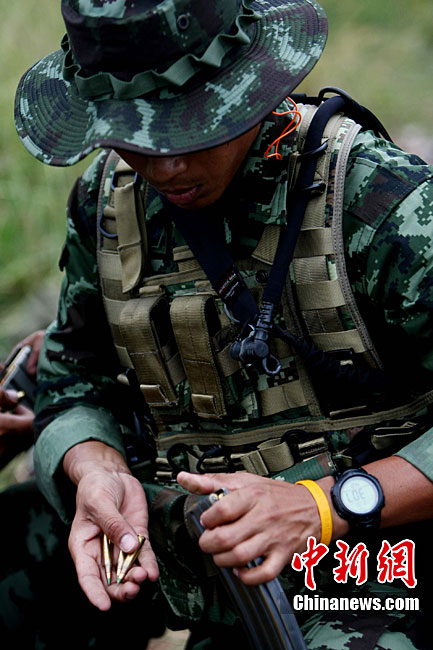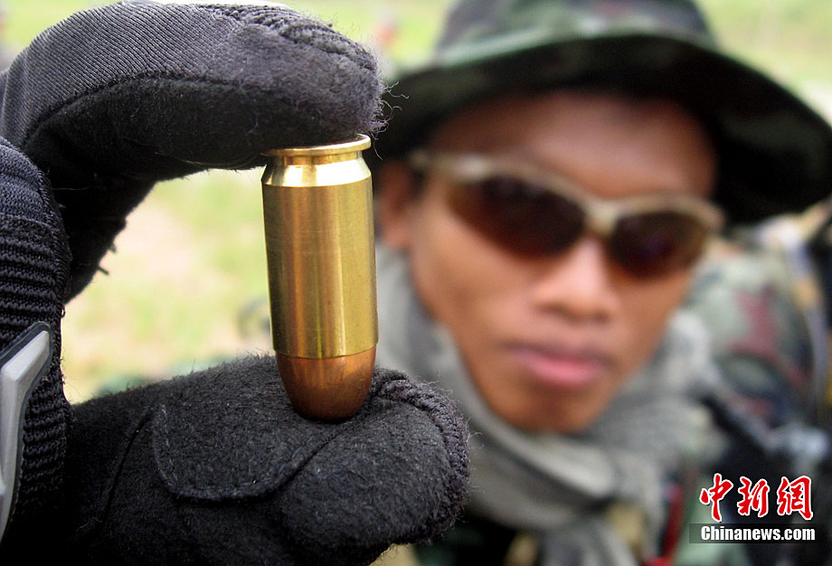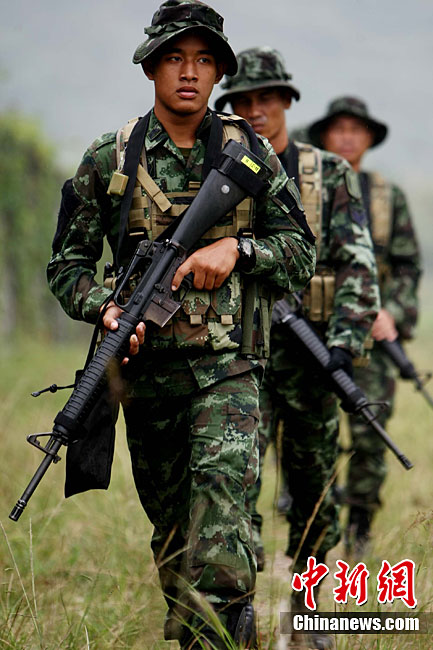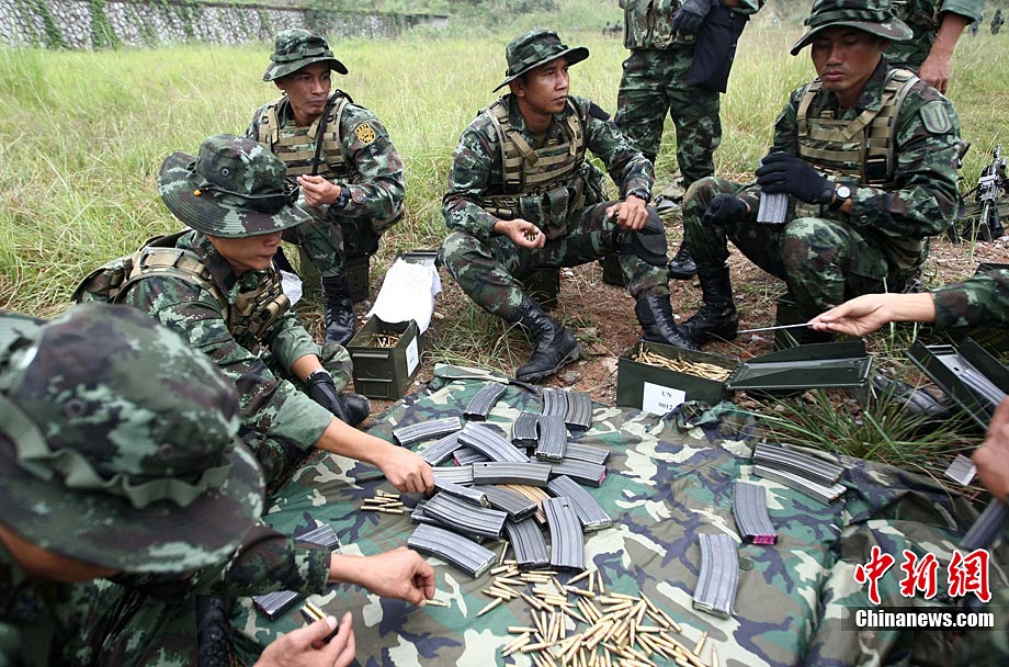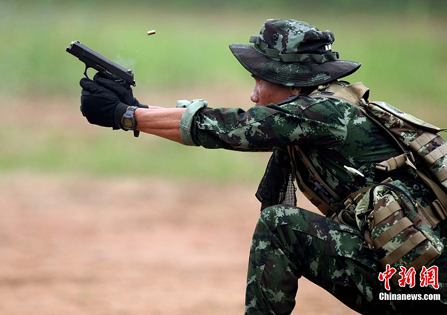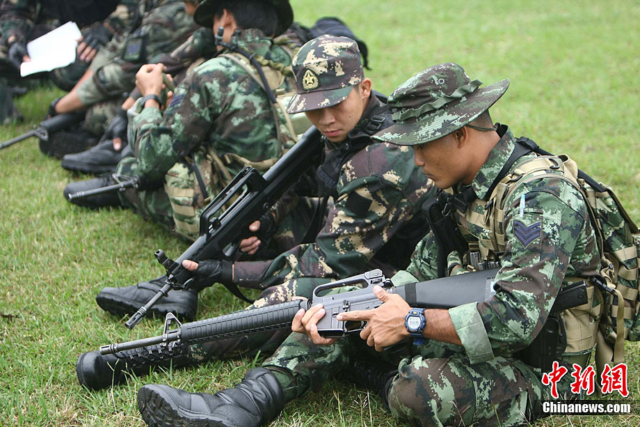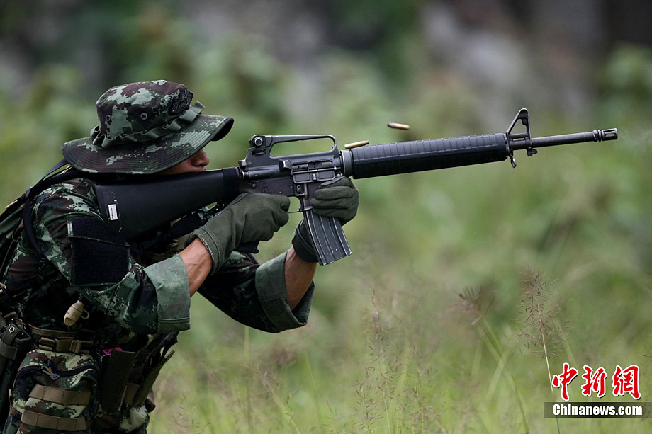 “突击-2010”中泰陆军特种部队反恐联合训练10月6日至20日在广西壮族自治区桂林进行。中泰双方将各派出60余人的特种分队参加训练。此次联合训练分展示交流、混编同训和综合演练三个阶段,主要围绕城市反恐基础技能训练、混编分队战术训练等科目进行。图为泰方队员M16步枪实弹速射。中新社记者 杜洋 摄