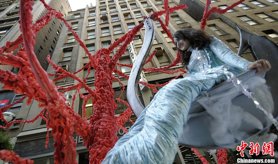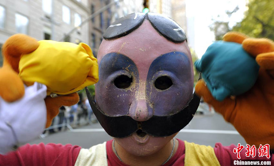 来自意大利剧木偶奇遇记的剧成员在纽约曼哈顿第五大道进行街头表演。