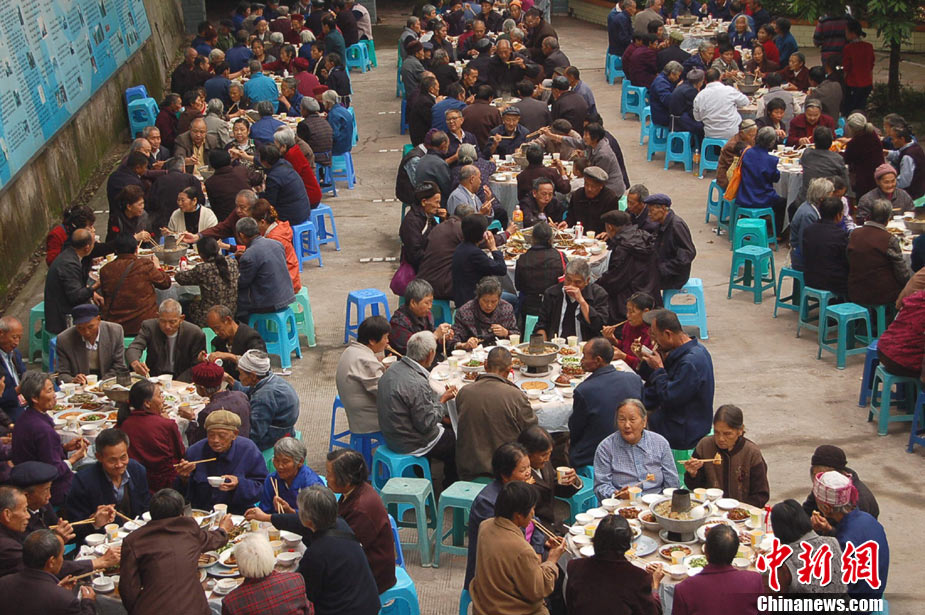 10月13日,重阳佳节将至,1200位老人在四川宜宾县九彩虹农家乐参加重阳千叟宴。为老人摆下120桌宴席过节的是全国劳模李兴海,从2001年起,每年重阳节,他都会邀请喜捷镇及周边的老人,摆上几十桌丰盛的“九大碗”宴席,并送上慰问品。中新社发 谢庆 摄