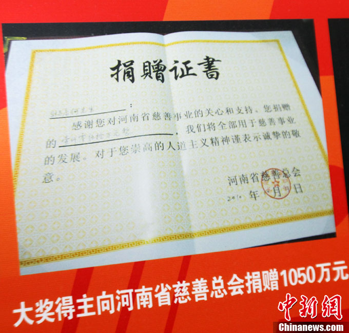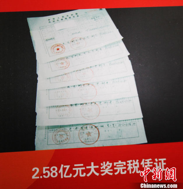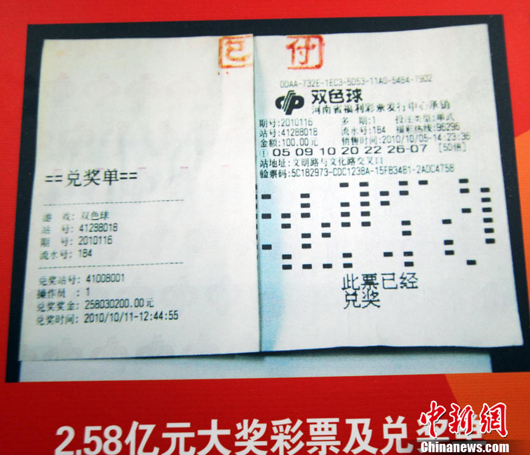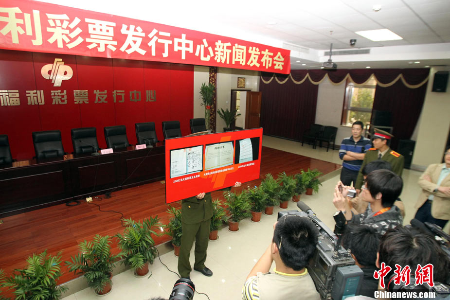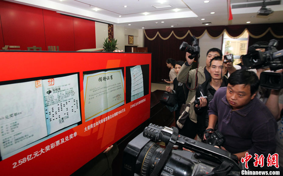 10月13日,河南福彩中心召开新闻发布会通报双色球2.58亿兑奖情况,2.58亿巨奖彩票在发布会上曝光。巨奖于本周一被兑取,得主是一位长期从事教育职业的驻马店本地人,他的大奖为机选1注后50倍投,他将捐款1050万,为目前中国彩市大奖得主单笔最高捐款。2.58亿是继2009年安阳彩民获3.59亿后,河南彩民揽获的又一个超级巨奖。中新社记者 王中举 摄