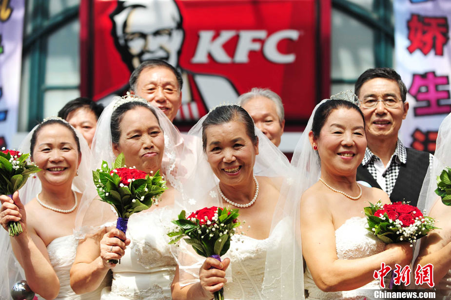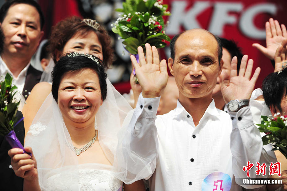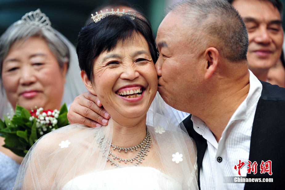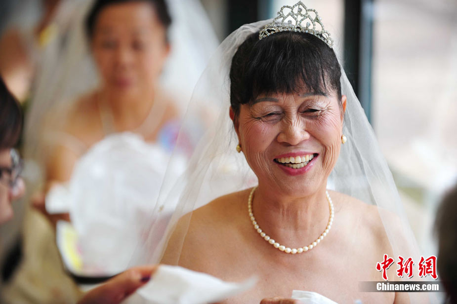 10月14日,由深圳某公司组织的老人披婚纱圆梦公益活动在东部华侨城举行,30对结婚30年以上的老人在此欢聚一堂喜度重阳。中新社记者 陈文 摄