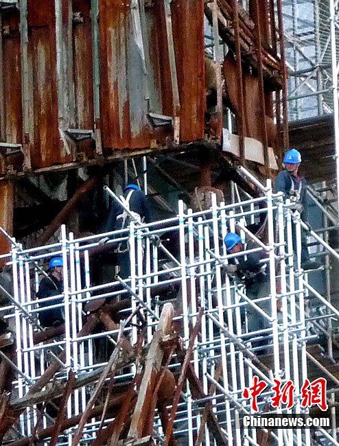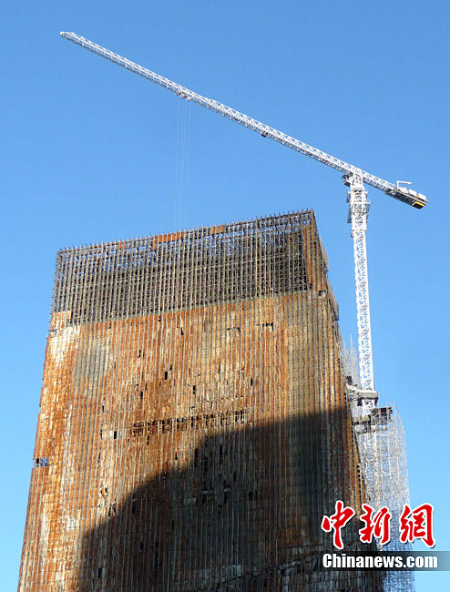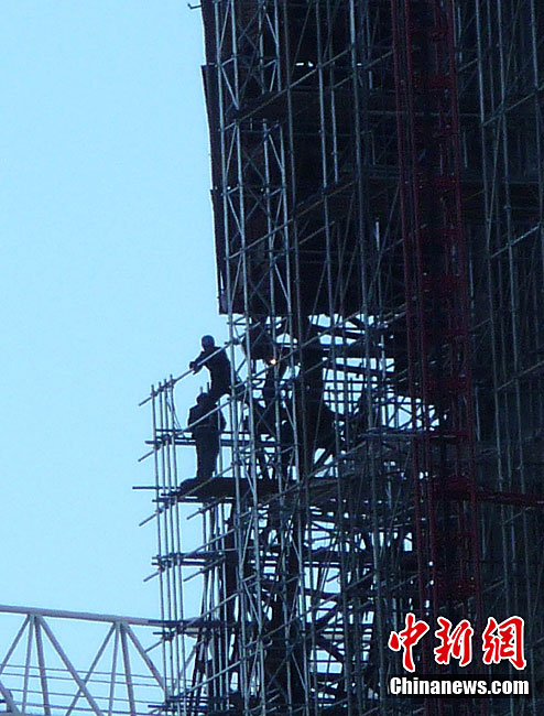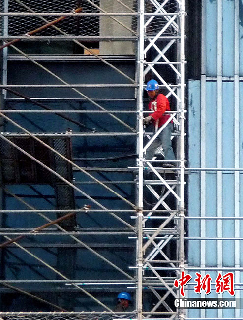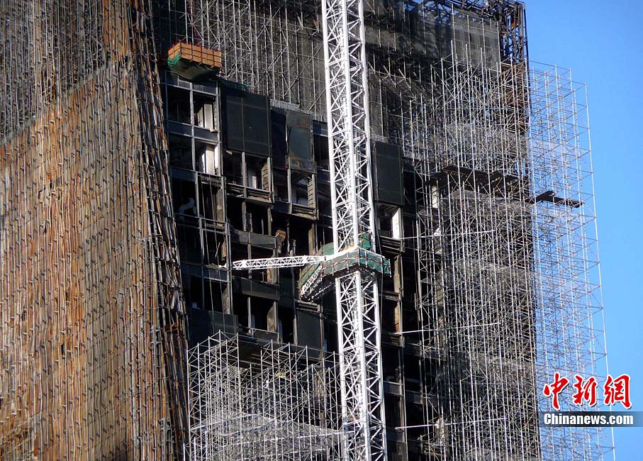 10月14日,北京央视新址,过火楼四周已开始搭起脚手架,更换外立面。与此同时,施工方已开始拆除被烧毁的合成玻璃,下月起全部更换。2009年元宵节,未交工的央视新址北配楼曾燃大火,2010年8月该楼开始启动整修。祥云 摄 图片来源:cnsphoto