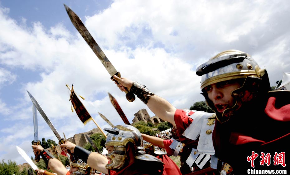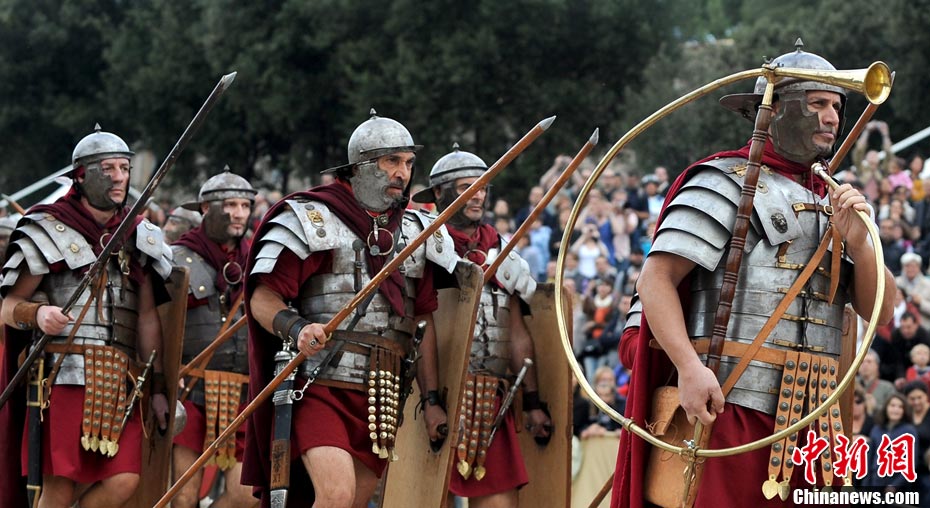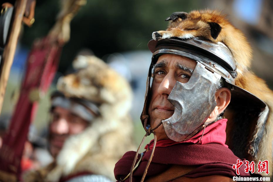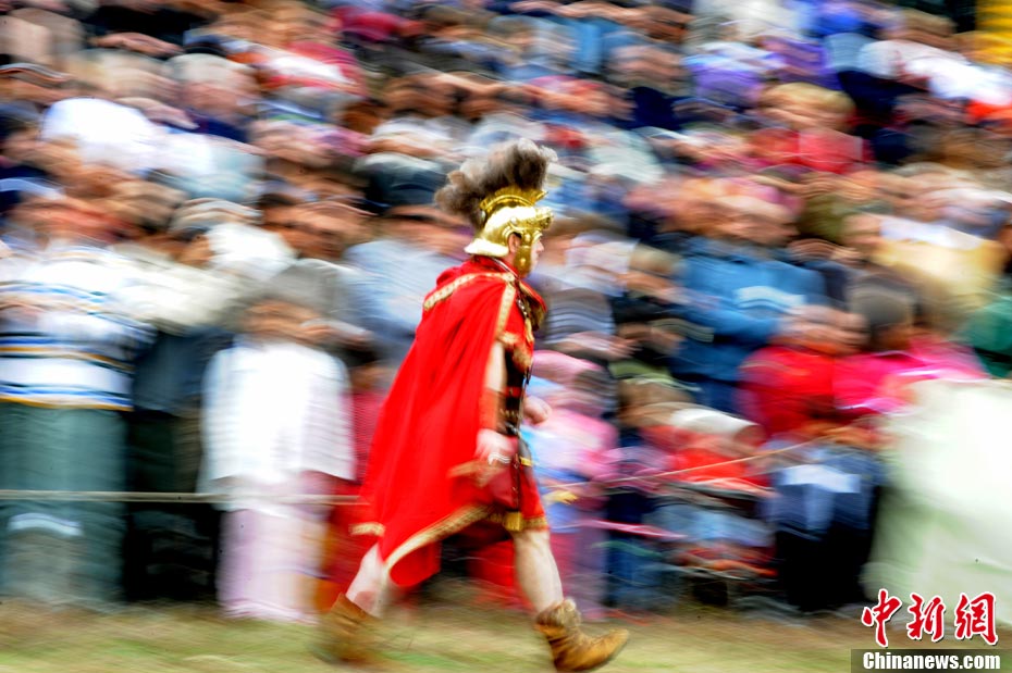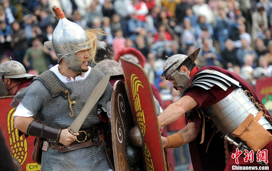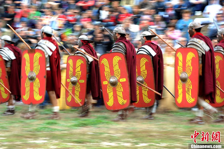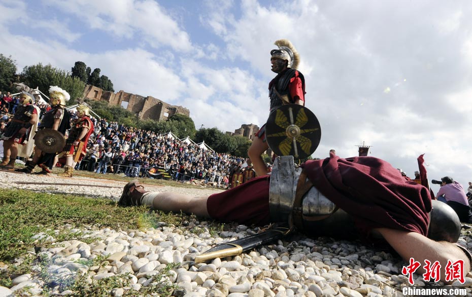 当地时间2010年10月17日,意大利罗马的历史爱好者和演员们再现了“古罗马军团”和凯尔特人战斗的场景,表演吸引了大批观众到场观看。
