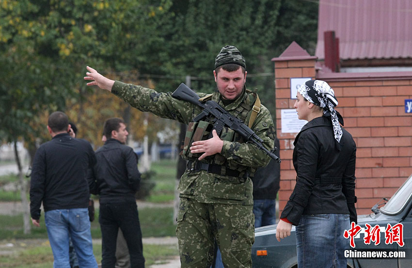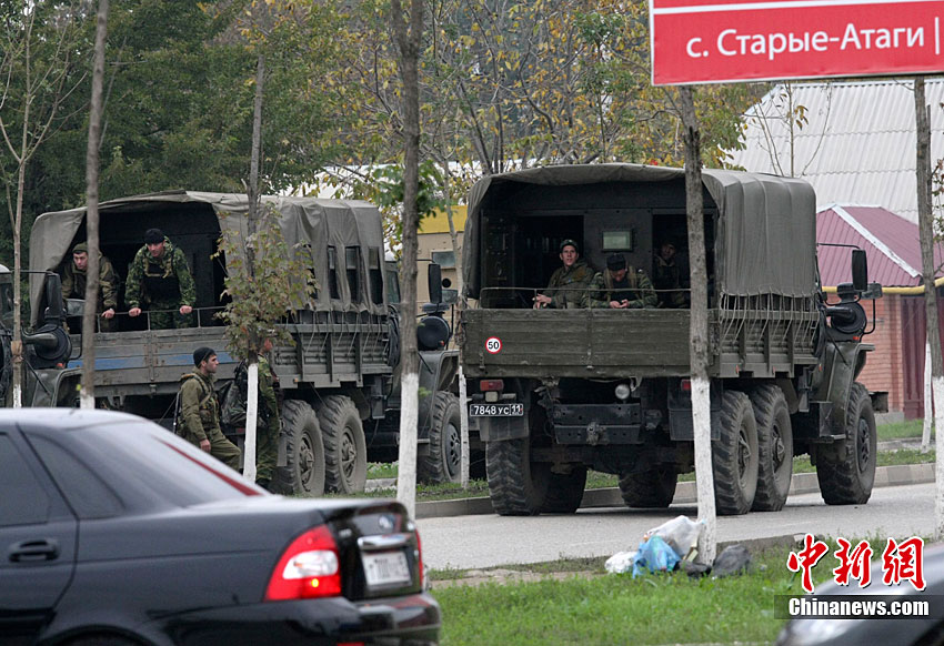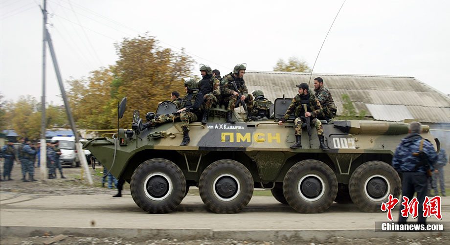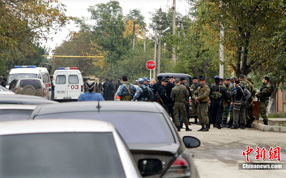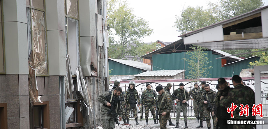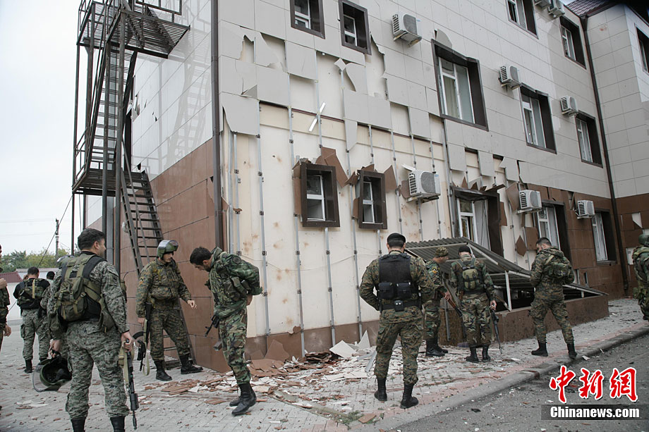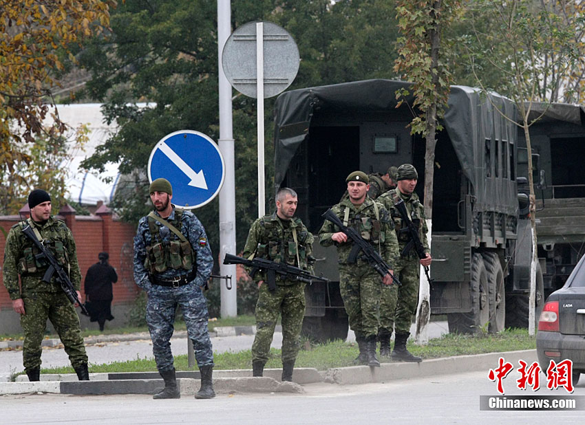当地时间10月19日,俄罗斯车臣共和国首府格罗兹尼市列宁区的车臣议会大楼遭到武装分子袭击,造成2人死亡。图为安全部队在消灭完袭击份子后,准备撤离议会大楼。
