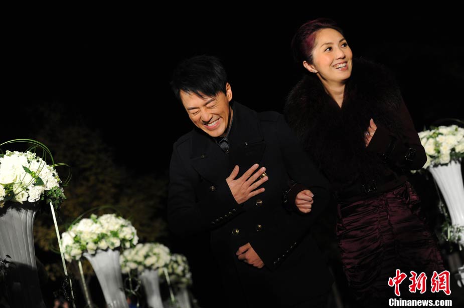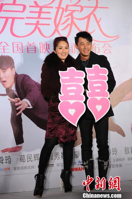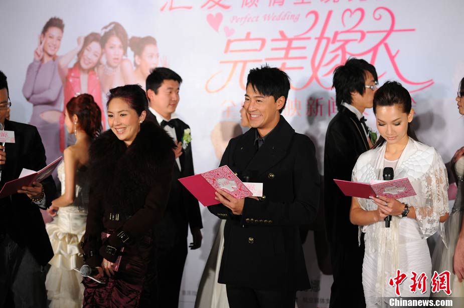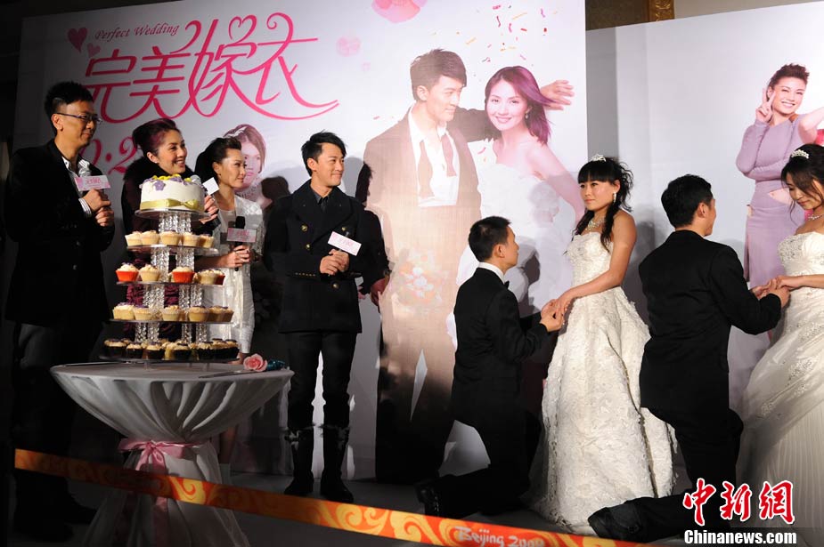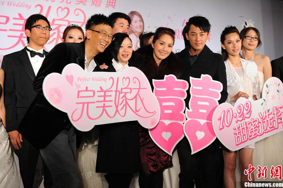10月19日,都市爆笑浪漫爱情喜剧《完美嫁衣》在北京举行了隆重而特别的首映仪式。影片导演黄真真、监制郑丹瑞、主演杨千嬅、林峰、徐子珊共同亮相。仪式在一座结婚礼堂举行,杨千嬅和林峰在现场为当日举行婚礼的9对新人做证婚人,与在场的众多媒体一起见证了9对新人浪漫感人的婚礼。影片主创们希望年轻男女们最终都可以像电影中的男女主角一样获得那份真爱。影片将于10月22日上映。图为(前排左起)监制郑丹瑞、导演黄真真、主演杨千嬅、林峰、徐子珊。中新社记者 李学仕 摄