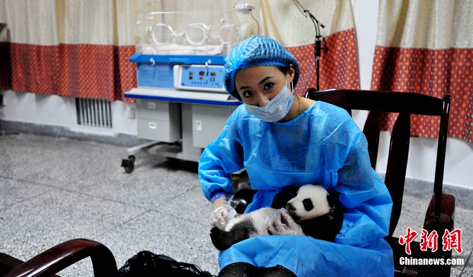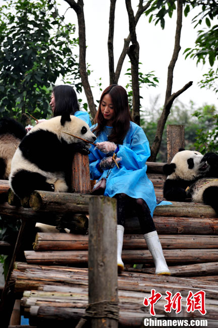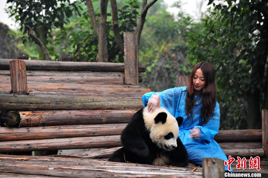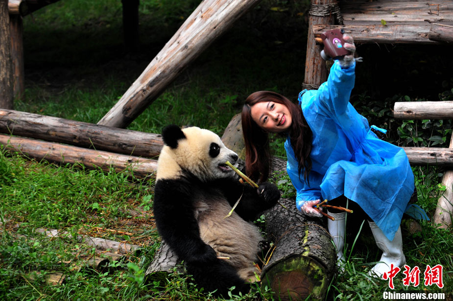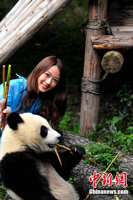 来自中国台北的大熊猫守护使王郁文自10月8日正式进入成都大熊猫繁育研究基地履职以来,开始了为期1个月绝无仅有的体验,与成都熊猫零距离亲密接触到月底。全球海选中脱颖而出的台大校花---王郁文在留任成都1个月里,将参与配对明星熊猫的饲养工作如喂食、打扫卫生、行为观察,学习熊猫厨师工作,参与照顾1岁幼年大熊猫,义务给中外游客讲解熊猫保护;还将前往龙溪-虹口自然保护区,参与大熊猫痕迹识别与追踪(爪痕、粪便),以及DNA样品采集制作等,亲眼见证熊猫从出生、成长到放归野外的生命历程。图为王郁文和大熊猫亲密接触。安源 摄