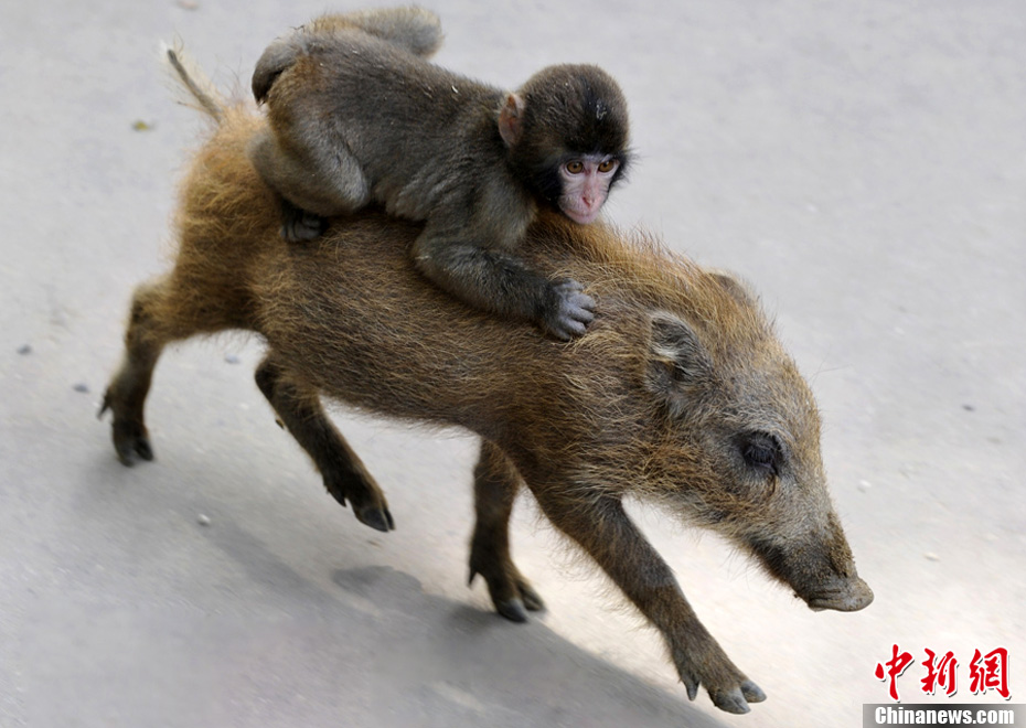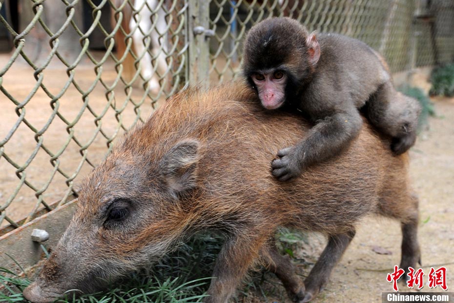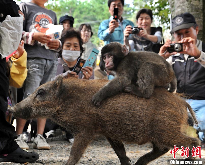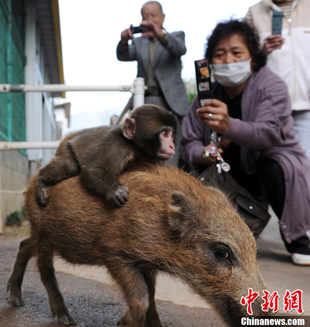 10月19日,日本京都辖区内的福知山动物园里,两只小动物成了大家眼中的明星:名叫Uribo的小公野猪经常驮着小猴子Miwa跑来跑去,吸引大量游客前来观看,并且给它们拍照。他们都是失去了母亲的孤儿,福知山动物园将他们收养。