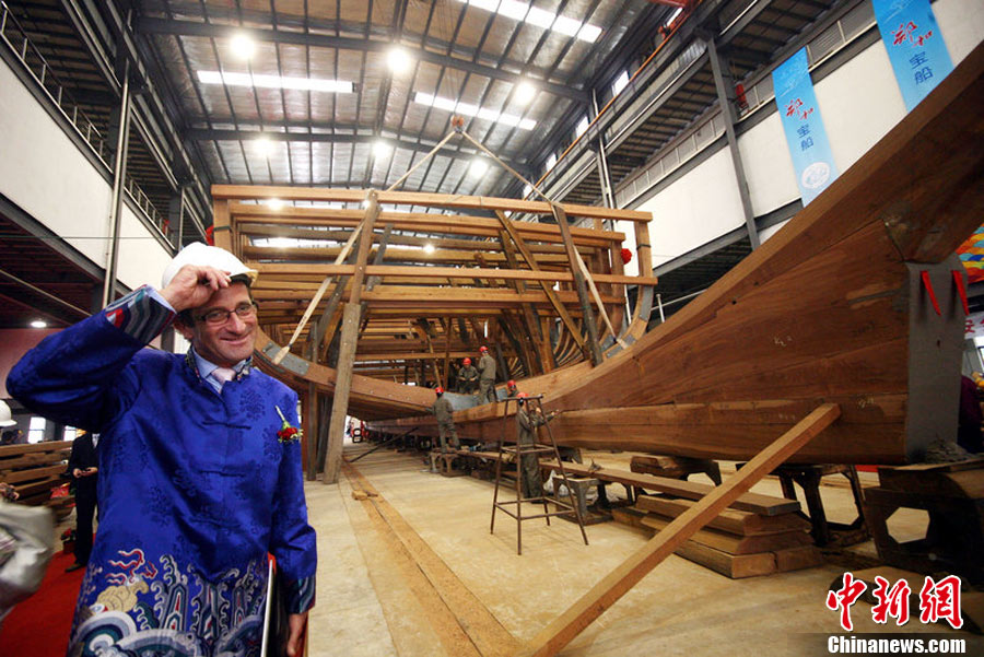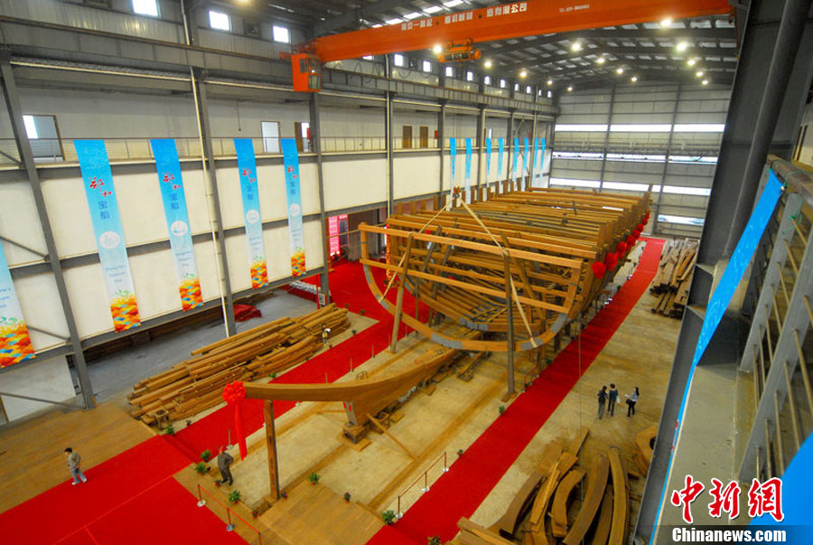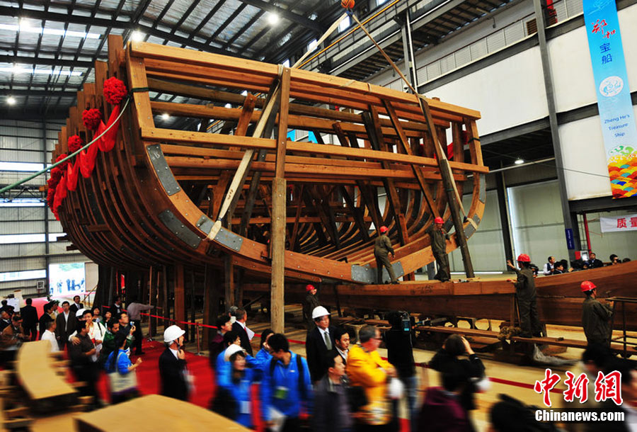10月20日,南京,作为“2010年南京名城会”的序曲,“郑和宝船复建庆典”在郑和宝船厂举行,主体已经完工1/3的“郑和宝船”露出“庐山真面目”。这座郑和宝船将在明年9月船体竣工,2013年将沿着郑和当年的航海路线“环球航行”。图为复建的宝船进行了肋骨安放仪式。邵丹 摄 图片来源:CFP视觉中国