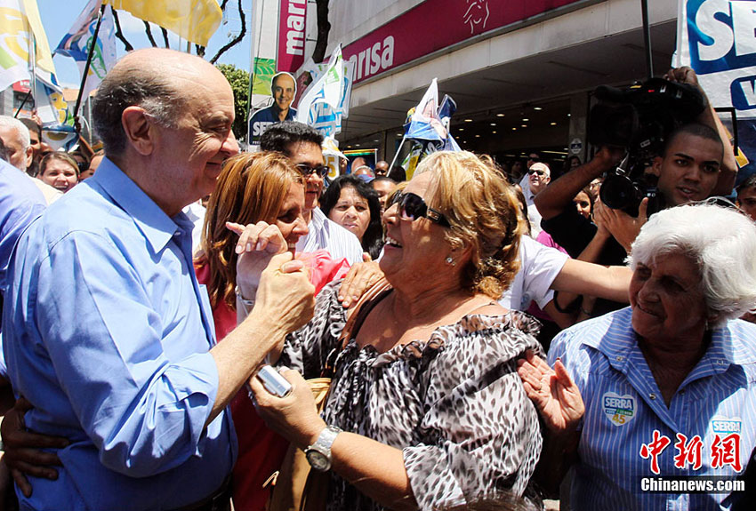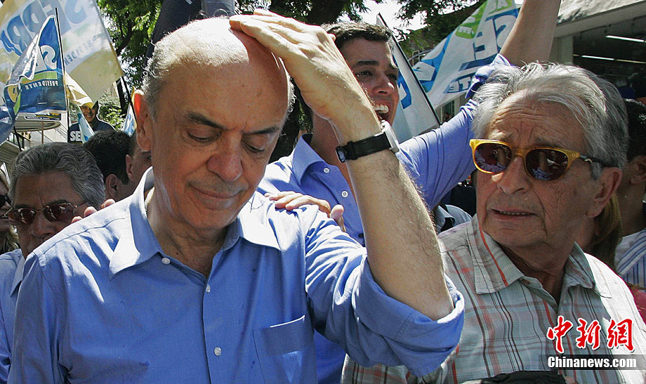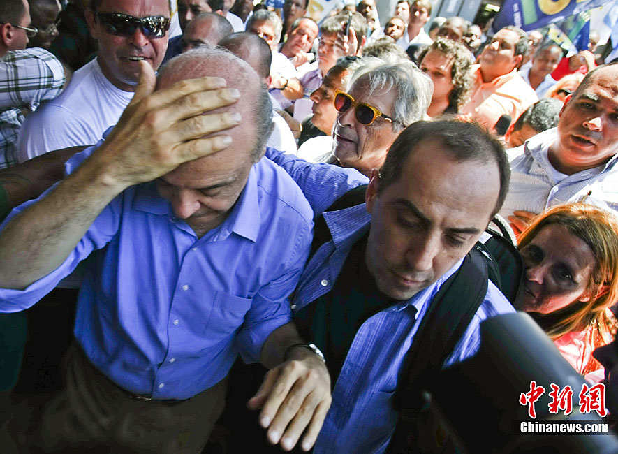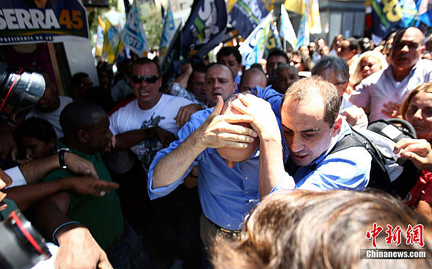 当地时间10月20日,在巴西里约热内卢以西,社会民主党总统候选人若泽·塞拉在参加一场竞选宣传活动时被不明投掷物击中头部,随后在安保人员和支持者的护送下离开了现场。