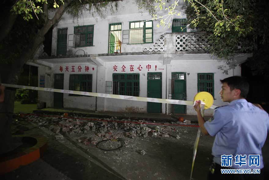 10月21日,警方在发生护栏坍塌事故的教学楼外拉起警戒线。当日下午4时40分左右,广西柳江县洛满镇洛满中心小学一栋两层教学楼二楼走廊护栏发生坍塌事故。截至21日晚9时,共有27名学生坠落不同程度受伤,4人伤势较严重。