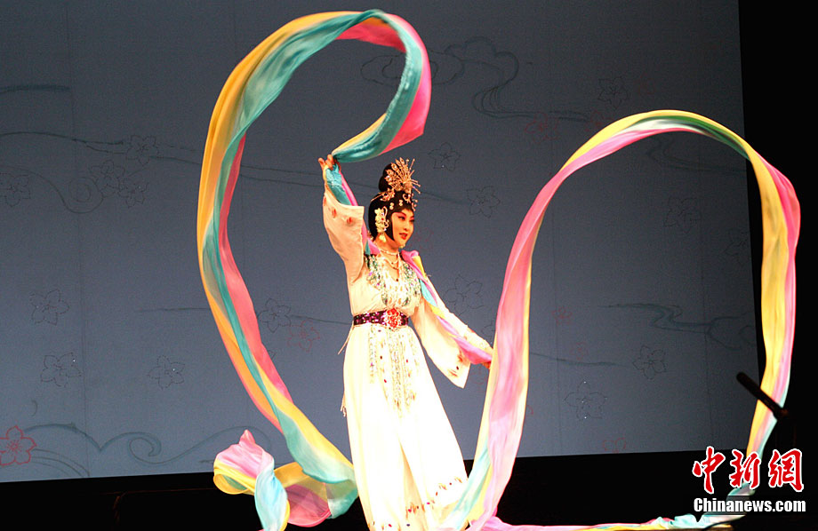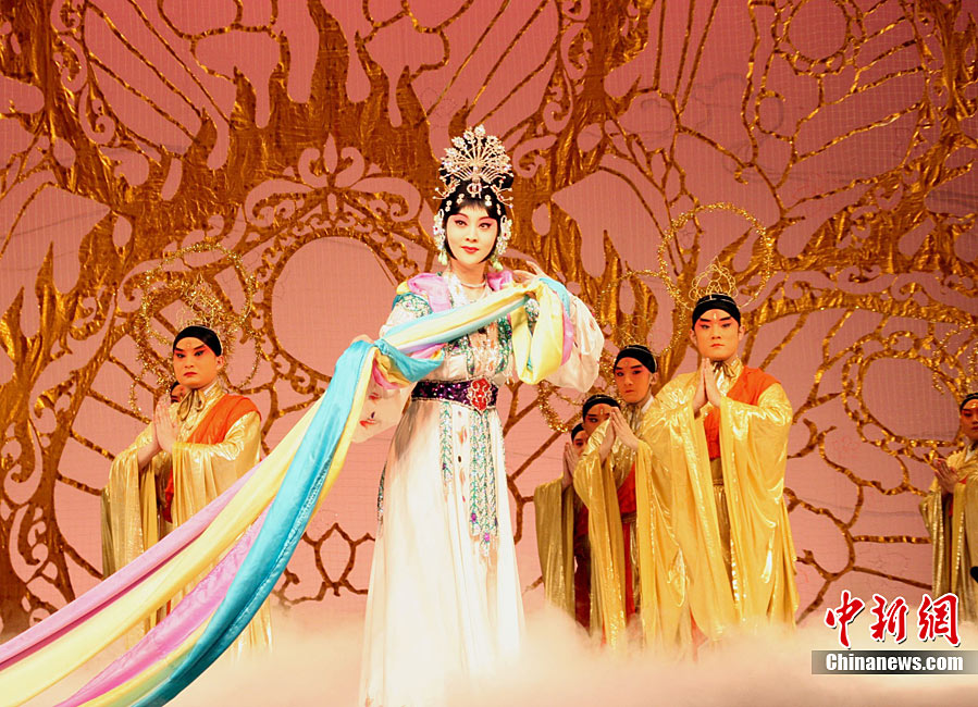 10月22日至11月9日,泰州举行梅兰芳艺术节,旨在弘扬优秀传统文化,振兴京剧艺术,擦亮泰州特色文化品牌,改善文化民生,提升城市形象,建设文化泰州。期间15项主要活动精彩纷呈,有《贵妃醉酒》等国粹京剧名家名段,有《腊雷月》等耳熟能详淮扬小戏,有《飘逸的红纱巾》等现代京剧经典,也有“梅兰春杯”戏曲票友大奖赛、“百姓大舞台”地方风情文艺节目展演等群众性演出,让广大戏迷和泰州市民尽享一系列精神文化盛宴。图为梅葆玖弟子谭茗心献艺,演出《天女散花》剧目。中新社记者 崔佳明 摄