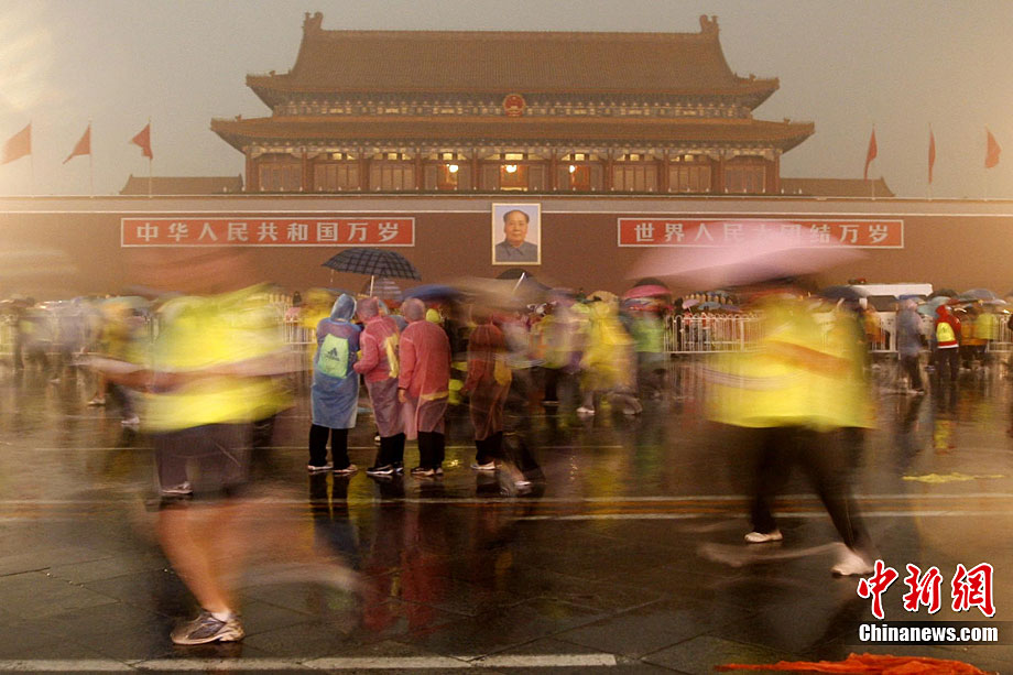 10月24日8时,2010年北京马拉松正式鸣枪,所有参赛运动员在淅淅沥沥的小雨中从天安门广场出发。今年的北京马拉松正式与国际接轨,与往年不同的特点是北京马拉松赛、全国马拉松锦标赛以及首都高校马拉松赛“三赛合一”,并采取一次发枪制,所有组别的选手都同时出发。中新社记者 富田 摄