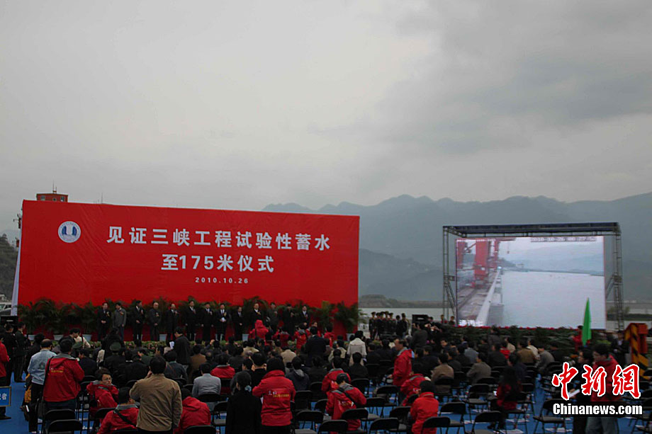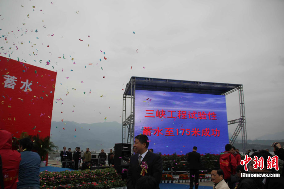 10月26日上午8时30分,在三峡大坝坝顶举行了“见证三峡工程试验性蓄水至175米仪式”,8时55分,中国长江三峡集团公司董事长曹广晶宣布,三峡工程首次达到175米正常蓄水位,这标志三峡工程由初期运行期转入正常运行期。刘良伟 摄