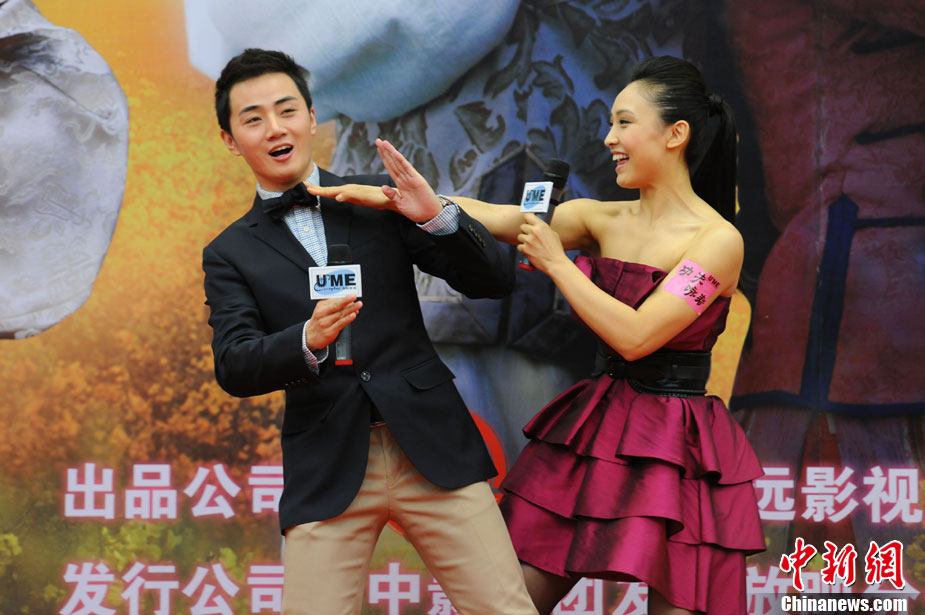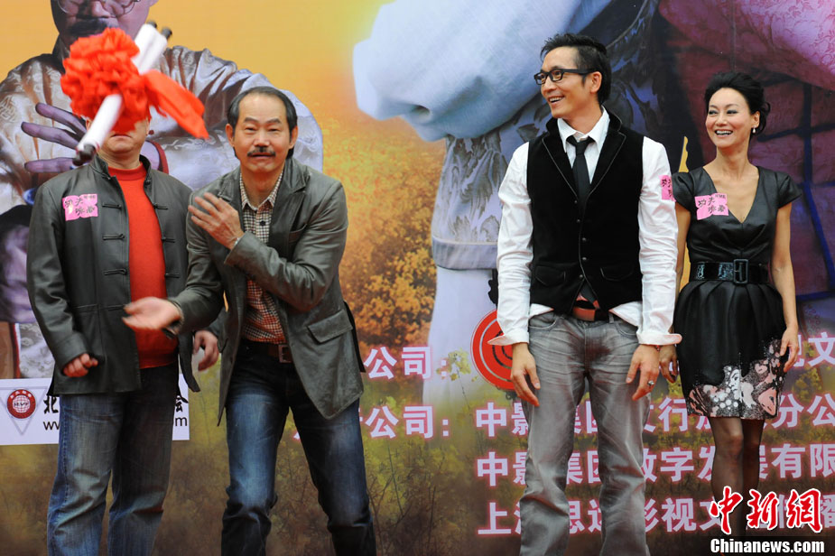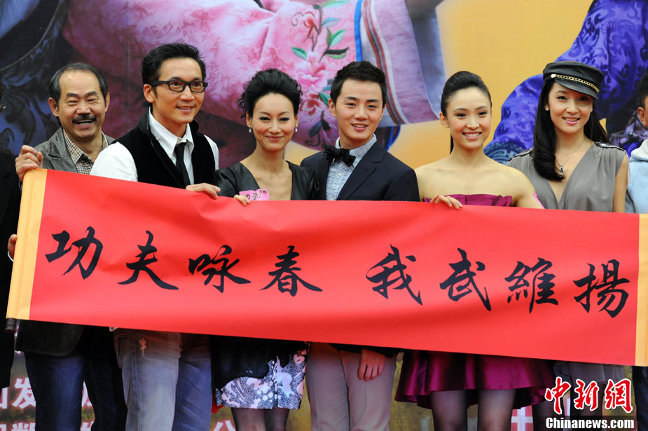 10月28日,“爱情动作片”《功夫咏春》在北京举行首映式,香港著名电影人吴思远先生,导演张同祖,白静、余少群、惠英红、邹兆龙、元华等众多明星莅临首映现场,片中饰演咏春的白静与“老公”余少群这一对新人王上台大秀“咏春”功夫,宣言“爱要打出来”。金像影后惠英红、反派天王邹兆龙及“包租公”元华到场助阵,三位老牌红星被主持人刘仪伟戏称为“功夫纵贯线”。《功夫咏春》将于11月2日上映。 中新社记者 李学仕 摄