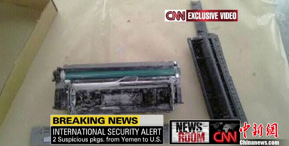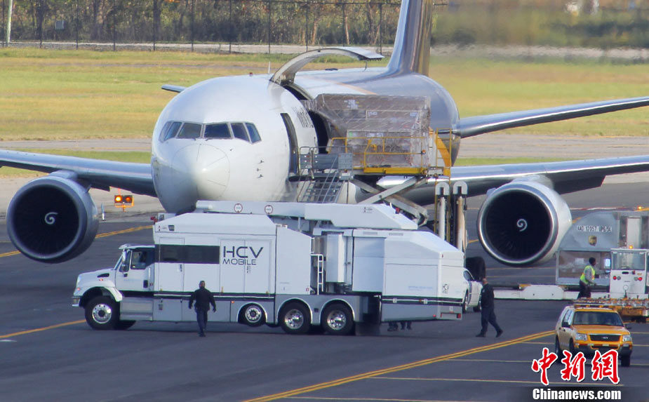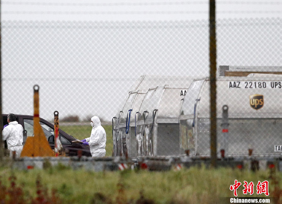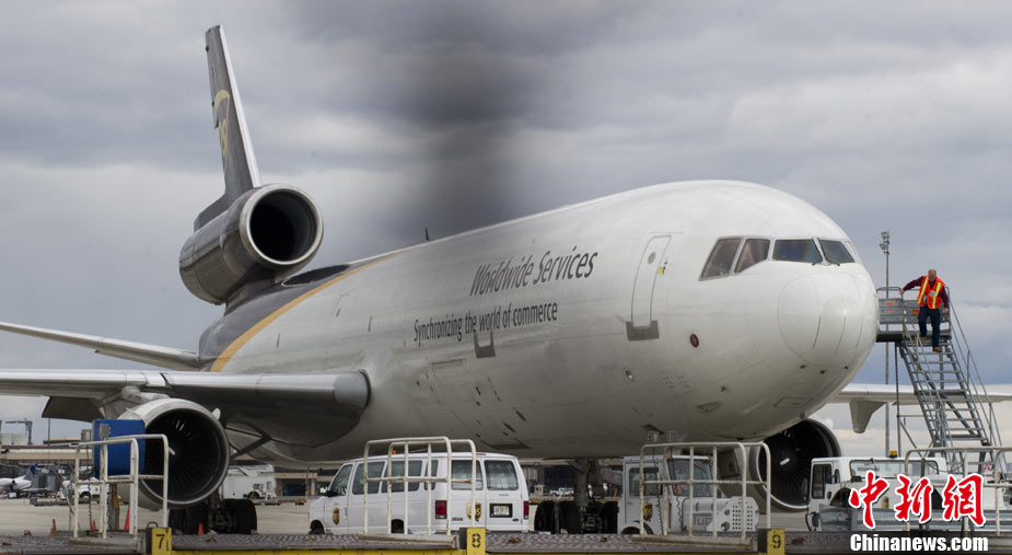 10月29日,一架从也门飞往美国的UPS货机在伦敦机场接受检查时,发现疑似爆炸物,随后奥巴马命令相关部门进行彻查,以确定此事背后是否还有更大恐怖袭击阴谋。 图为美国新泽西纽瓦克机场,一架美国联合包裹快递(UPS)公司货机停在停机坪上。